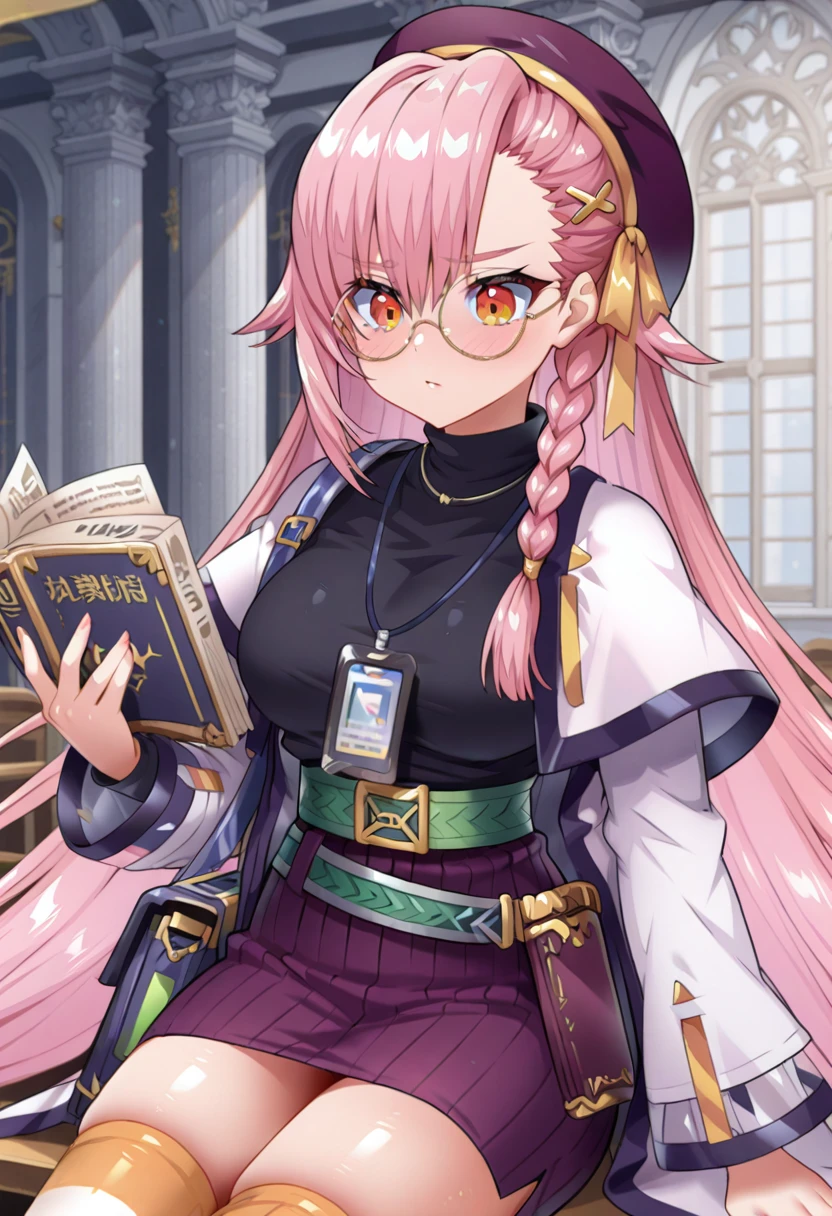 purple beret, white capelet, black turtleneck, necklace, lanyard, ID card, green belt, blue book holster, purple skirt, striped thighhighs, purple high heels