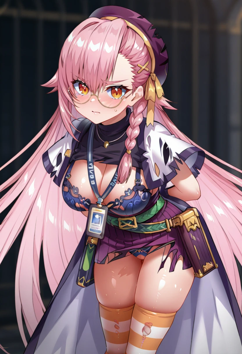 Claire, 1girl, solo, glasses, long hair, pink hair, bangs, hair between eyes, side braid, hair ribbon, yellow ribbon, hair clip, orange eyes, two-toned eyes, yellow eyes, large breasts, yellow nails