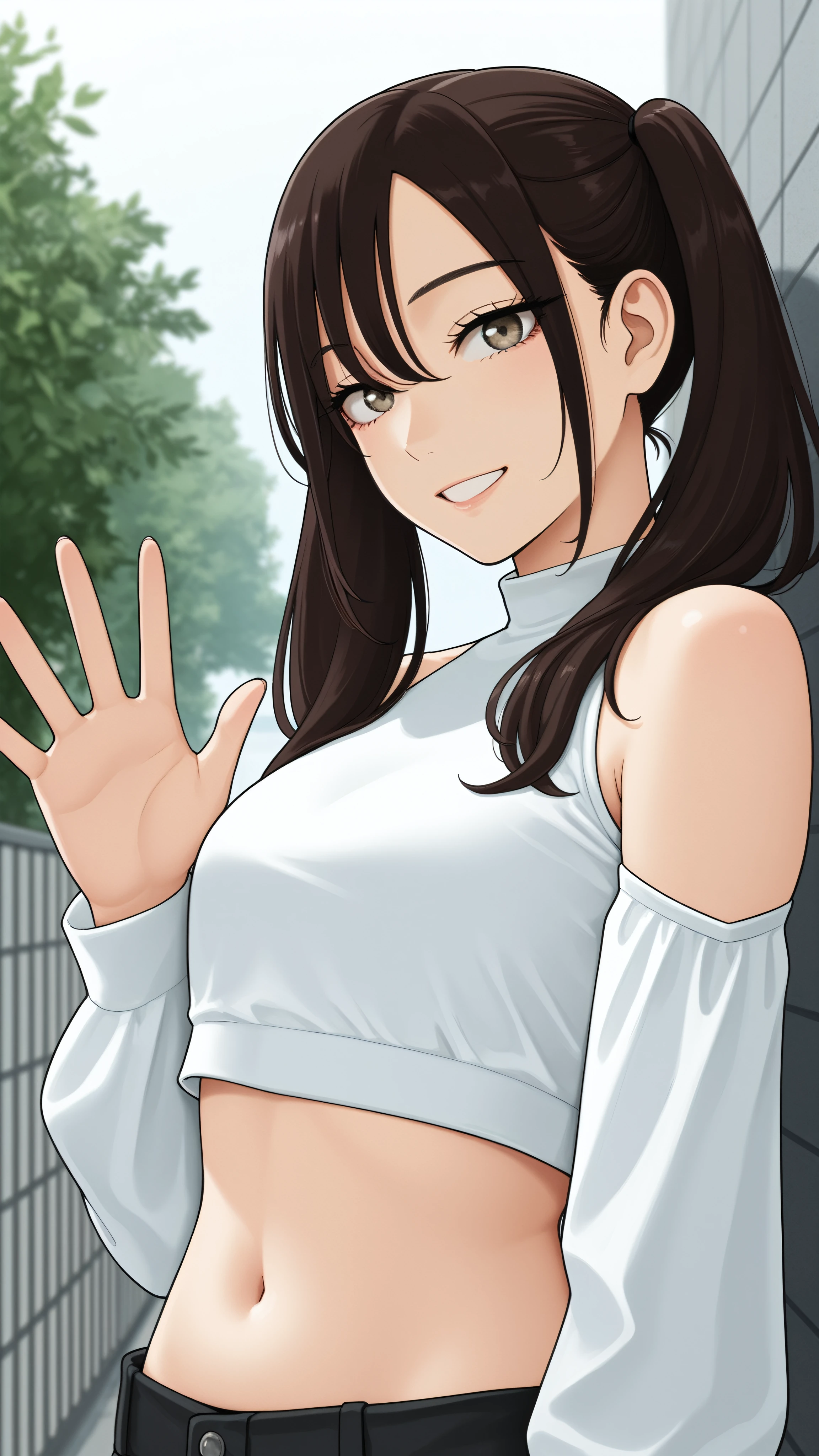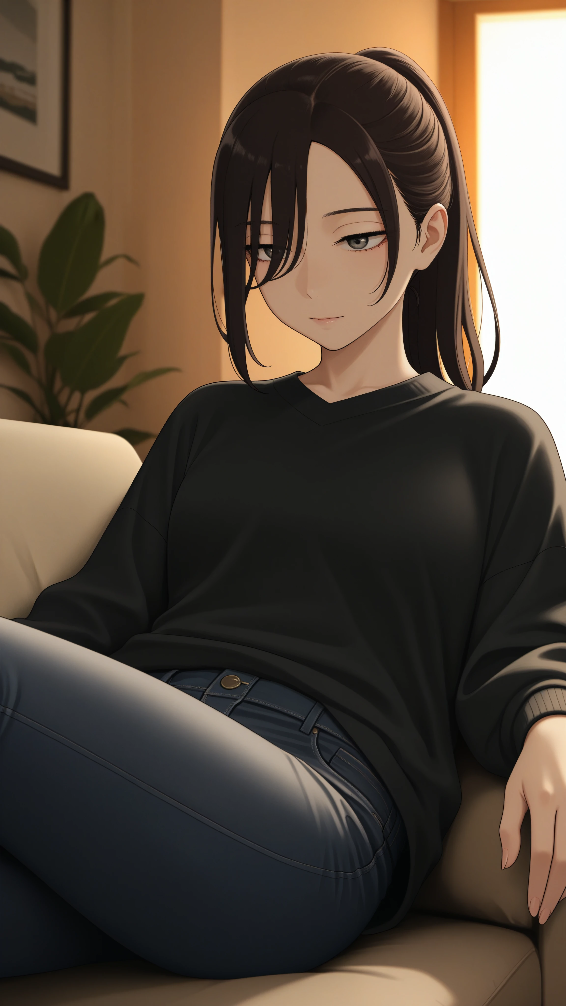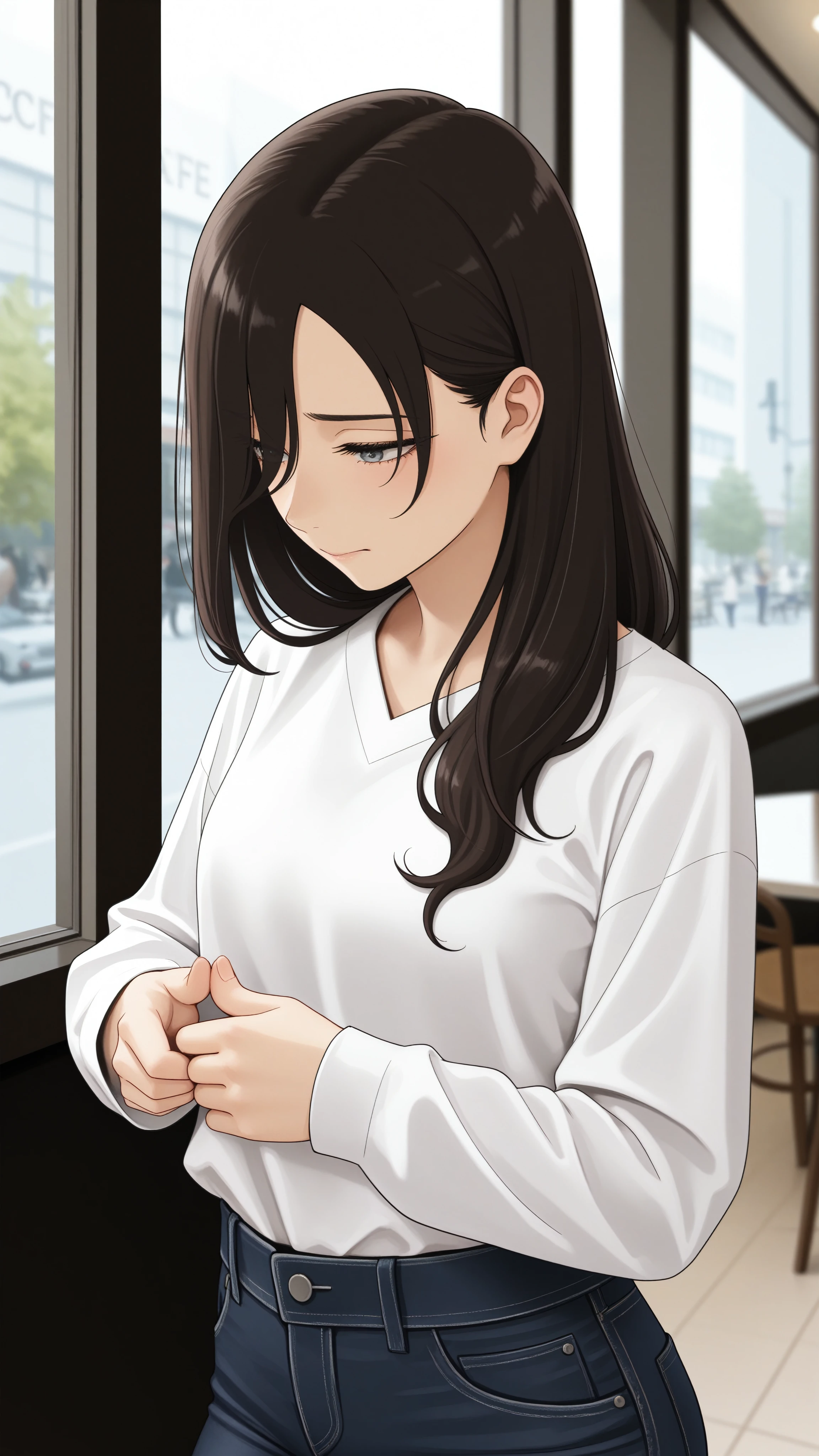akira_ogata, long hair, dark brown hair, hair covering face, grey eyes, white shirt, black jacket, dark red sleeves, long sleeves, multicolored sleeves, partially unzipped,akira_ogata, long hair, dark brown hair, hair covering face, grey eyes, white shirt, long sleeves, jeans,Description