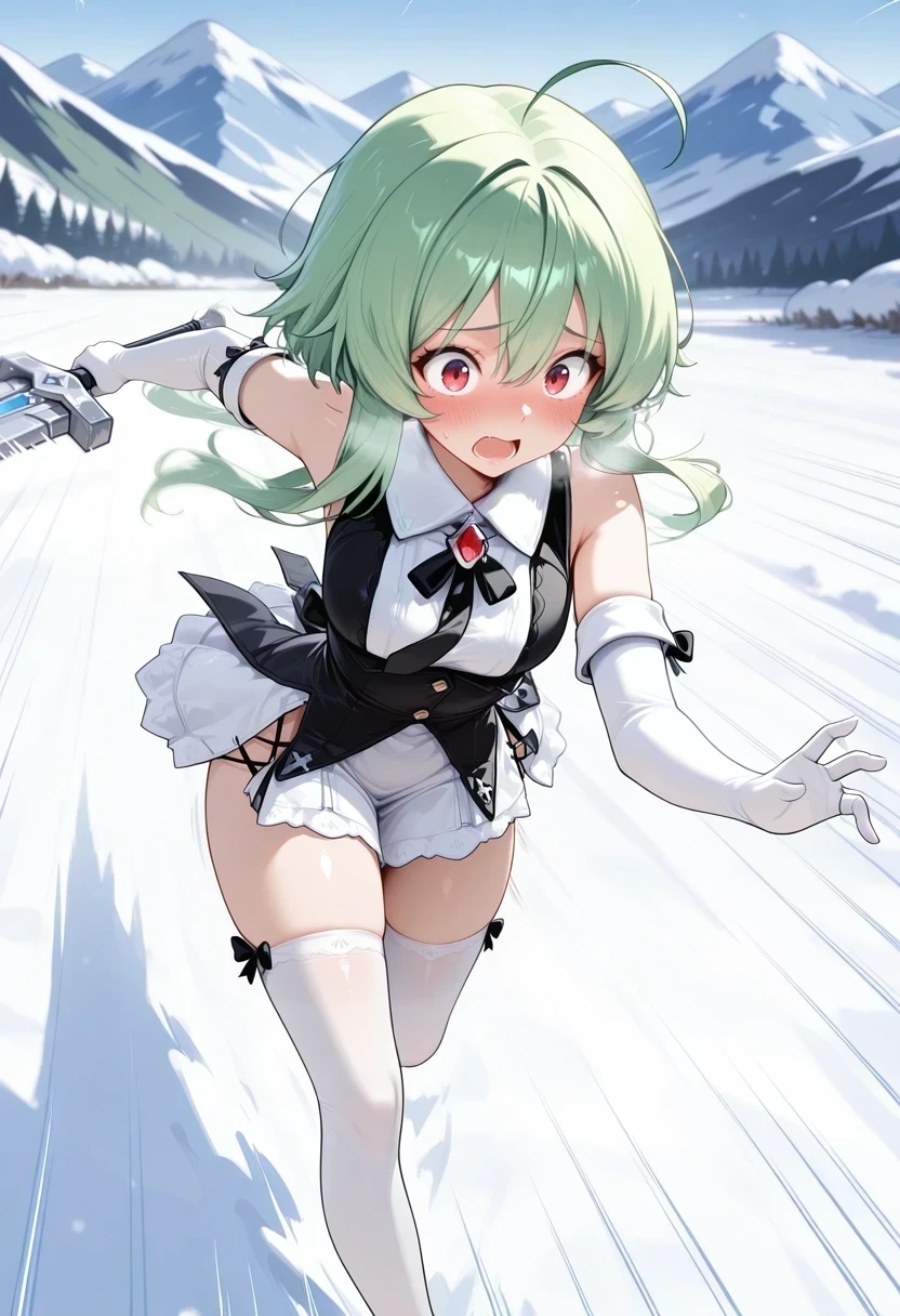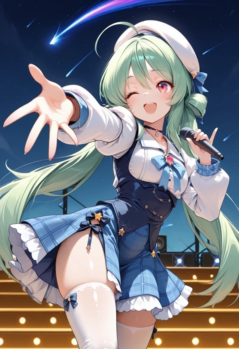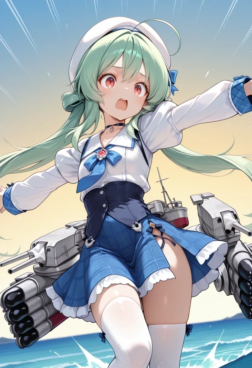 twintails,white hat,hat ribbon,side slit,choker,plaid skirt,blue skirt,frilled skirt,long sleeves,puffy sleeves,white thighhighs,