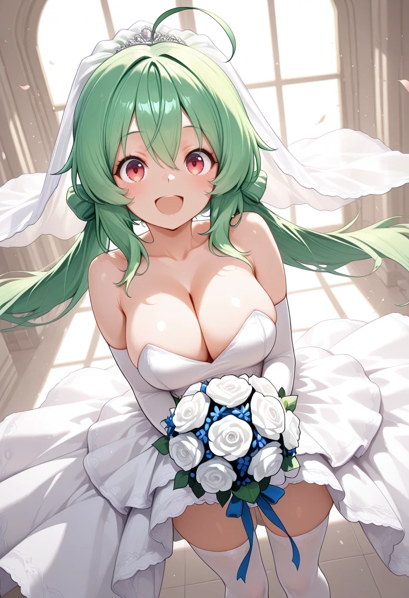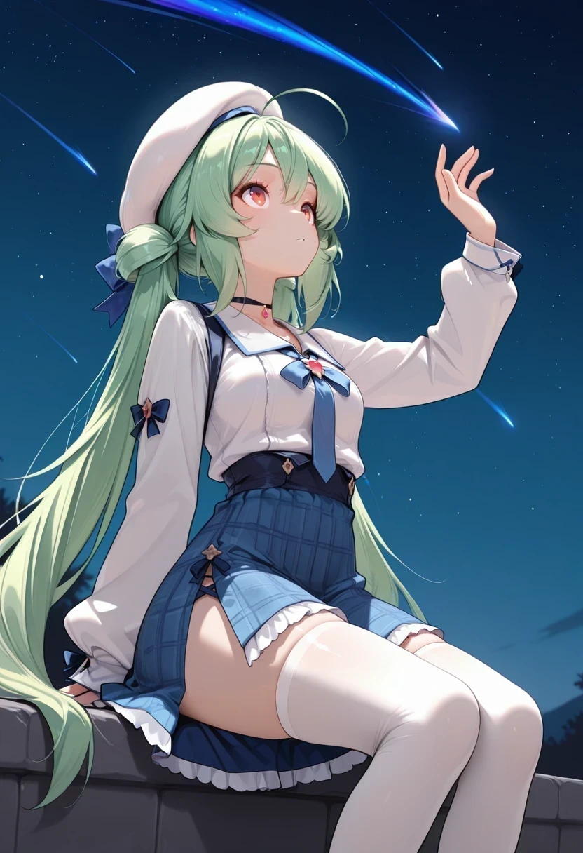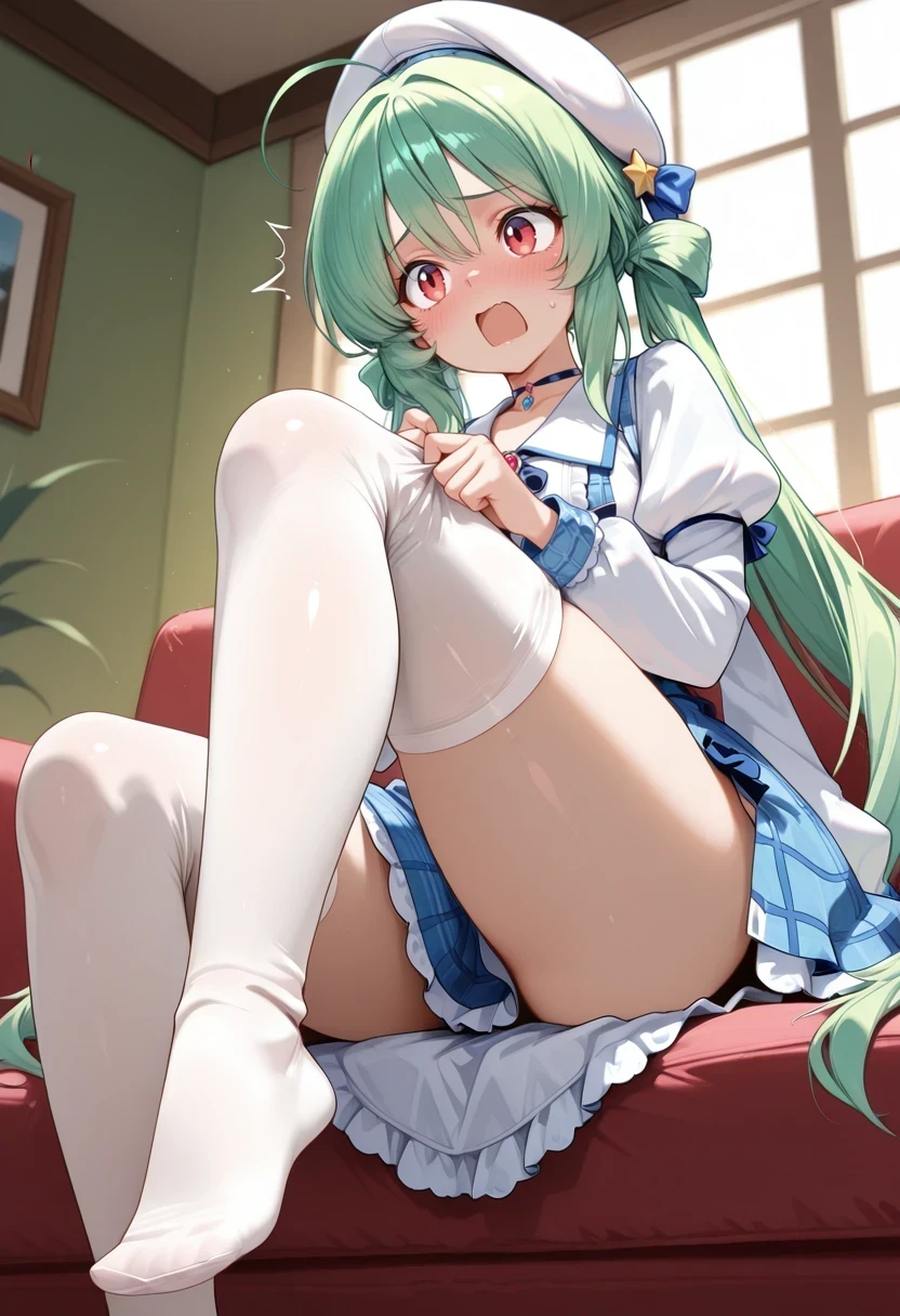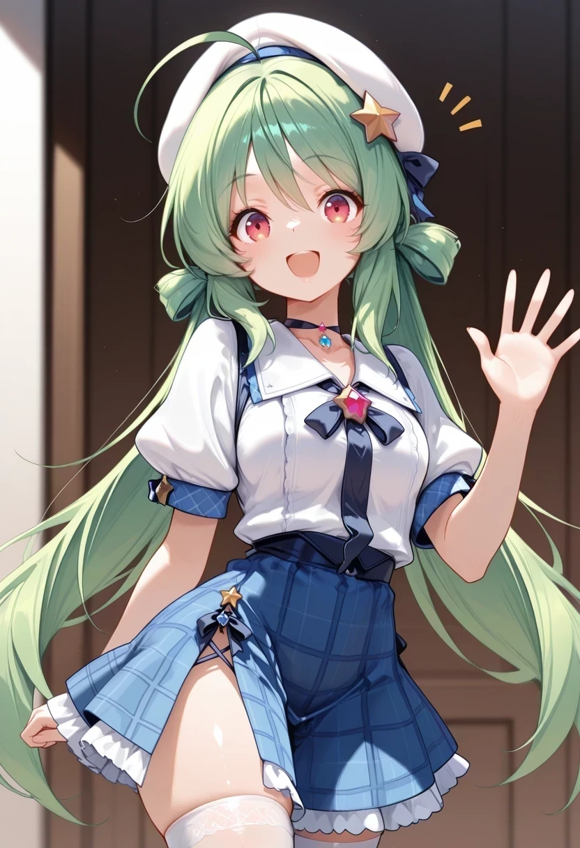 twintails,white hat,hat ribbon,side slit,choker,plaid skirt,blue skirt,frilled skirt,long sleeves,puffy sleeves,white thighhighs,Description