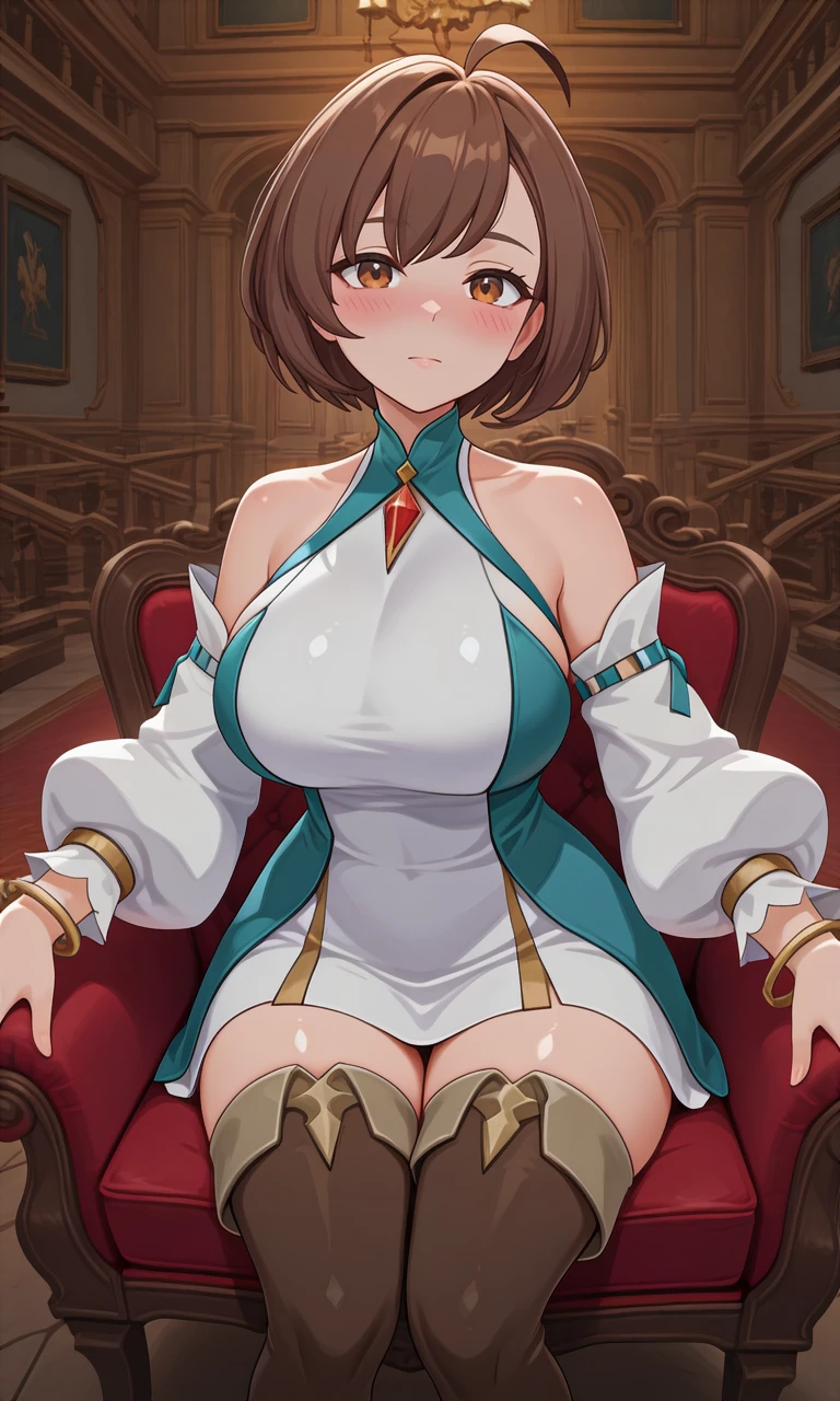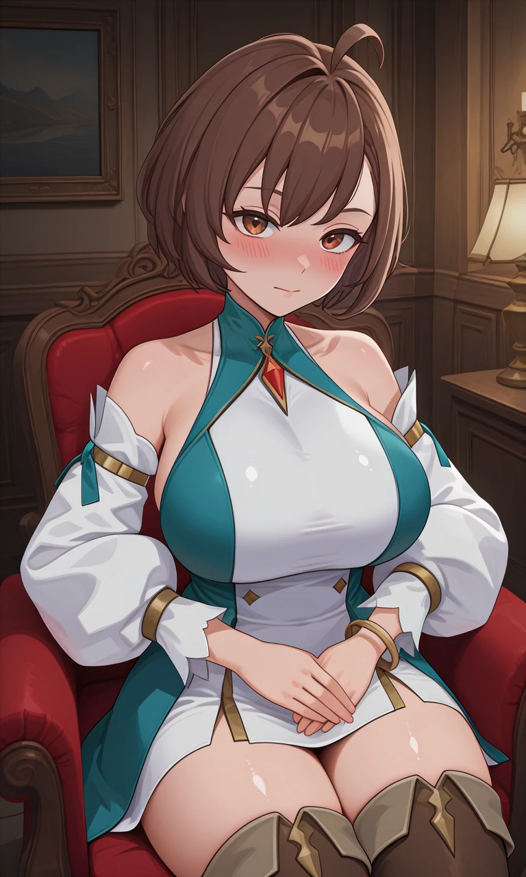 karin(seven knights), short hair, Brown hair, ahoge, Brown eyes, white dress, Mint dress, white sleeve protector, gold decorations, Brown thigh boots,
