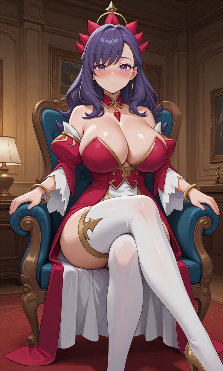 karin(seven knights), long hair, Purple hair, Purple eyes, headdress, white and Magenta dress, white and Magenta sleeve protector, gold decorations, white thighhigh, gold high heels,