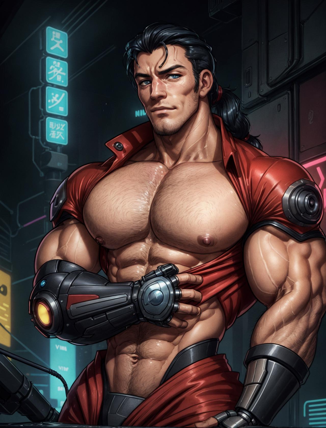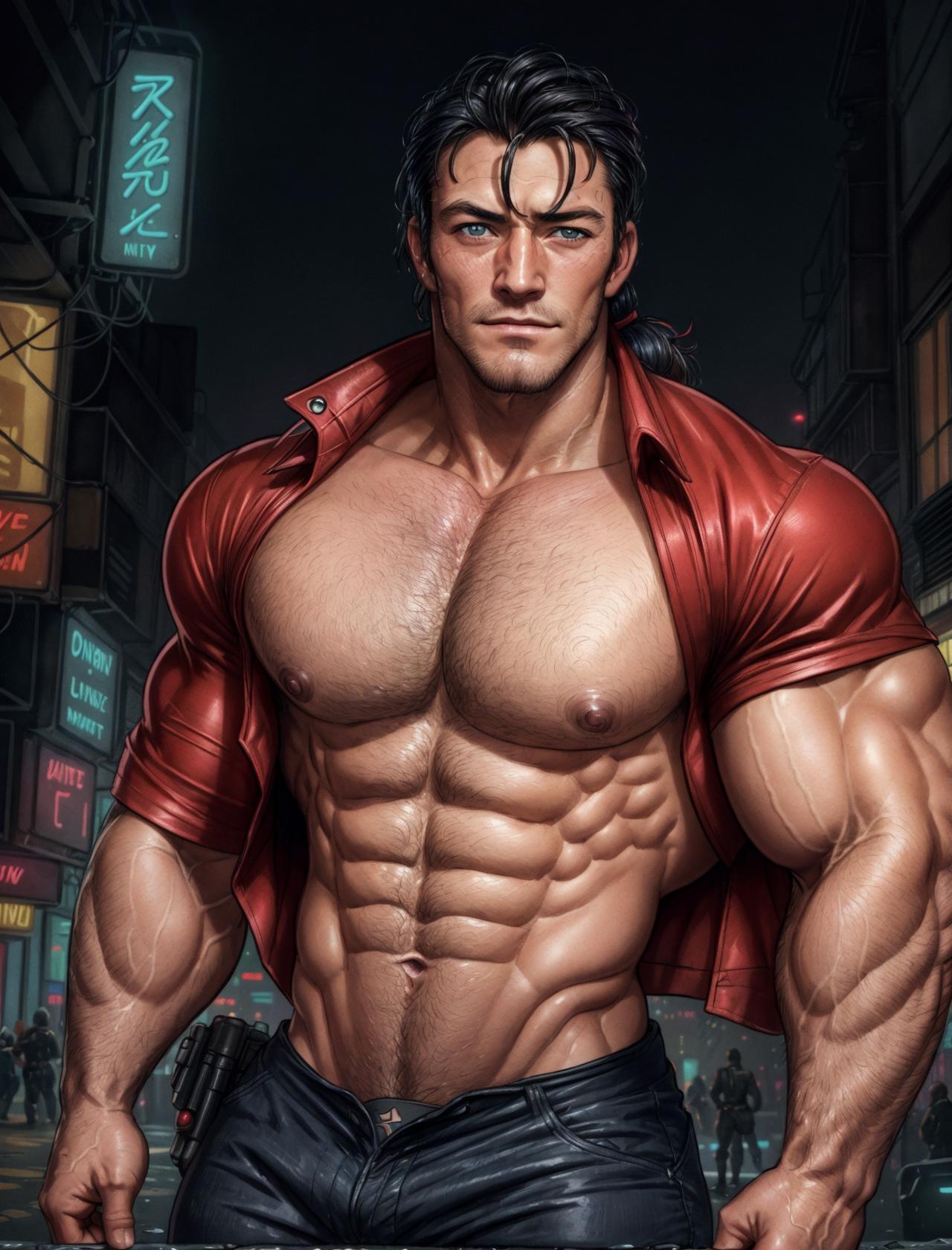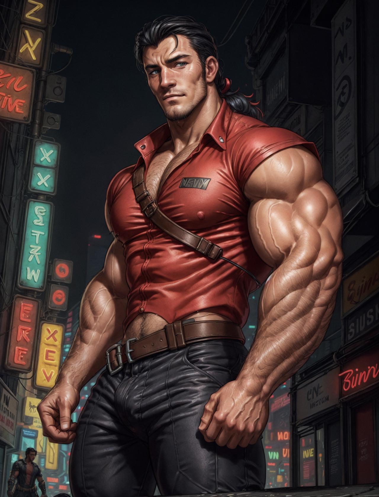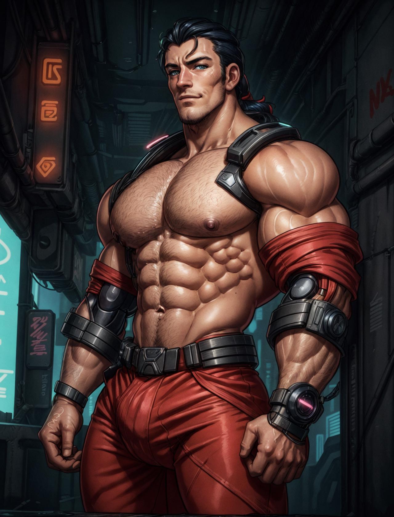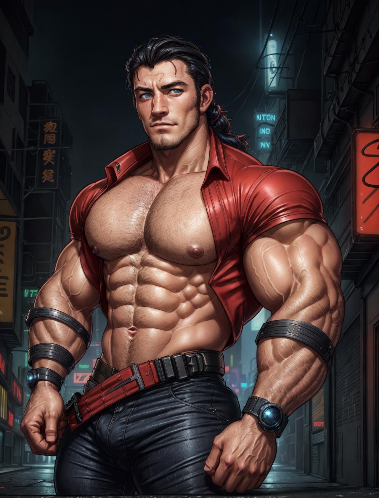 A good weight is around ~0.55 - 0.7. I suggest to put "muscular, blue eyes, black hair, pony tail, hairy", in the prompt to maximise the effect.
