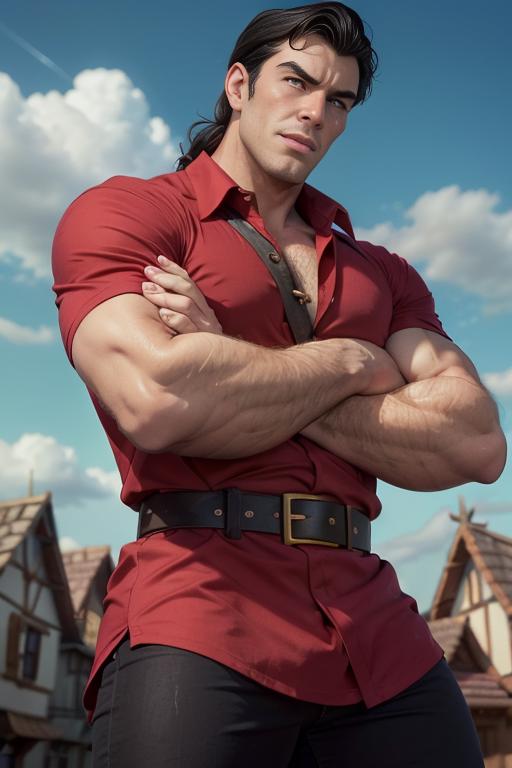 Gaston is arrogant, ignorant, violent and prepotent... but no one really cares when he flexes his huge biceps and shows his hairy pecs. Many girls want to lay with him but Gaston has only eyes for Belle. Unfortunately for him, Belle is intelligent enough to avoid him.