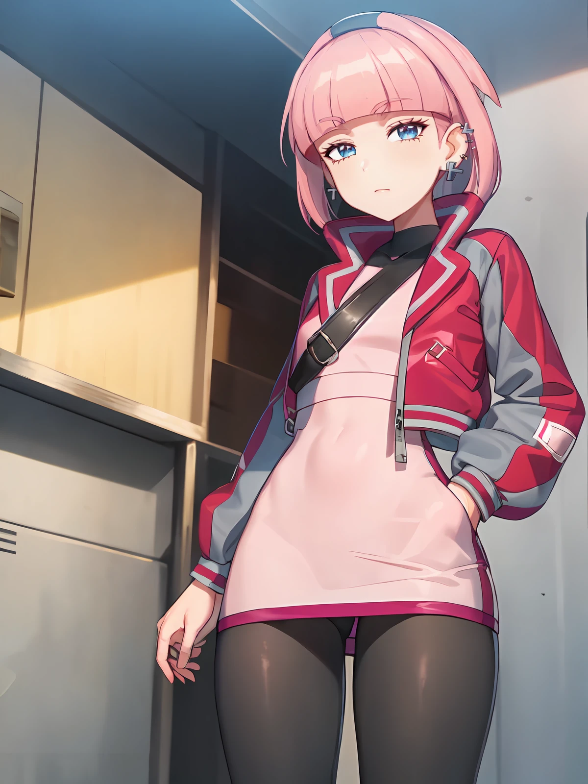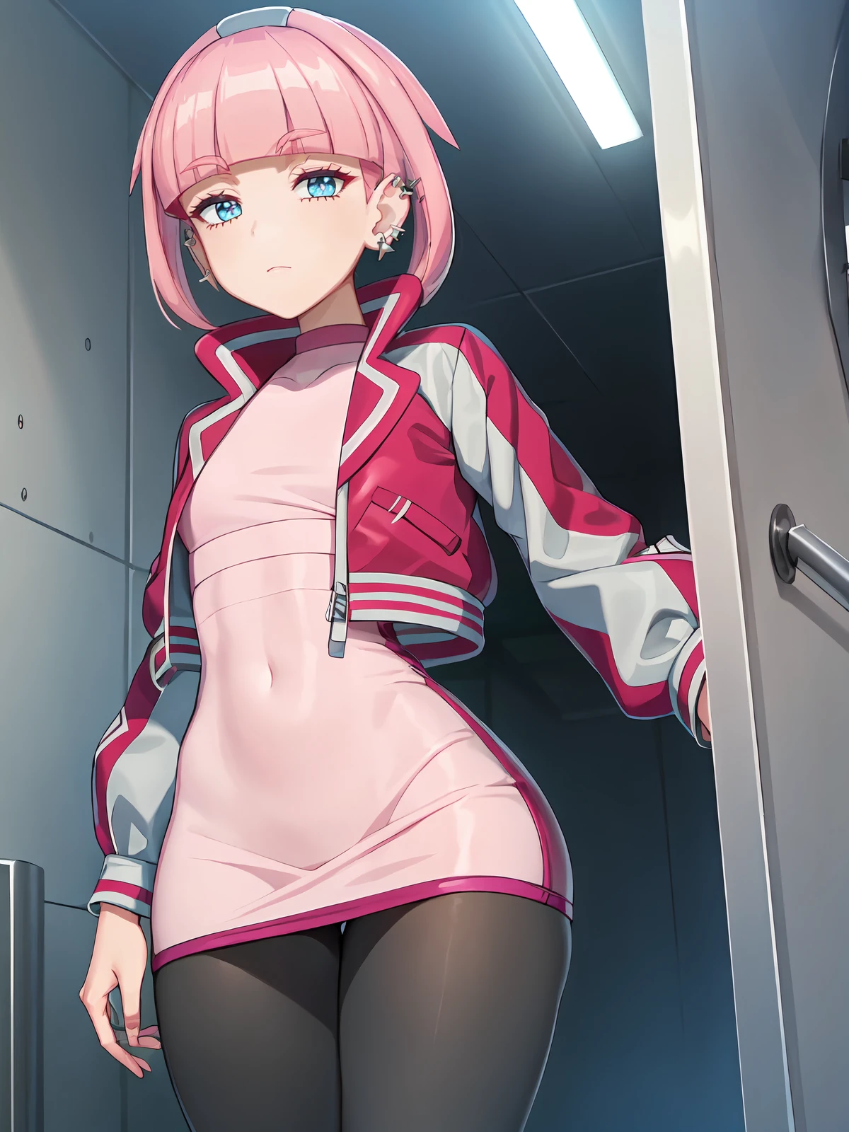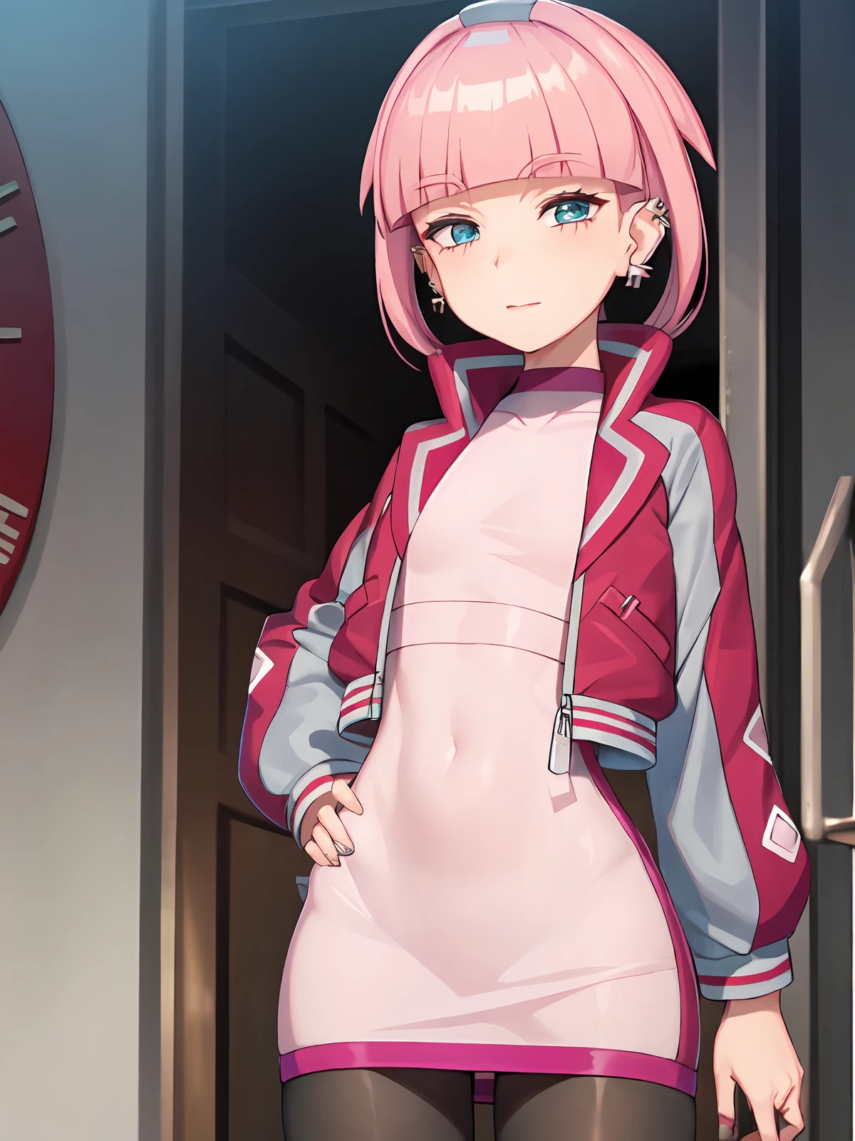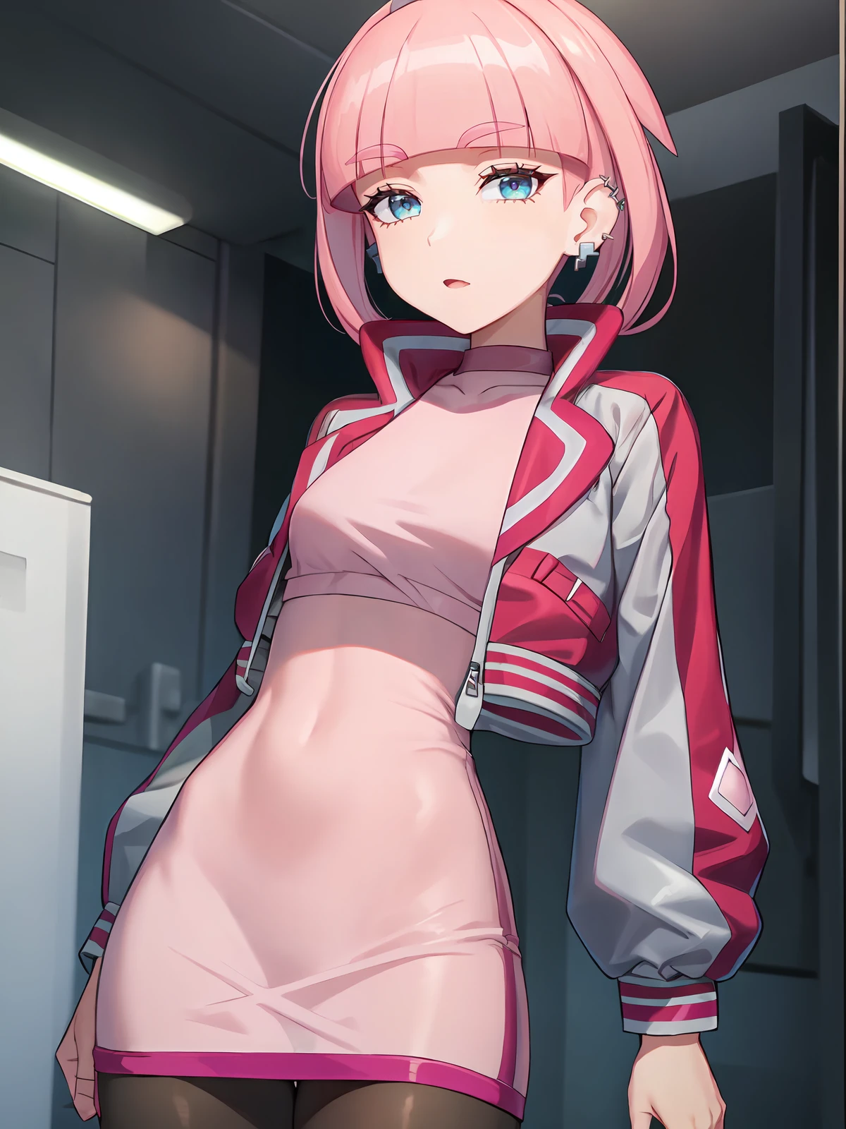 Prompts: jacket, pink hair, bangs, blunt bangs, earrings, jewelry, pantyhose, blue eyes, short hair, piercing, open jacket, long sleeves, black pantyhose, open clothes, ear piercing, skirt, pink jacket, hairband,pink dress,