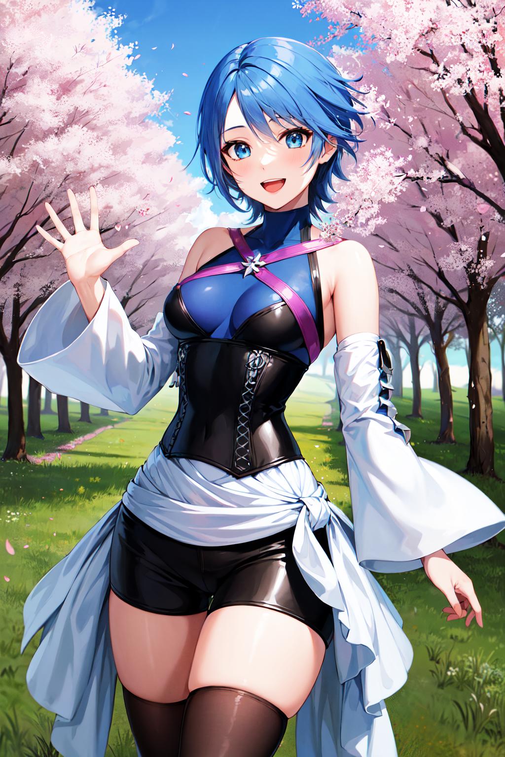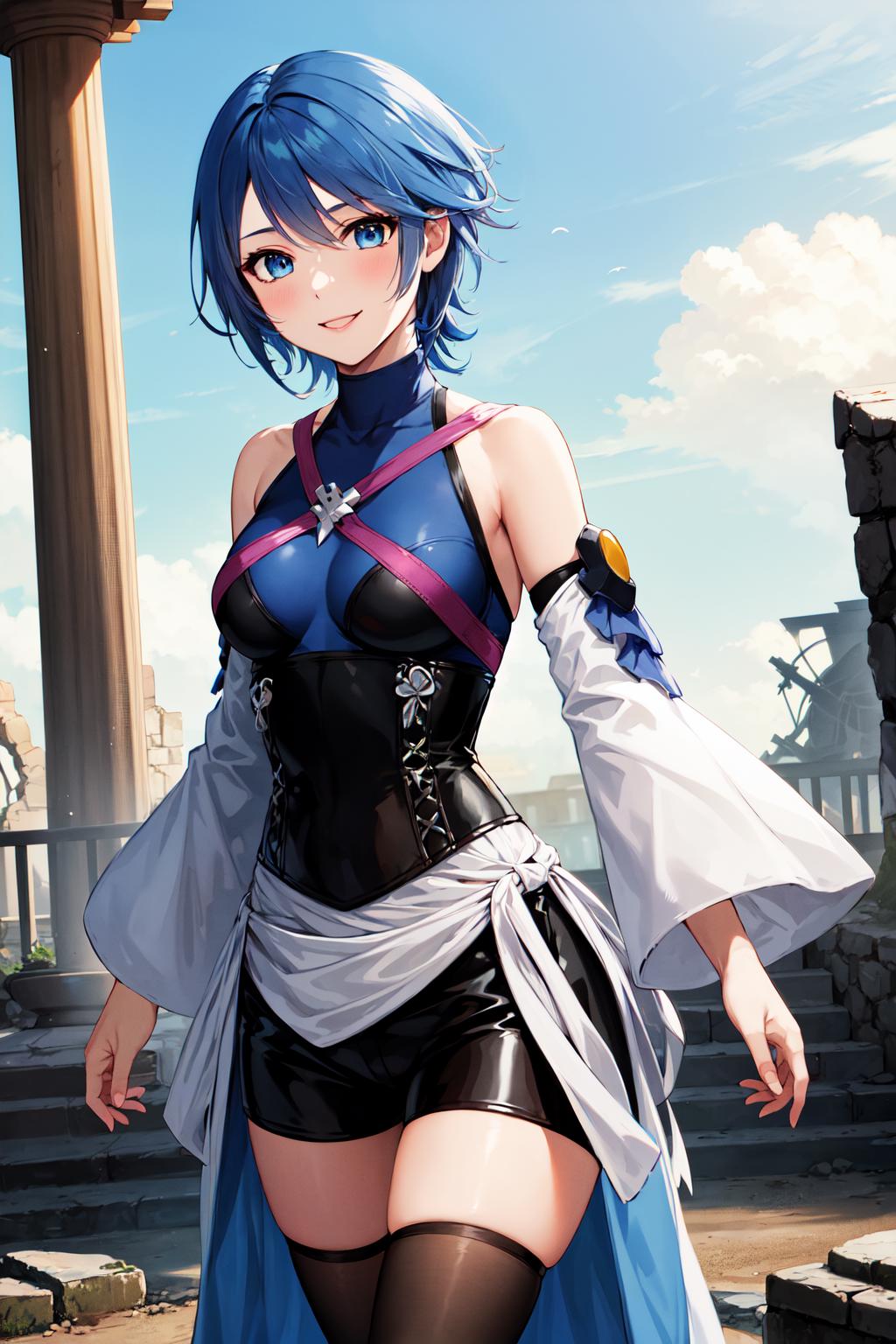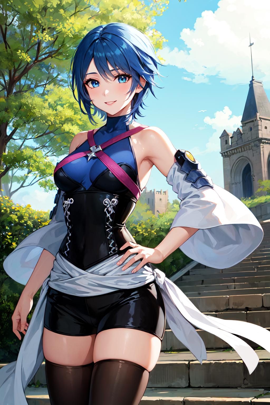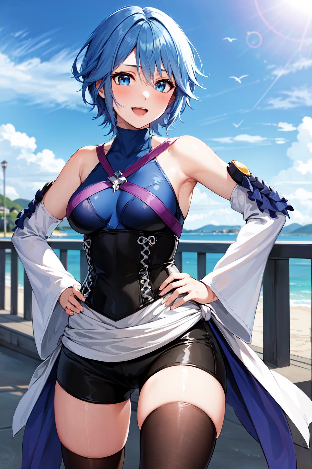 aaaqua, short hair, blue hair, blue eyes, medium breasts, turtleneck, harness, blue shirt, detached sleeves, corset, black shorts, waist cape, black thighhighs