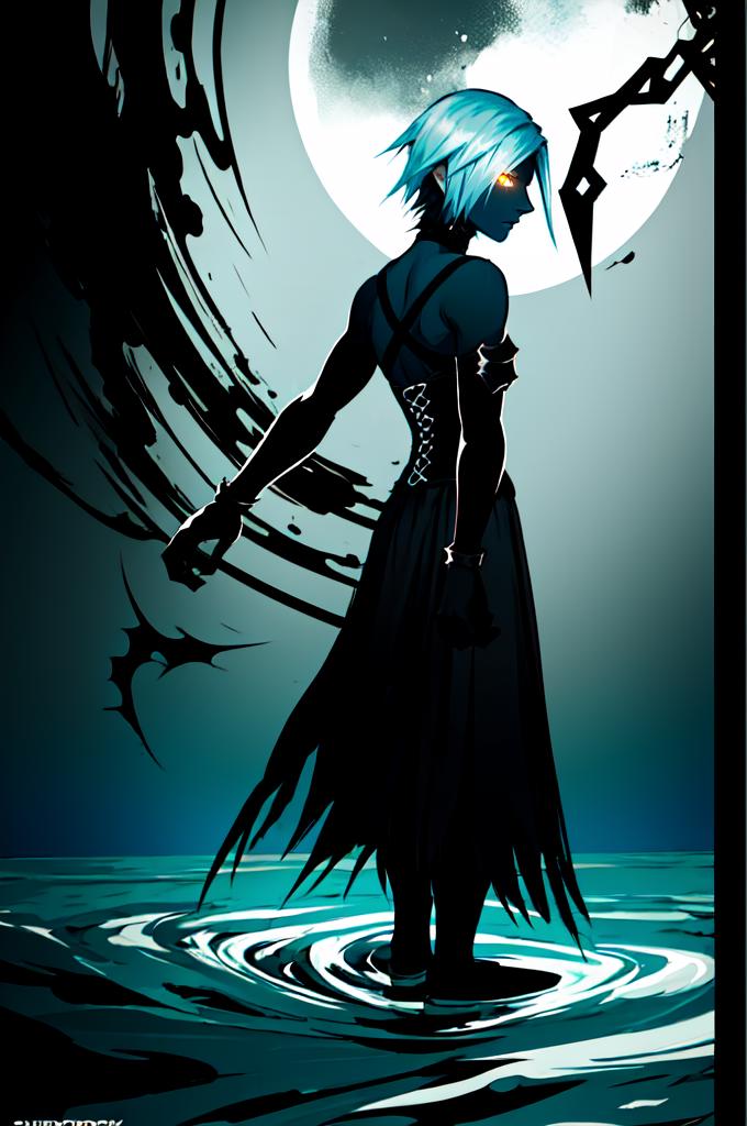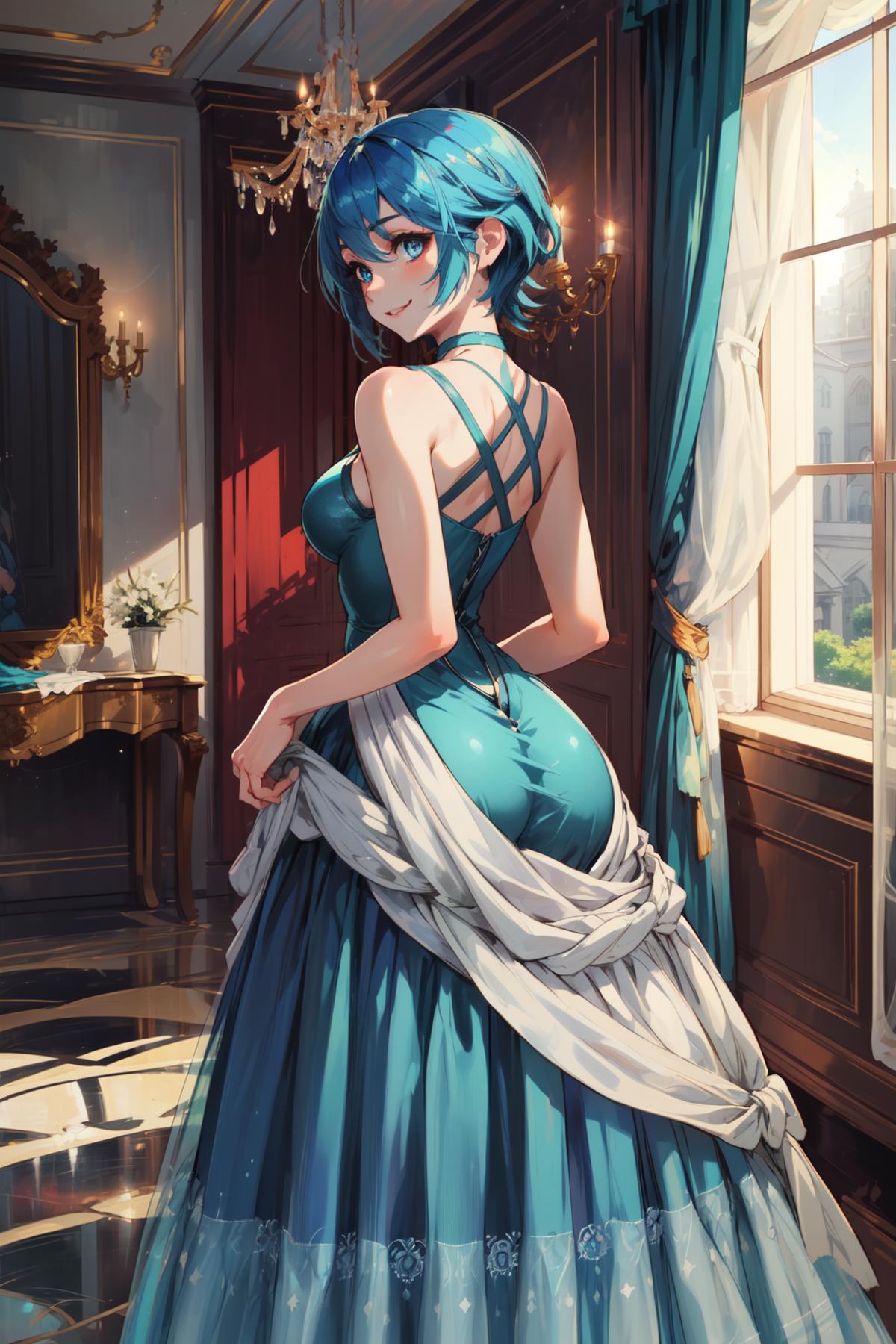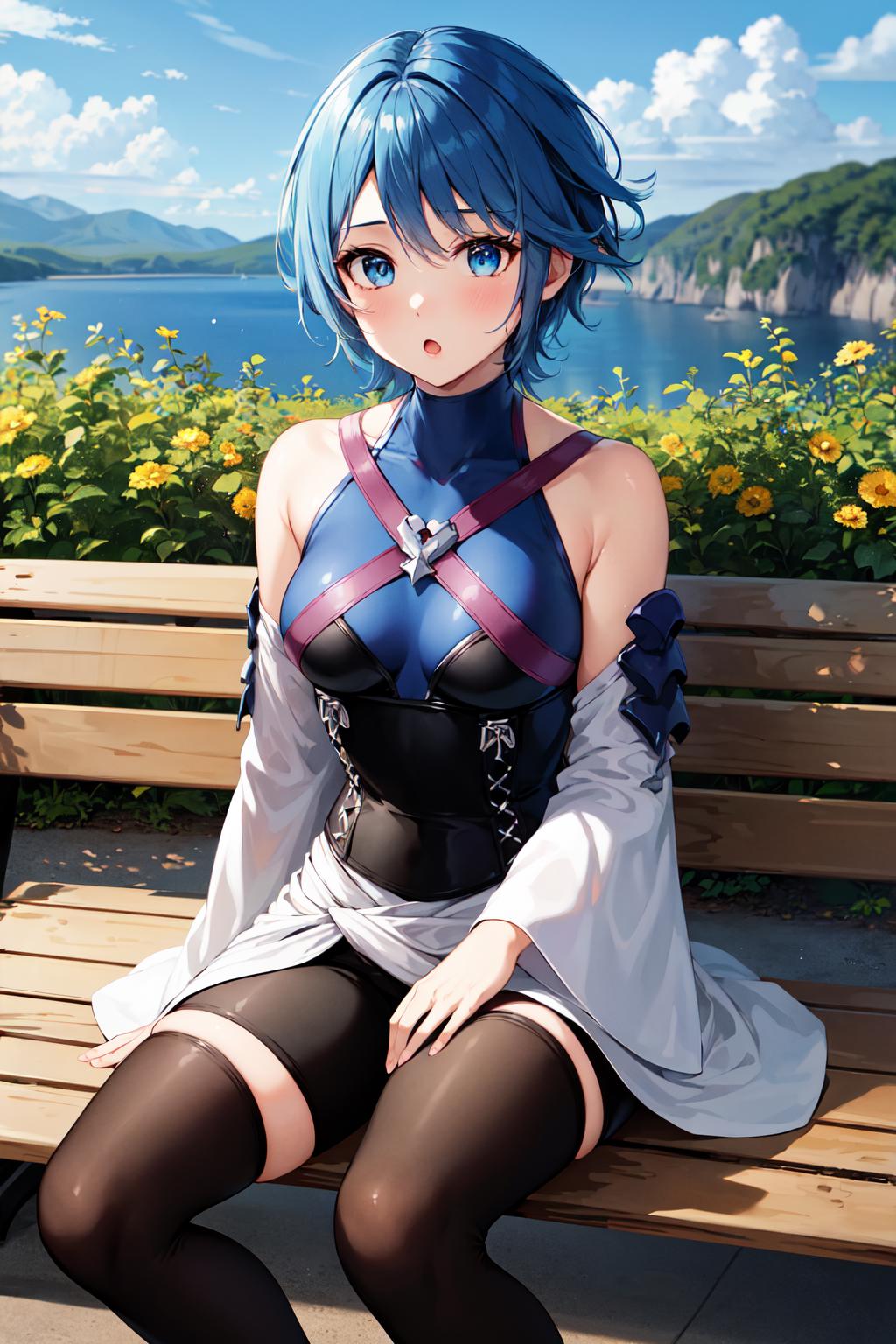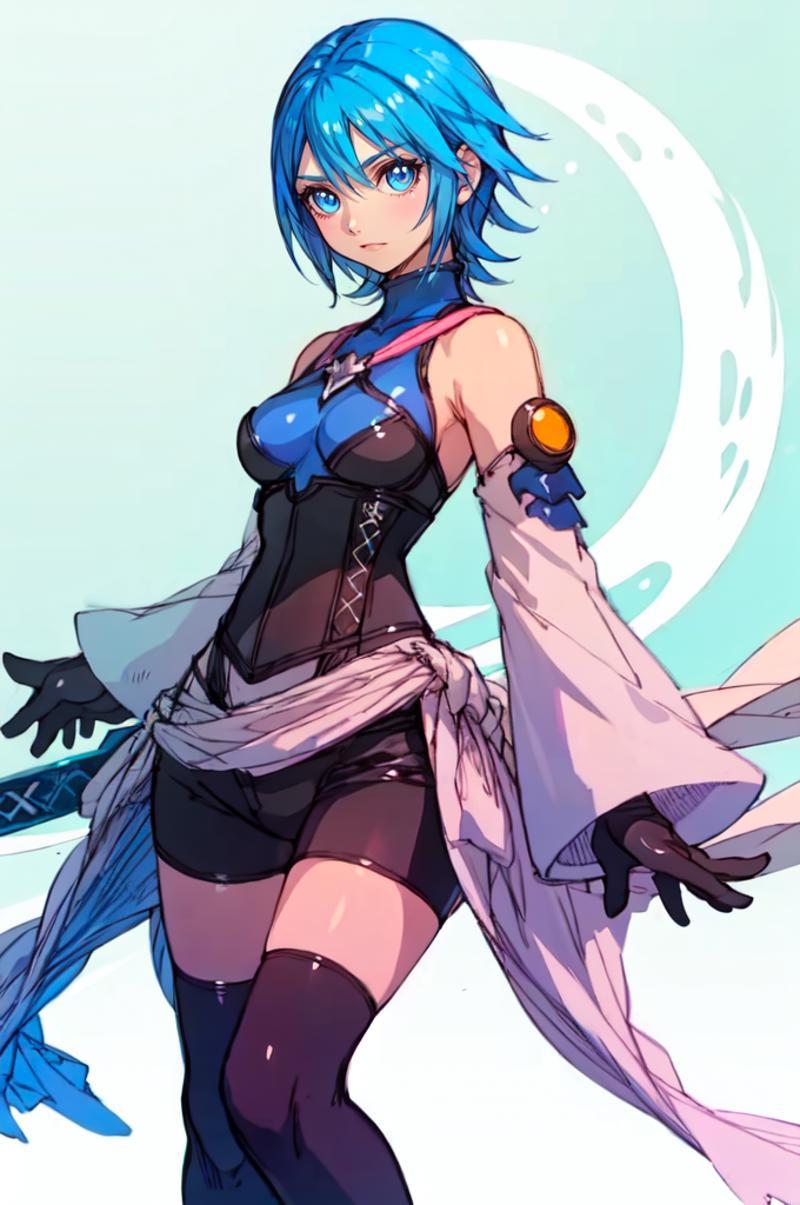 aaaqua, short hair, blue hair, blue eyes, medium breasts, turtleneck, harness, blue shirt, detached sleeves, corset, black shorts, waist cape, black thighhighs