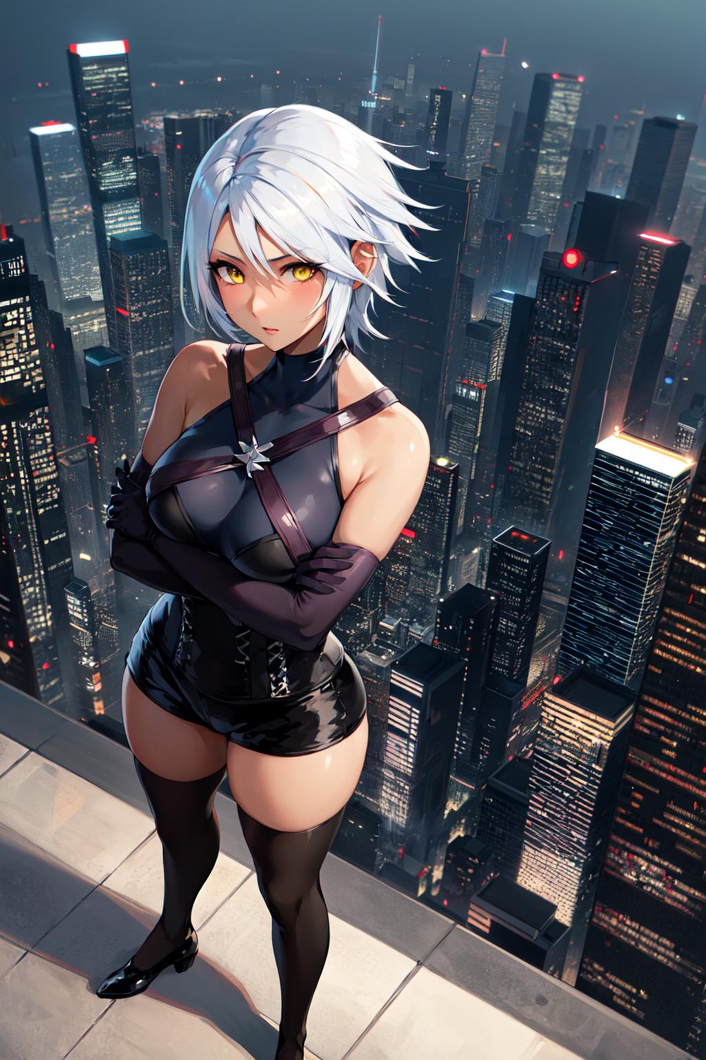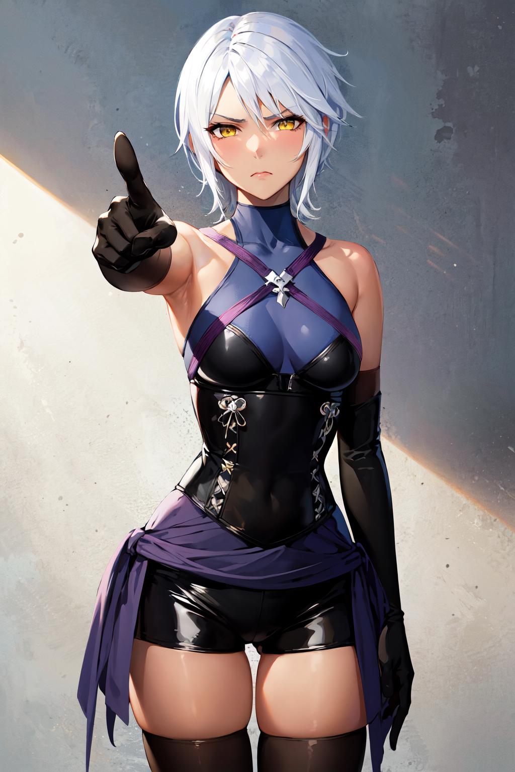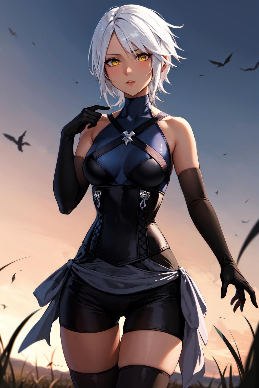 outfit2bbaqua, short hair, white hair, yellow eyes, medium breasts, dark skin, bare shoulders, black shirt, harness, corset, elbow gloves, black gloves, black shorts, black thighhighs