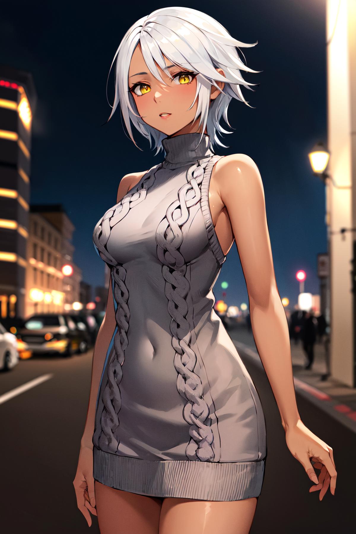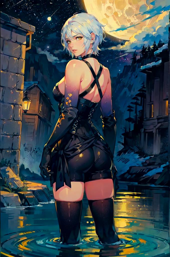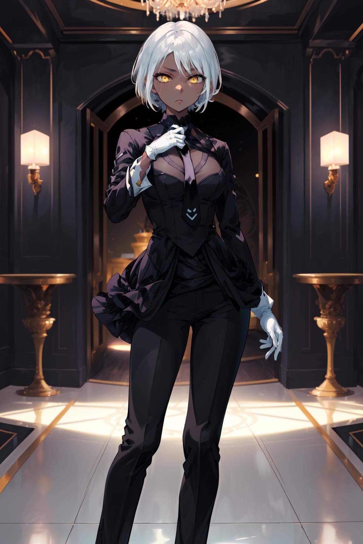 outfit2bbaqua, short hair, white hair, yellow eyes, medium breasts, dark skin, bare shoulders, black shirt, harness, corset, elbow gloves, black gloves, black shorts, black thighhighs