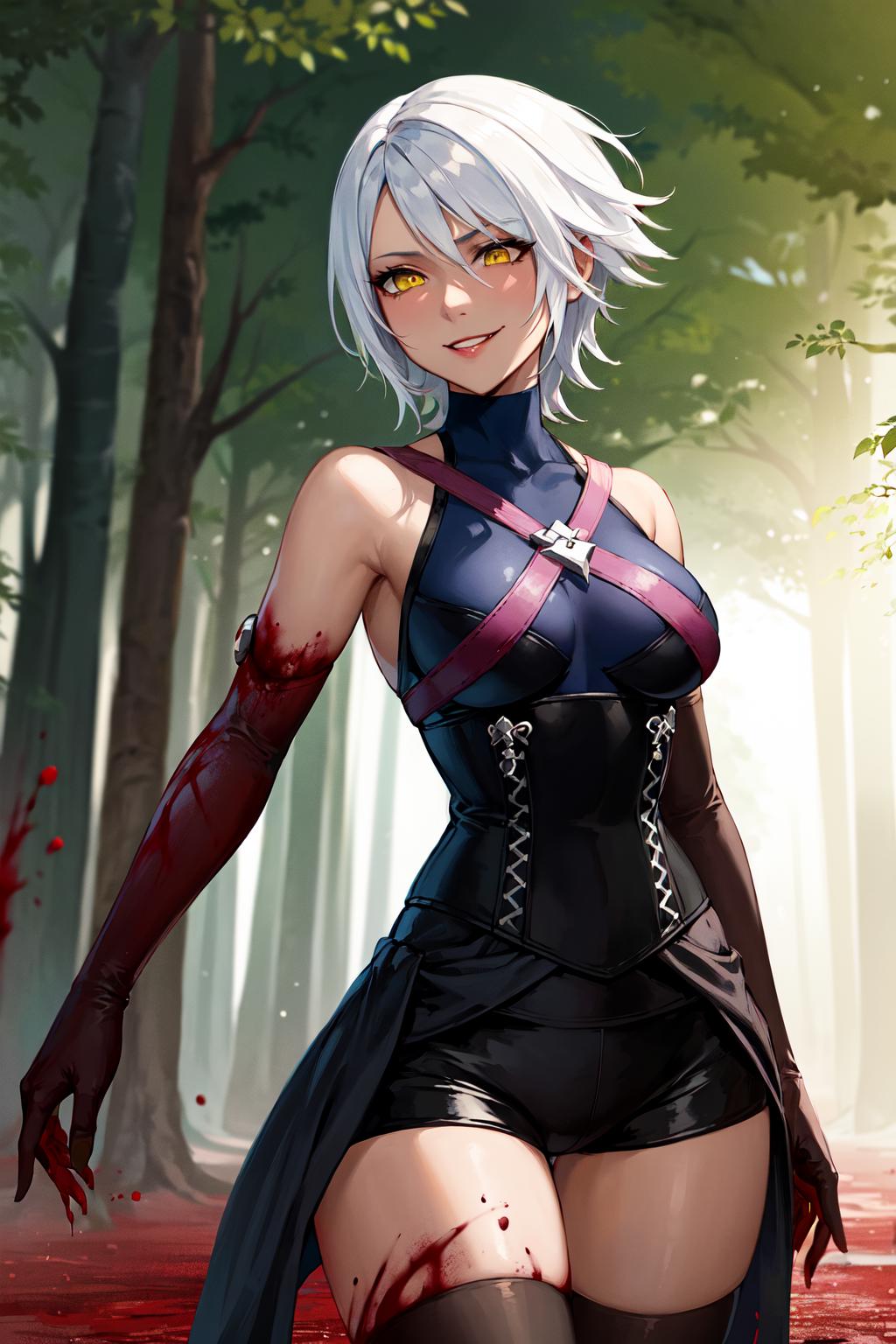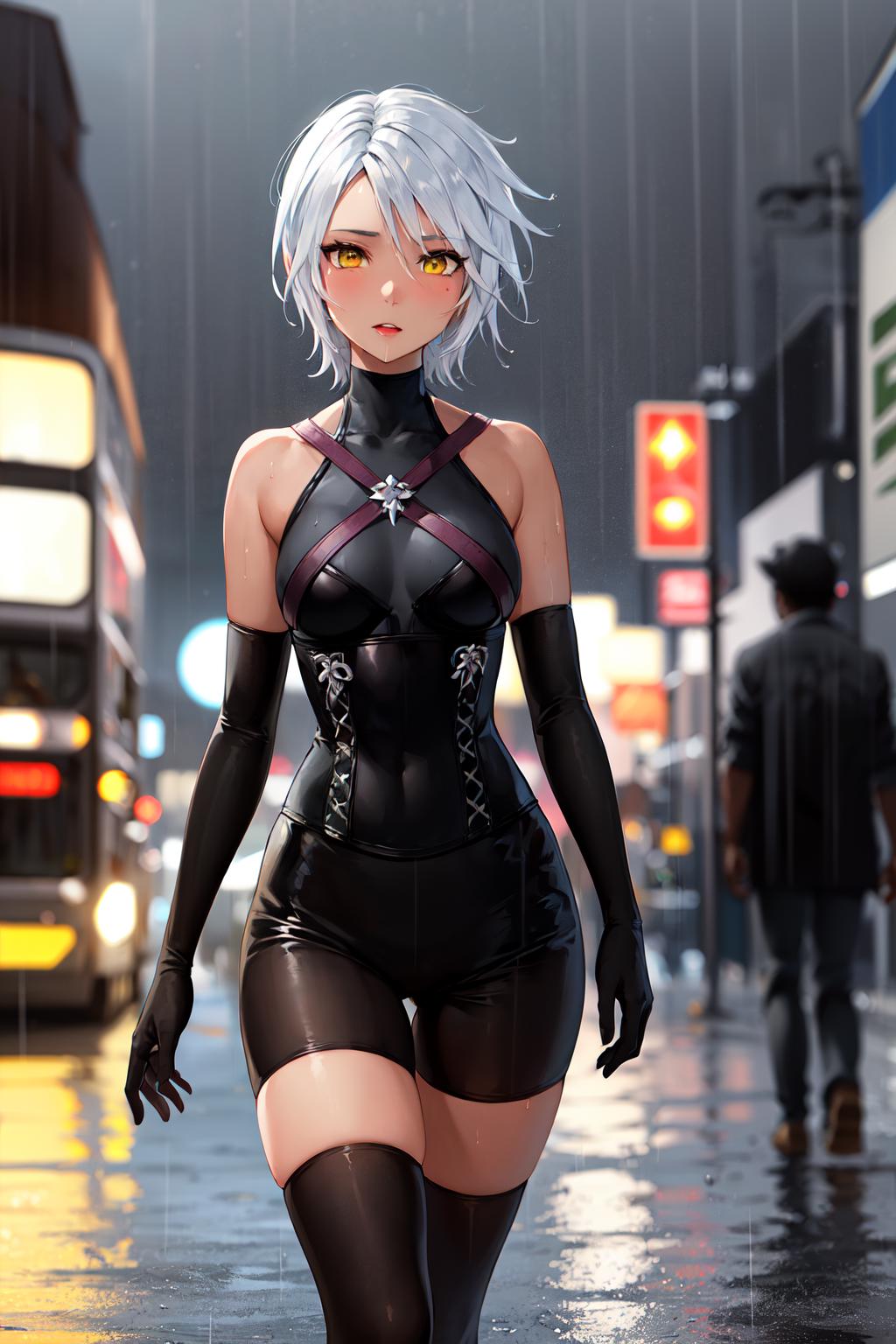 bbaqua, short hair, white hair, yellow eyes, medium breasts, dark skin, bare shoulders, black shirt, harness, corset, elbow gloves, black gloves, black shorts, black thighhighs