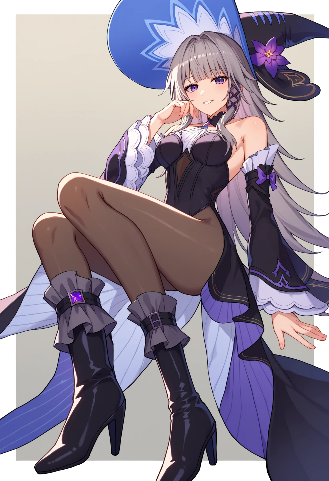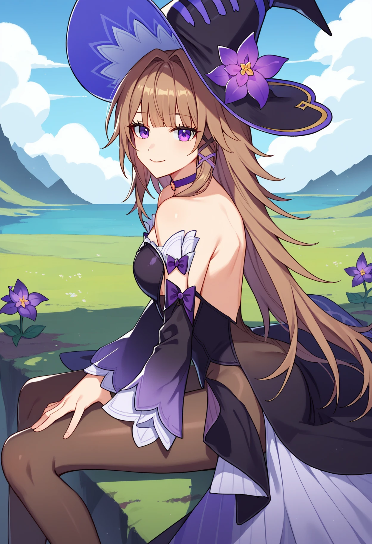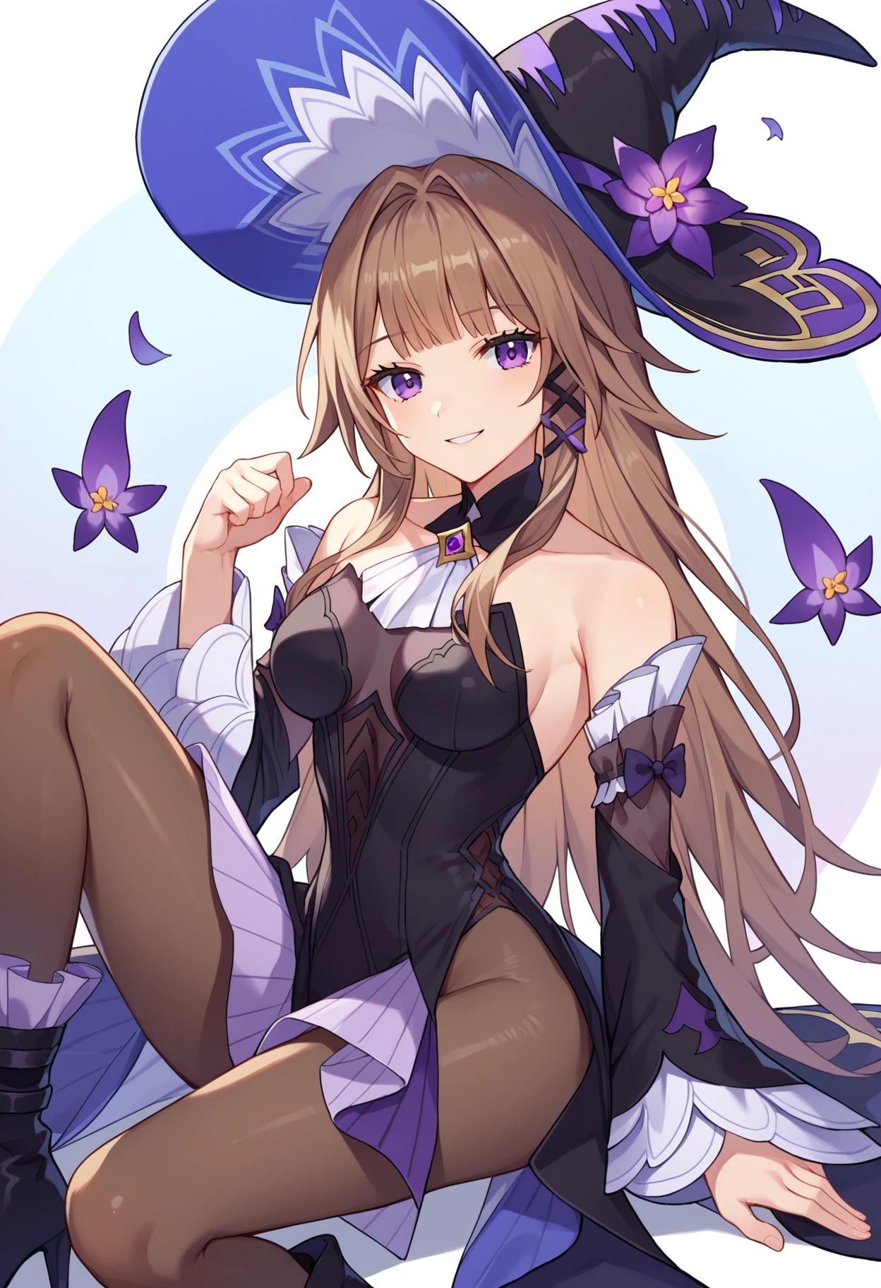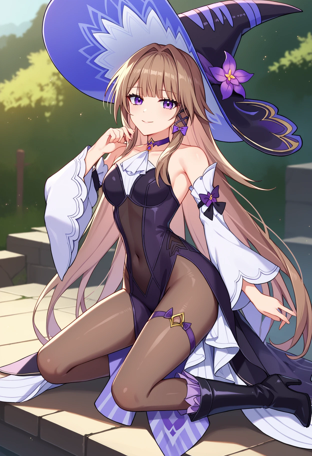 shibigherta, long hair, purple eyes, brown hair, purple choker, hair intakes, witch, witch hat, hat flower, black headwear, purple flower, black dress, long sleeves, bare shoulders, detached sleeves, sleeveless, black pantyhose, high heel boots,
