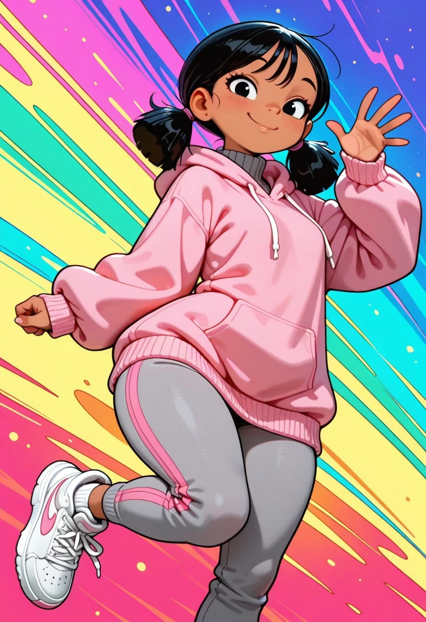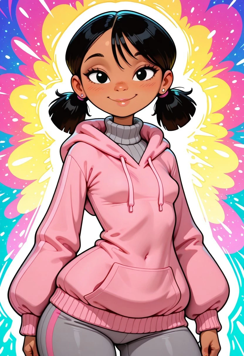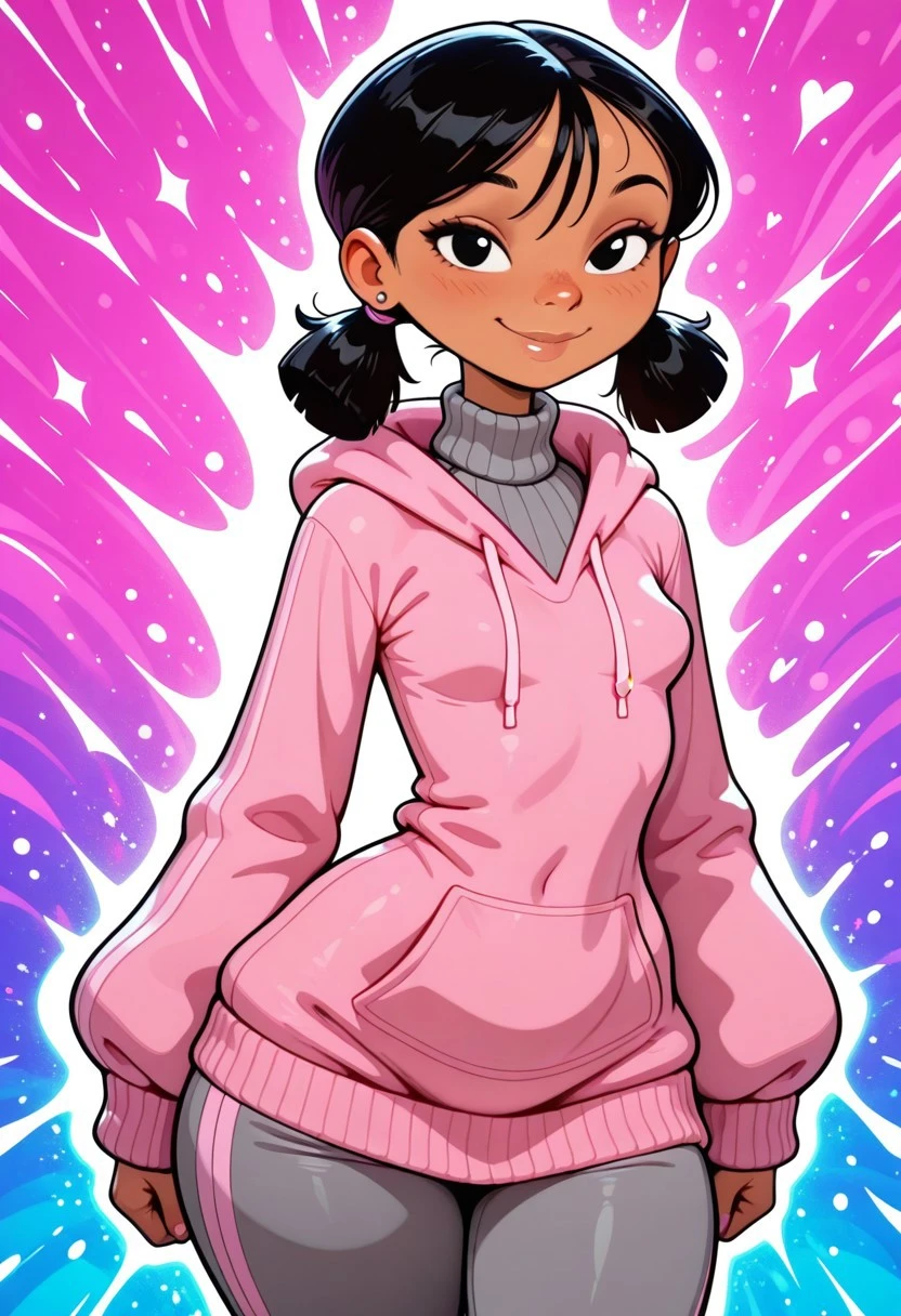 pink hoodie, oversized hoodie, grey turtleneck sweater, grey sweatpants with pink stripes, white sneakers,