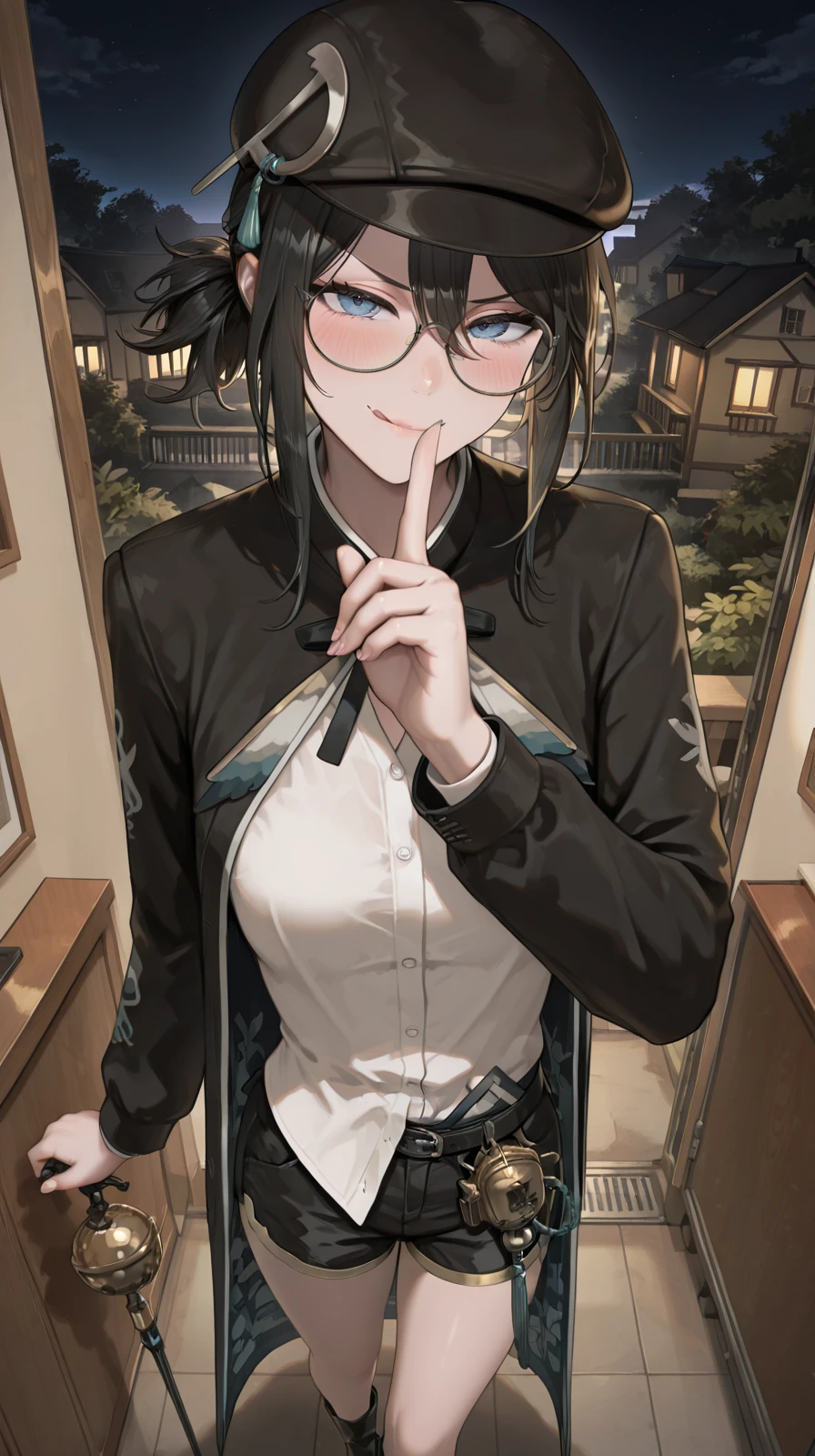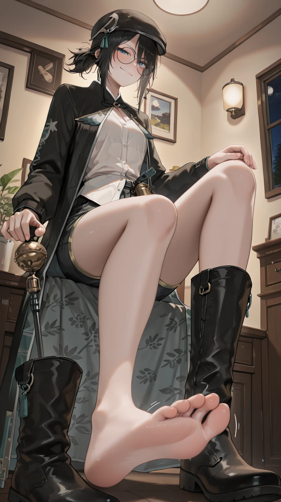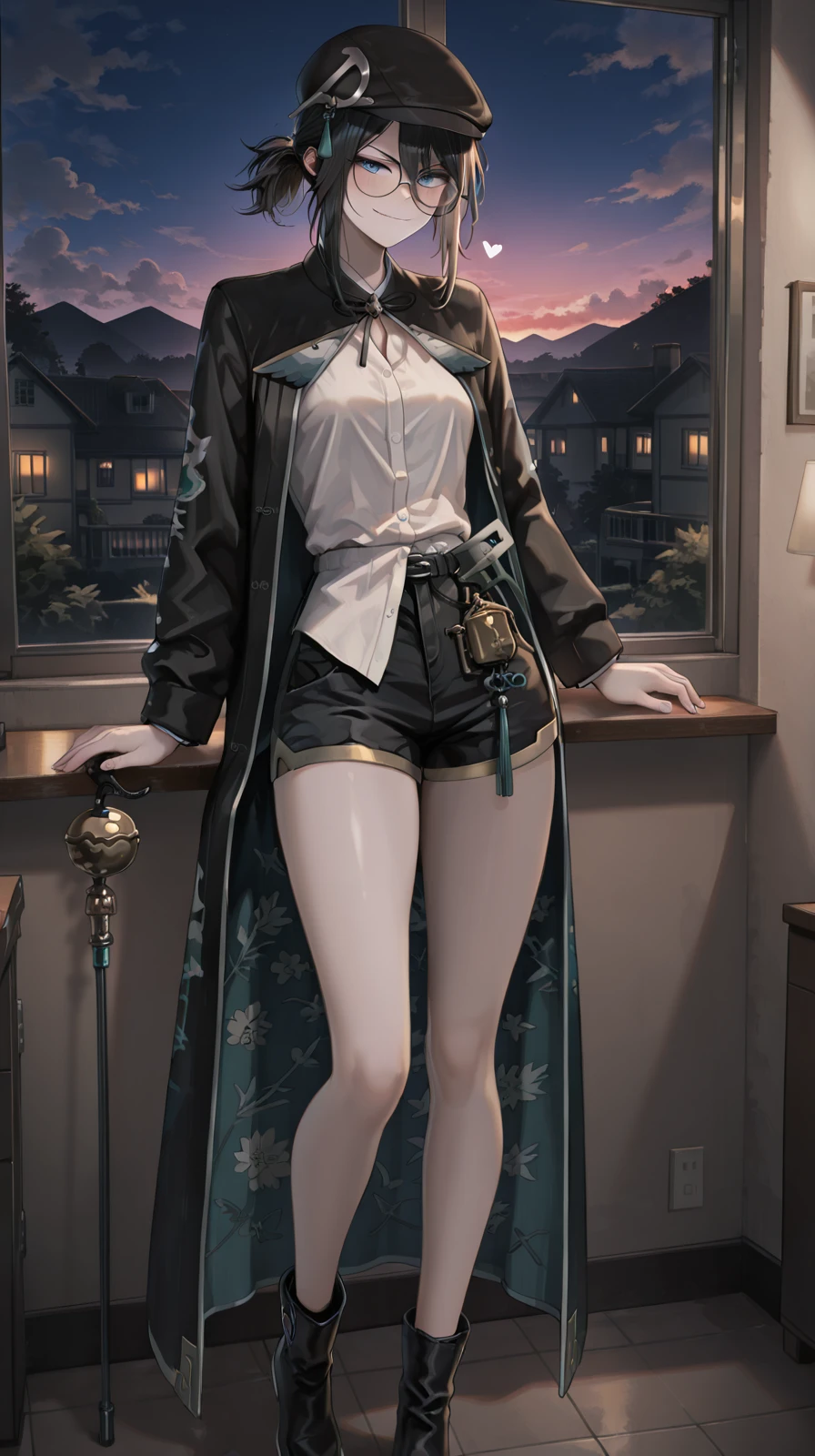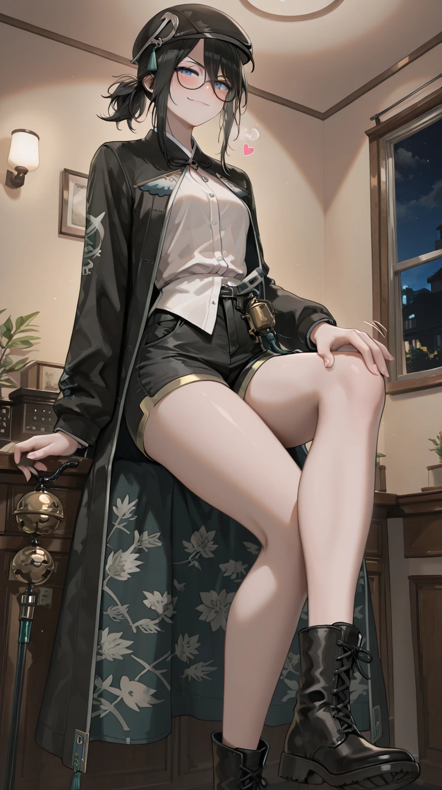 MaQue, black hair, medium hair, tied hair, sidelocks, round glasses, black beret, hair ornament, black coat, long coat, patterned coat, patterned inner coat, black shorts, white shirt, black boots, ankle boots, buttoned shirt, blue eyes, coat tie, gold trimmed shorts, bell hip attachment, patterned lapel, untucked shirt