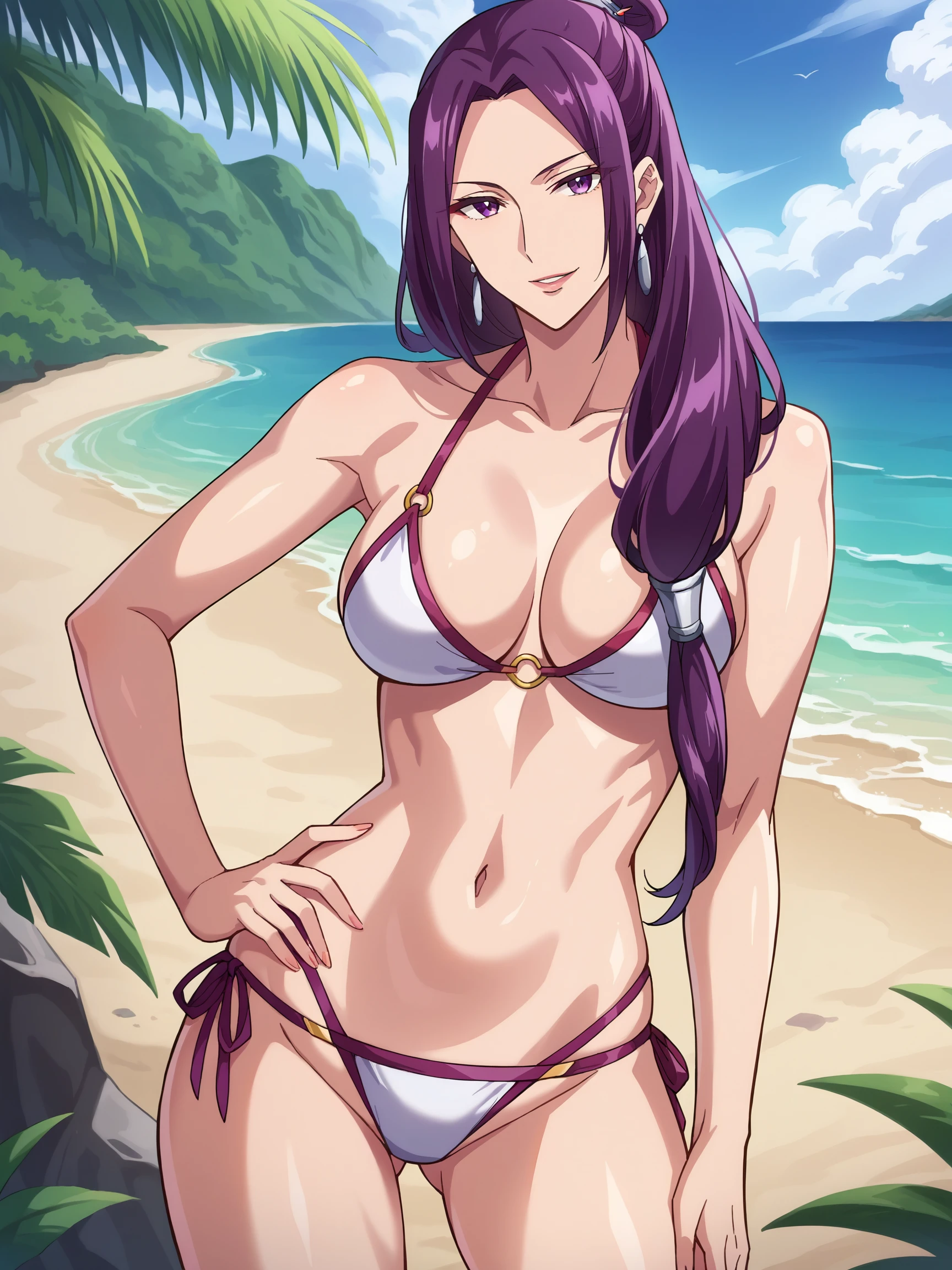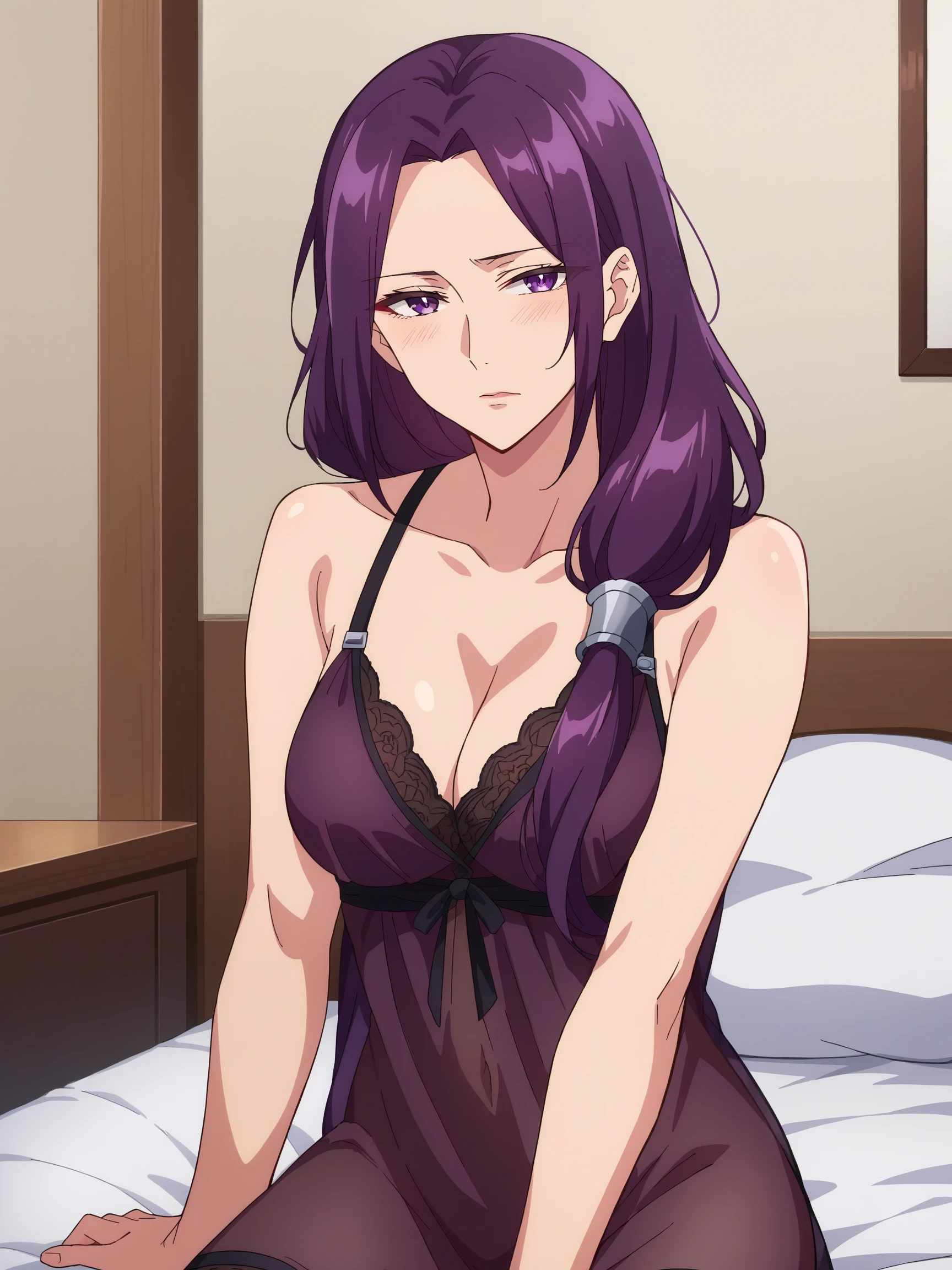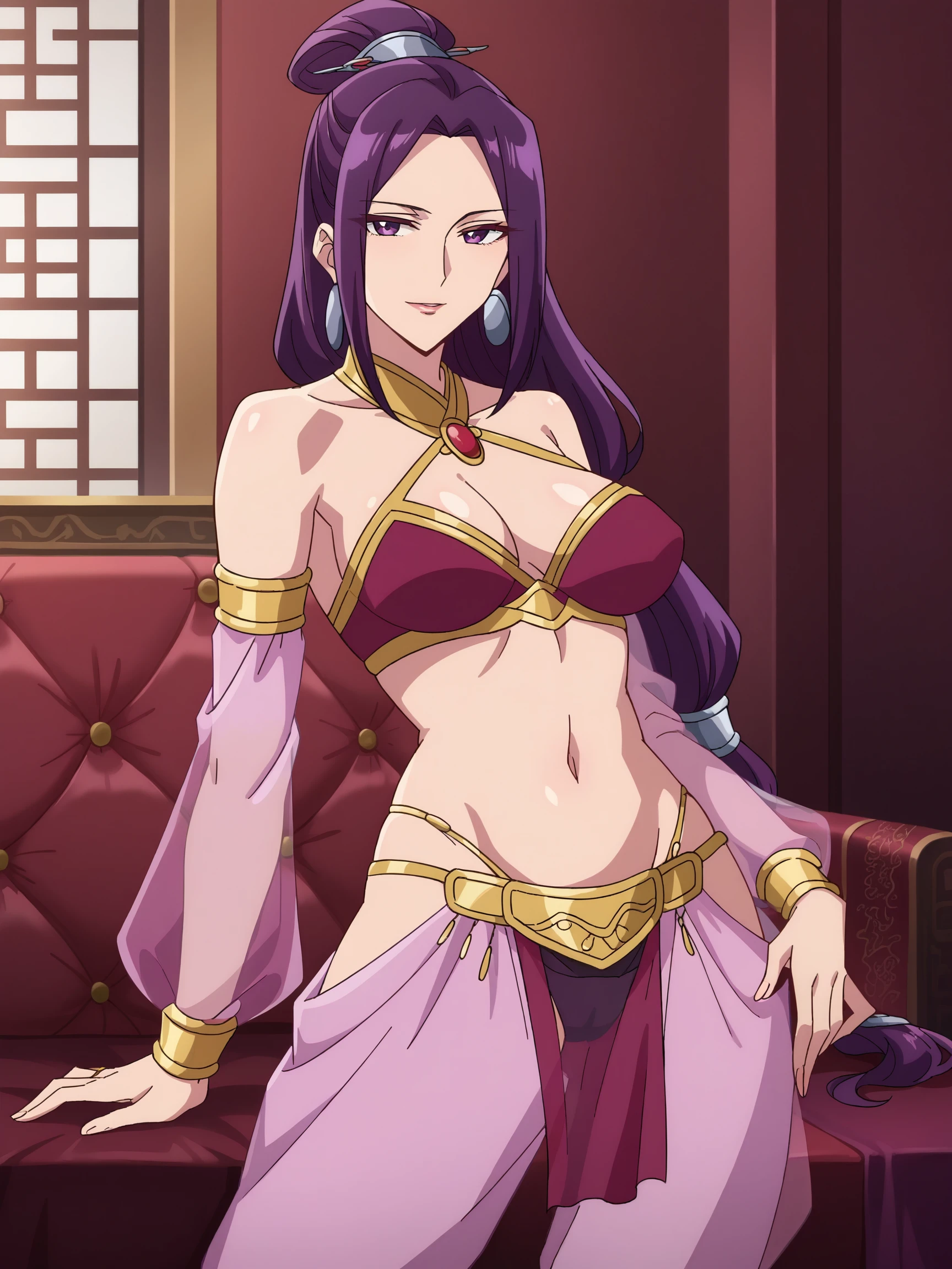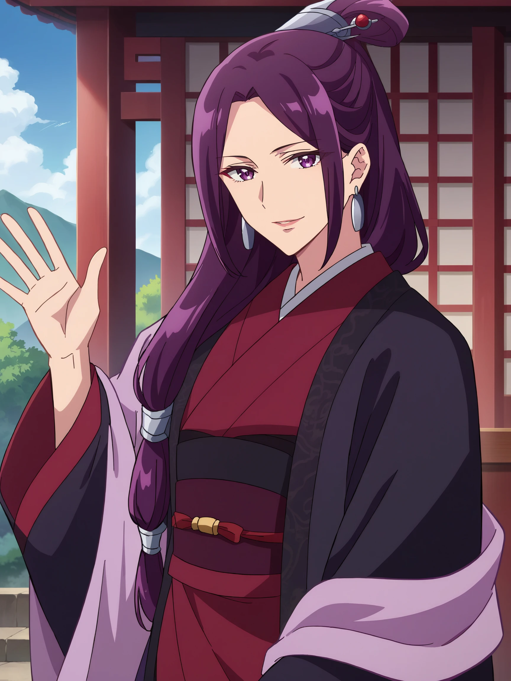 Apperance: Ahd0, purple hair, purple eyes, long hair, half updo, hair over shoulder, parted bangs, low-tied long hair, hair ornament, hair stick,