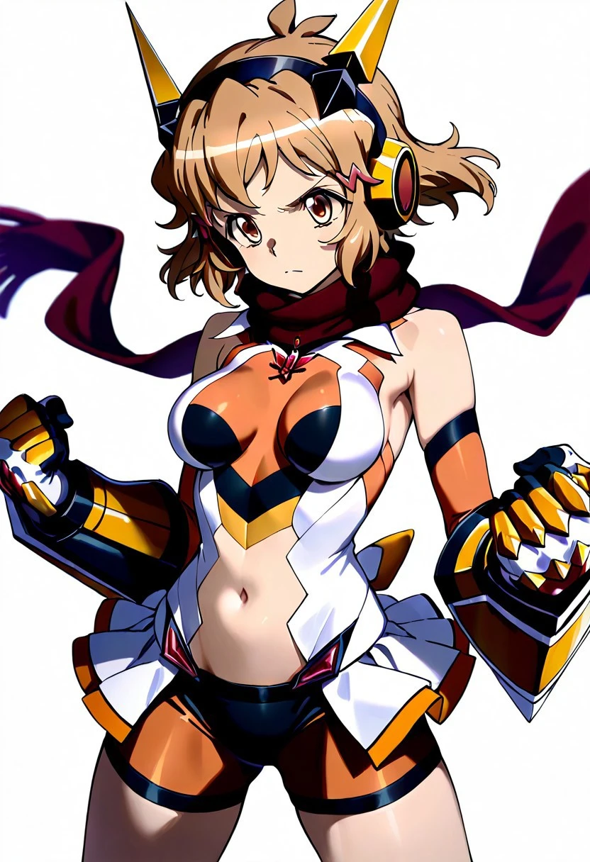 gloves, headphones, scarf, gauntlets,(navel cutout)