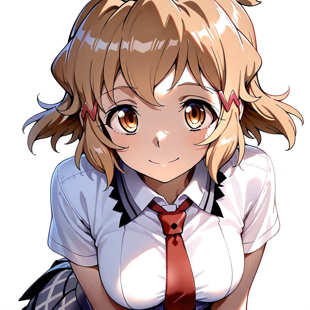 short hair,brown hair,hairclip,brown eyes,medium breasts