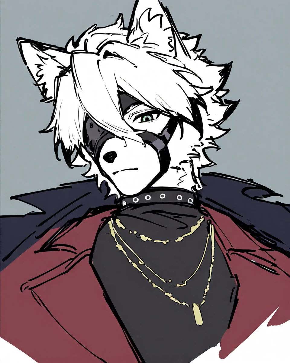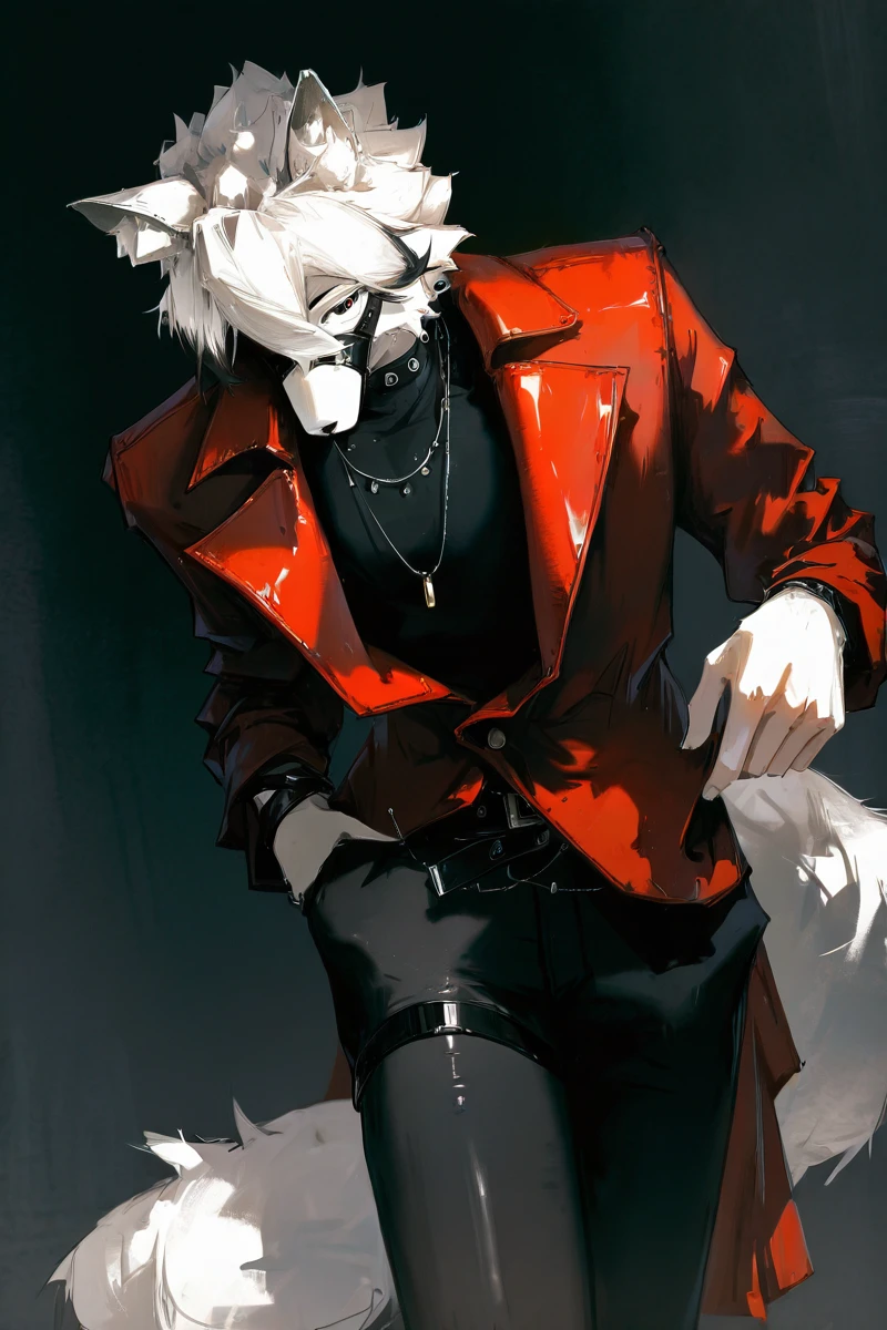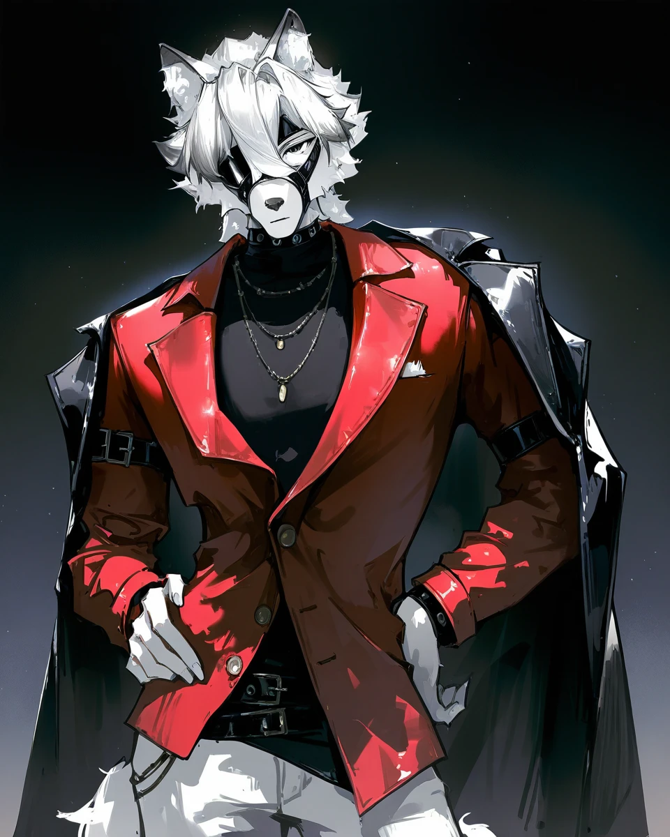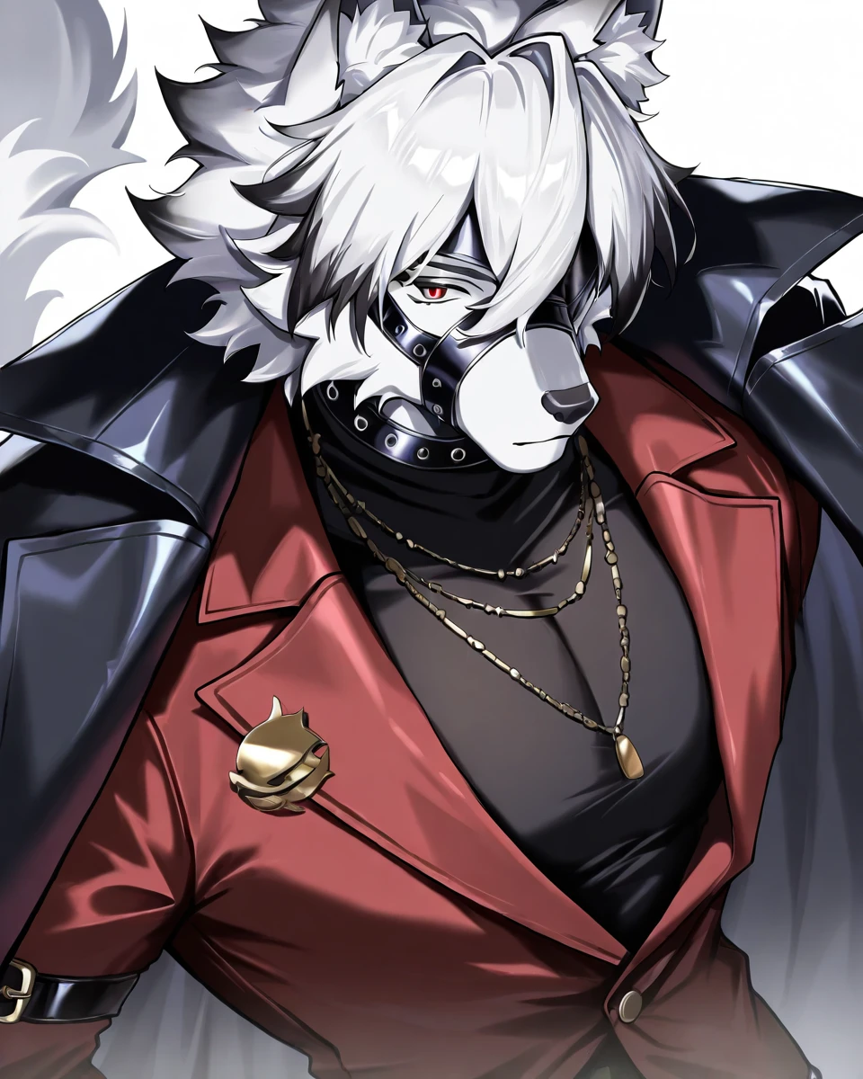 wolf ears,black shirt,necklace,one eye covered,coat,white fur,jewelry,white hair,wolf tail,red jacket,