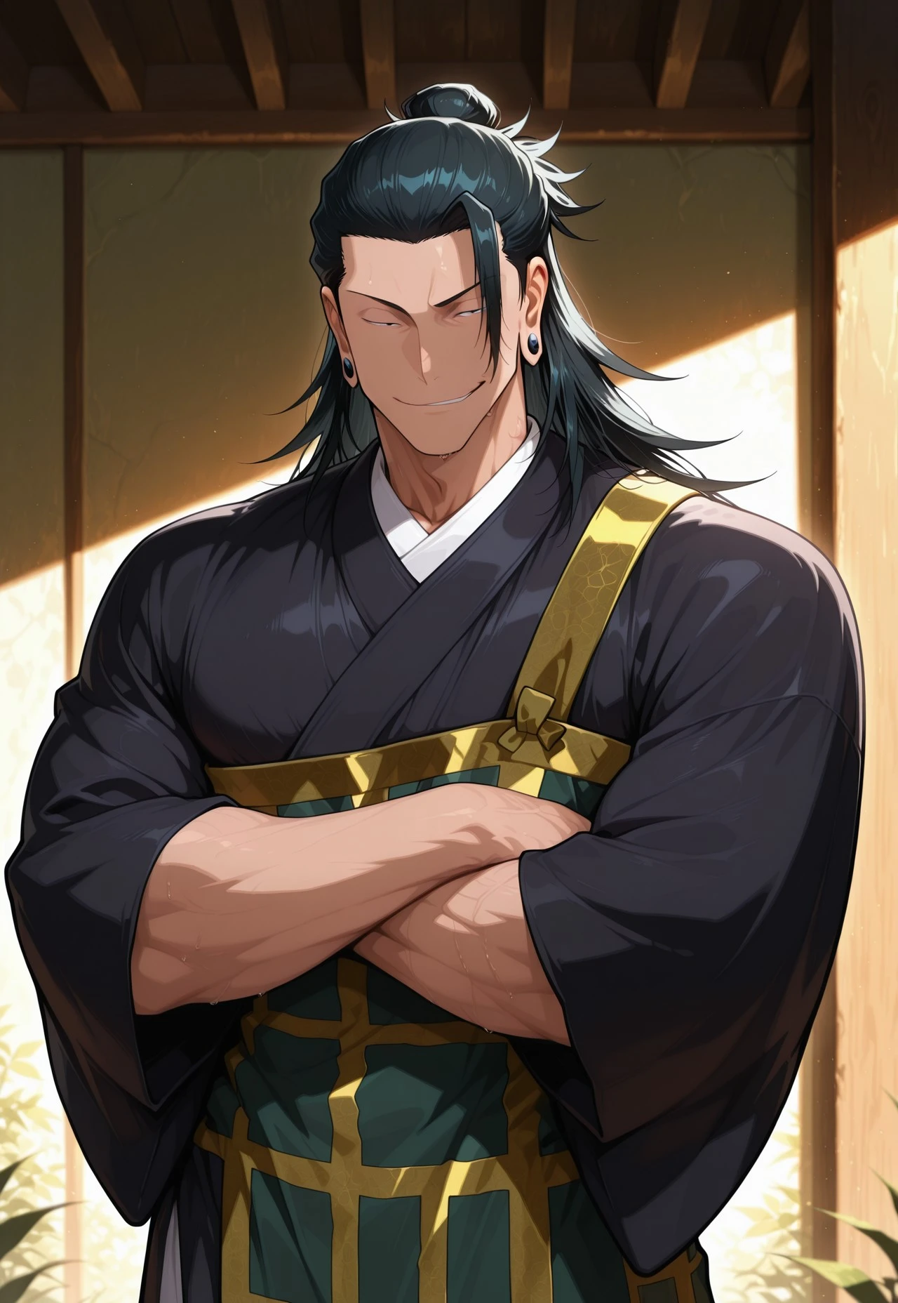 Geto, black eyes, long black hair, earrings, ear piercing, single hair bun, kesa, black kimono