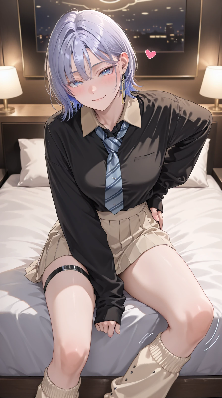 PontoNei2, pale lavender hair, hair between eyes, hair behind ear, (long bar earring), black earring, single earring, blue eyes, gradient eyes