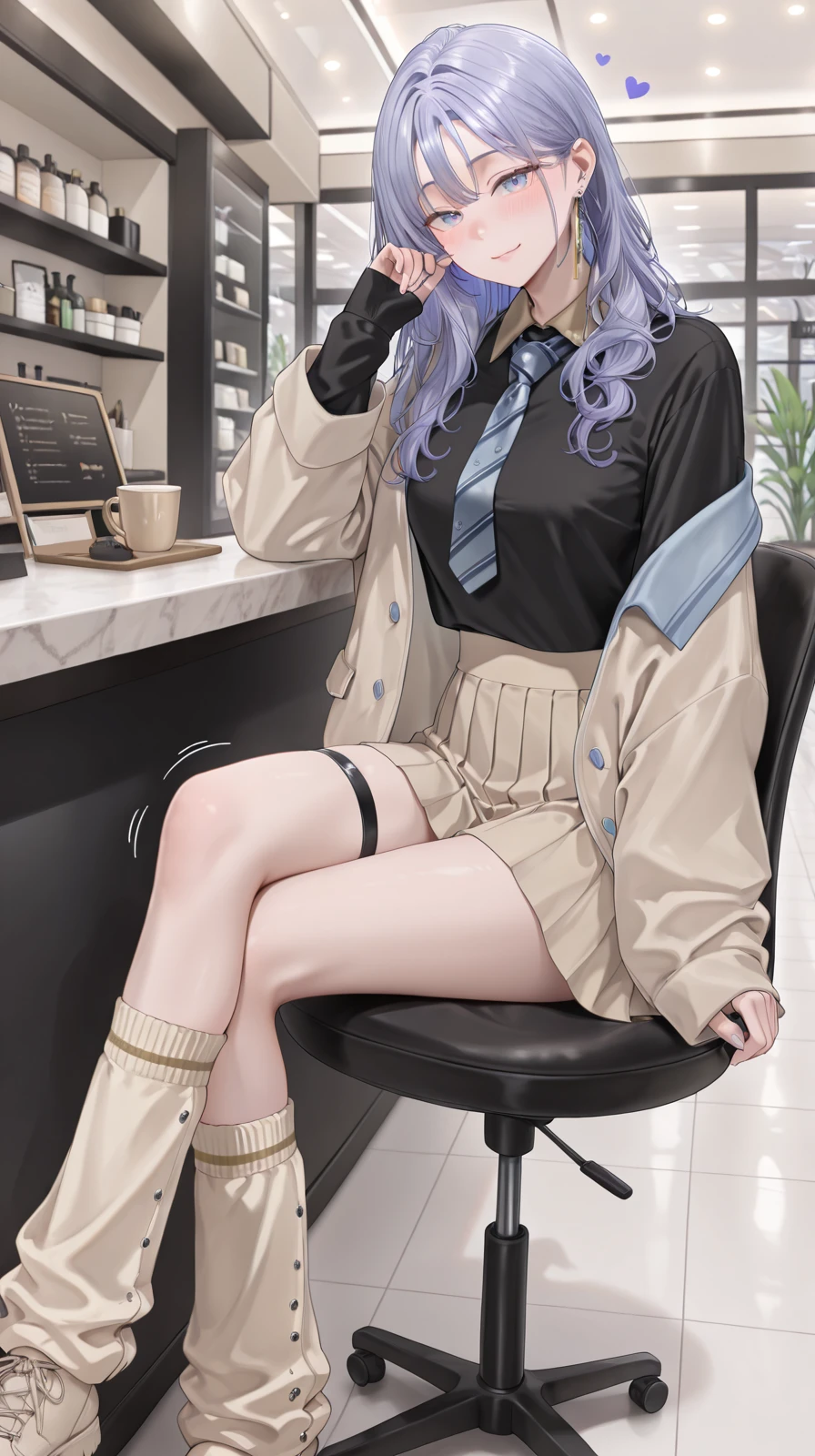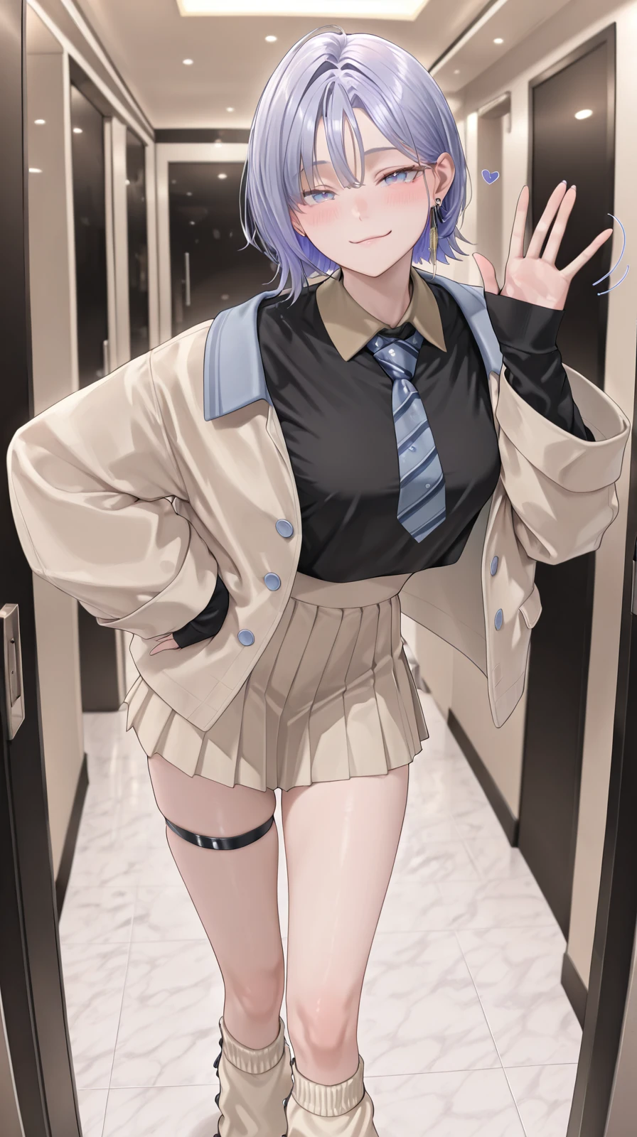 khaki collar, striped tie, steel blue tie, black shirt, sleeves past wrists, steel blue inner jacket, khaki jacket, pleated skirt, khaki skirt, single thigh strap, khaki leg warmers, khaki footwear