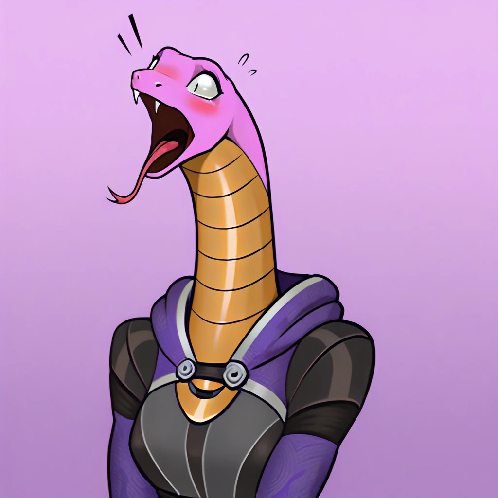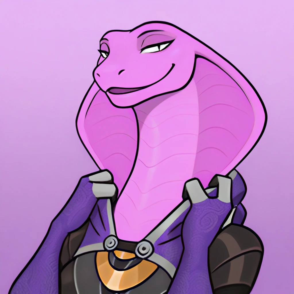 tal1_z0r4h_sn3ck, solo, female, anthro, snake, cobra, slim, small breasts, small waist, hood up, mouthless, slit pupils, eyelashes, eyeliner, (purple helmet, glossy helmet, translucent headwear:1.2), gold neckwear, belt, skinsuit, purple clothing, pattern clothing, fully clothed, 3 fingers, purple armwear, grey fingers, black vambrace, black shoulder pads, two tone breastplate, furgonomics, tail