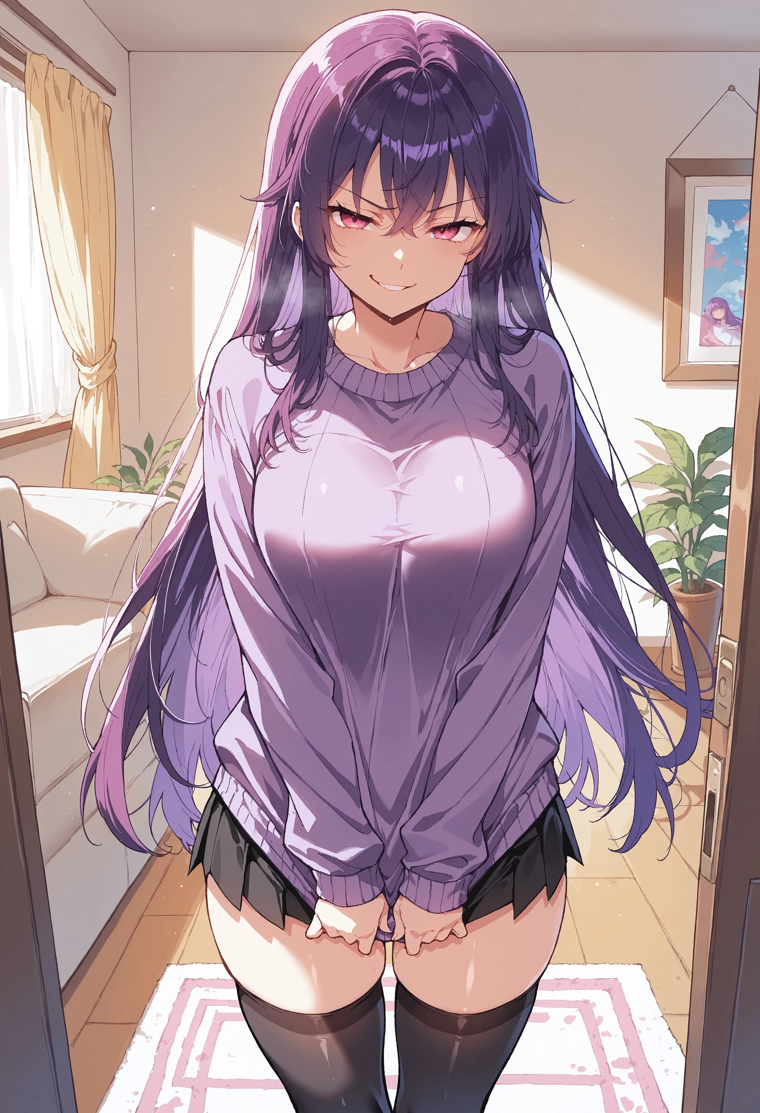 School outfit : Yuri Kawana, purple hair, long hair, pink eyes, medium breast, purple jacket, purple skirt, pink ribbon, white shirt, black thighhighs, black loafer,