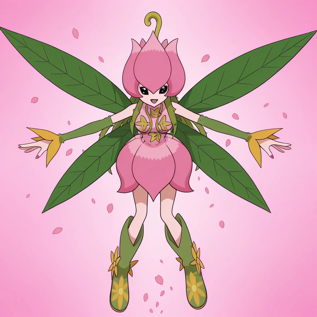 Tags: digimon (creature), flora fauna, plant girl, humanoid, pink flower helmet, green hair, vine hair, long hair, black eyes, no pupils, red fingernails, leaf wings, bare shoulders, pink dress, leaves on dress, green sleeves, detached sleeves, green boots, yellow flowers on boots,