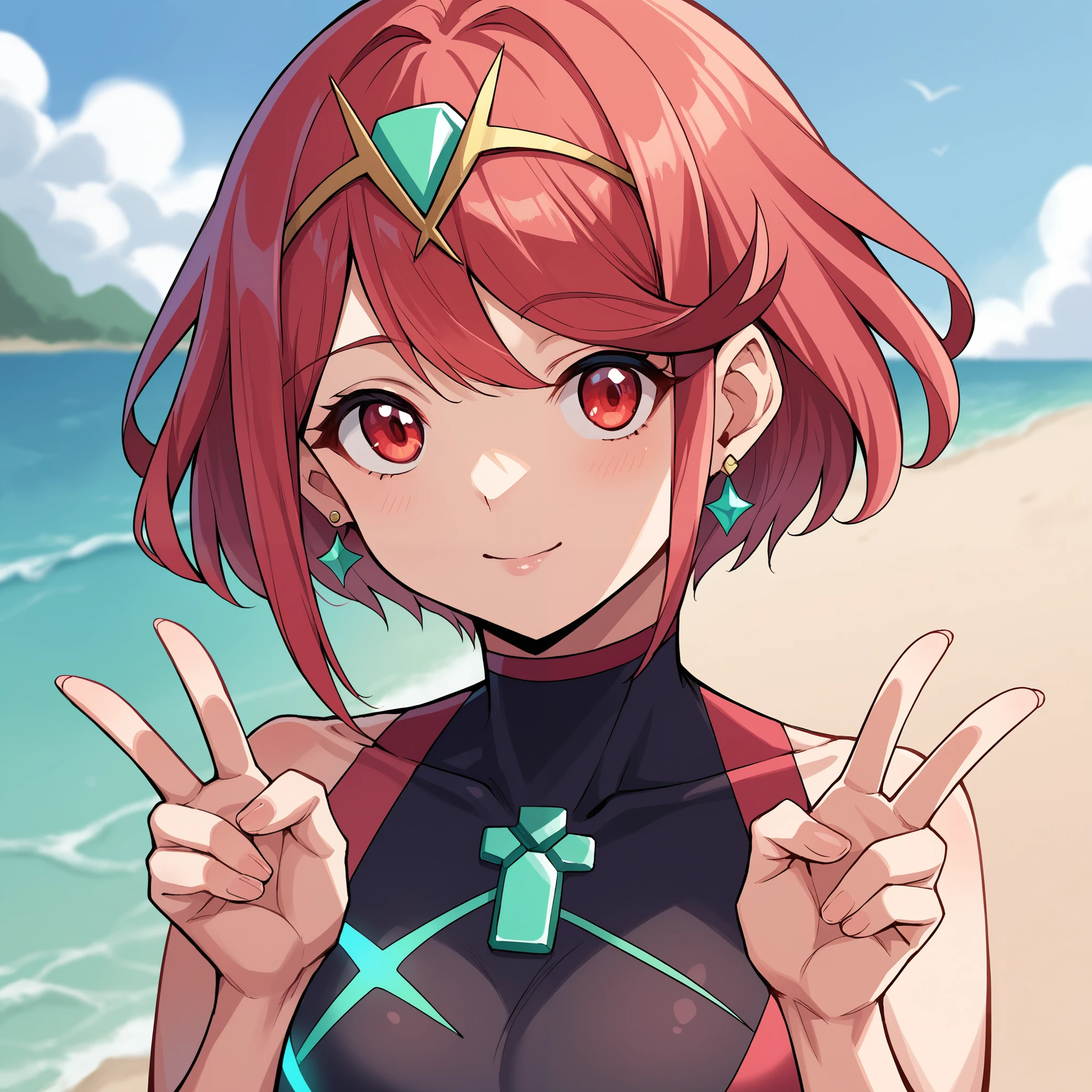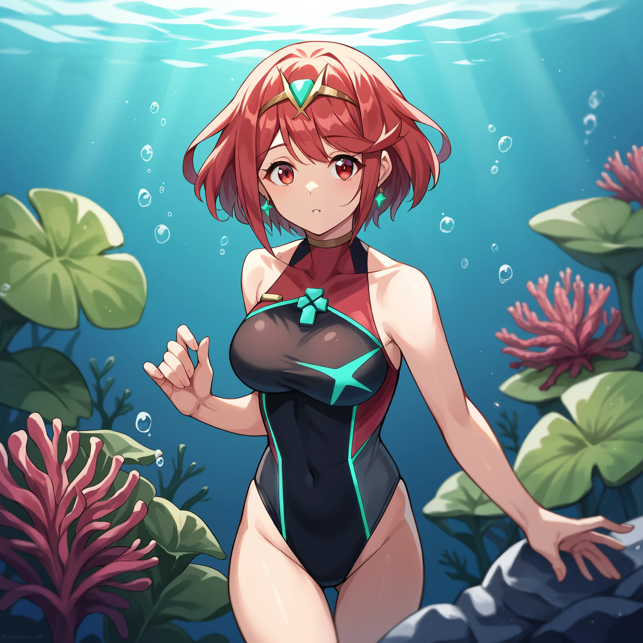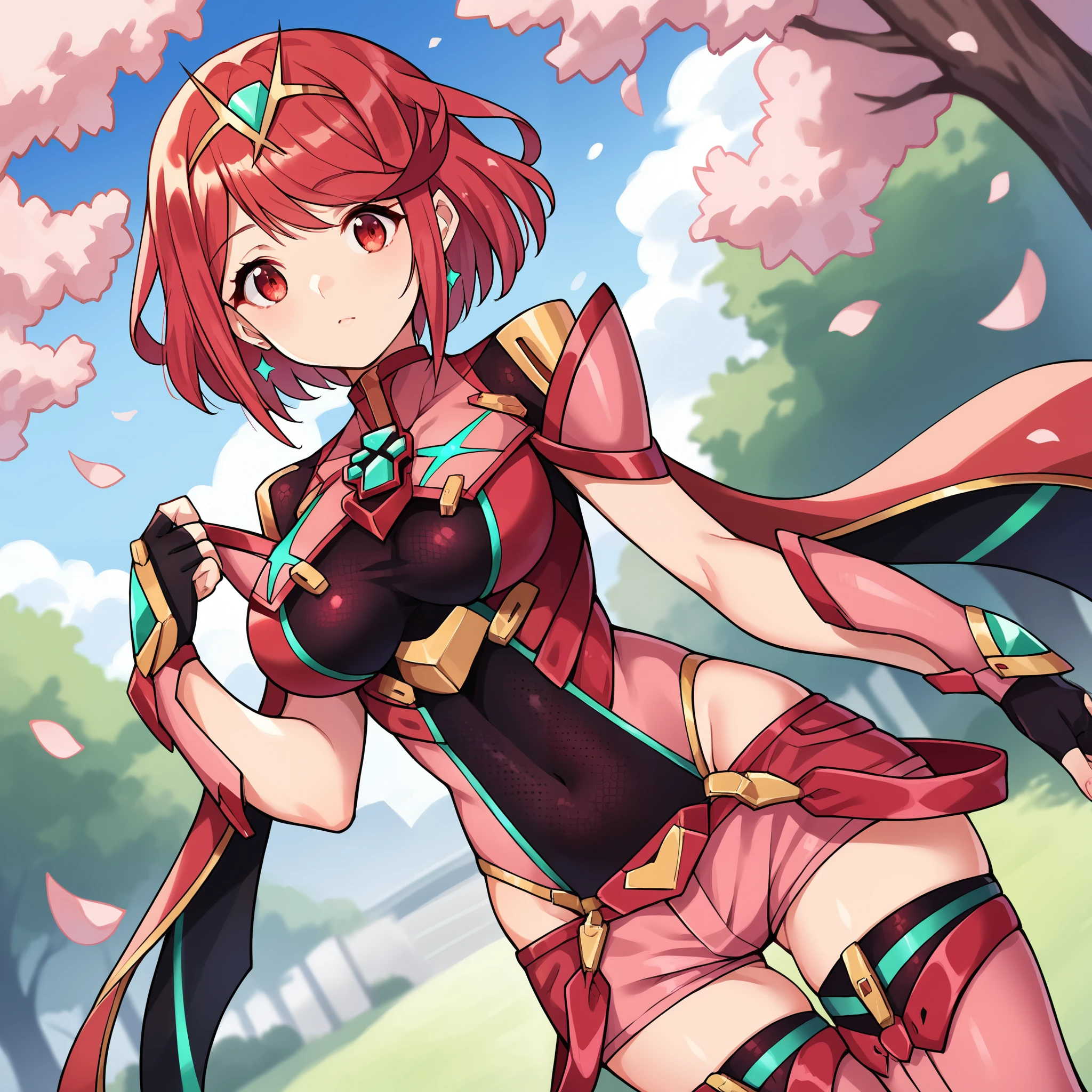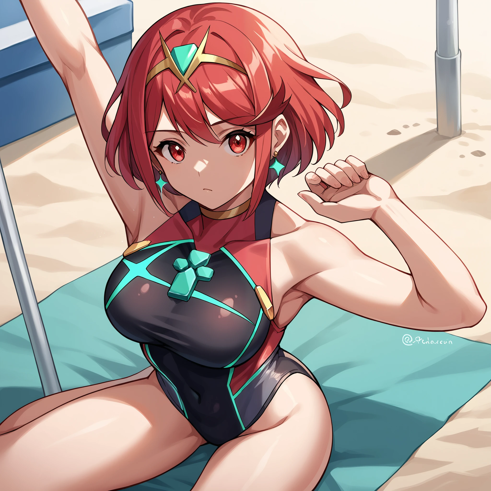 Default : pyradef, red hair, short hair, red eyes, earrings, tiara, fingerless gloves, chest jewel, covered navel, red shorts, short shorts, impossible clothes, armor, red thighhighs,Pro Swimmer : pyraproswim, red hair, short hair, red eyes, earrings, tiara, two-tone swimsuit, chest jewel, competition swimsuit, Custom : pyracs, red hair, short hair, red eyes, earrings, tiara,Description