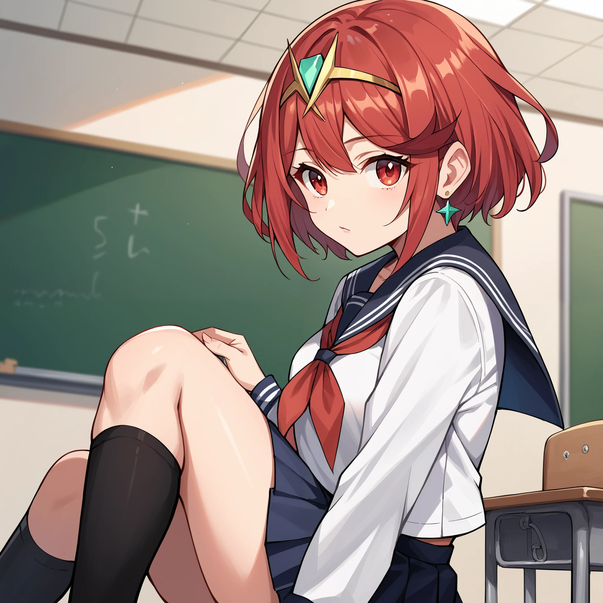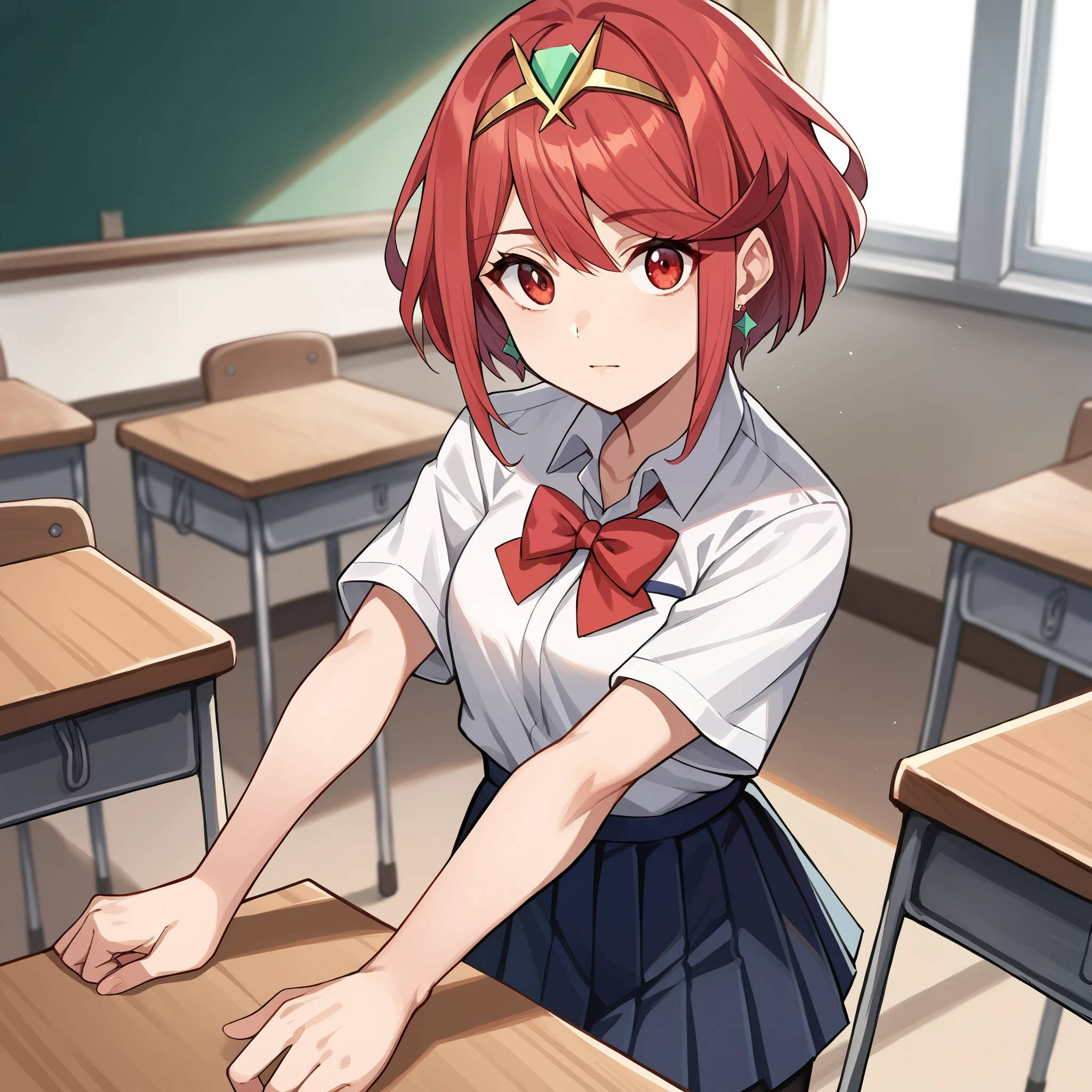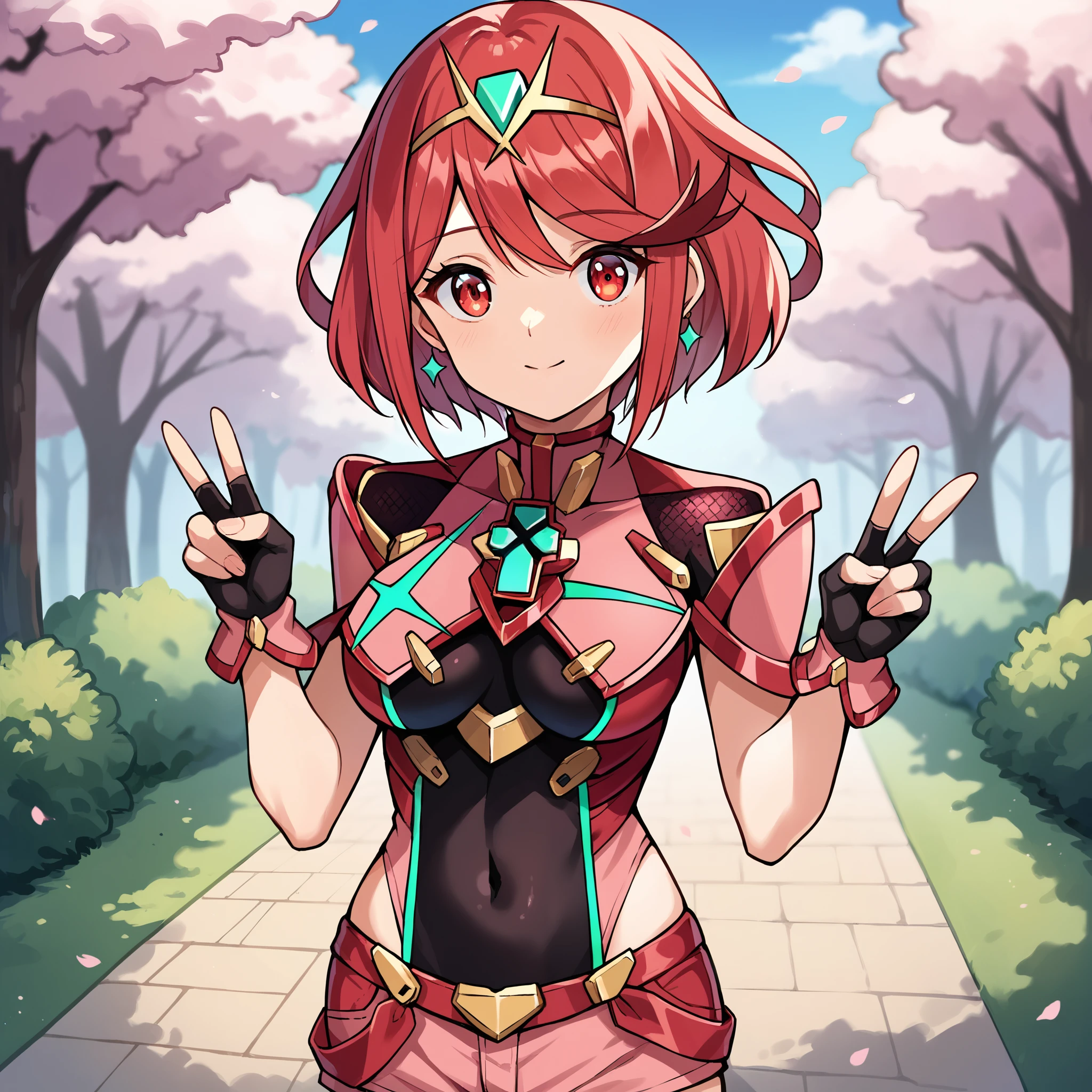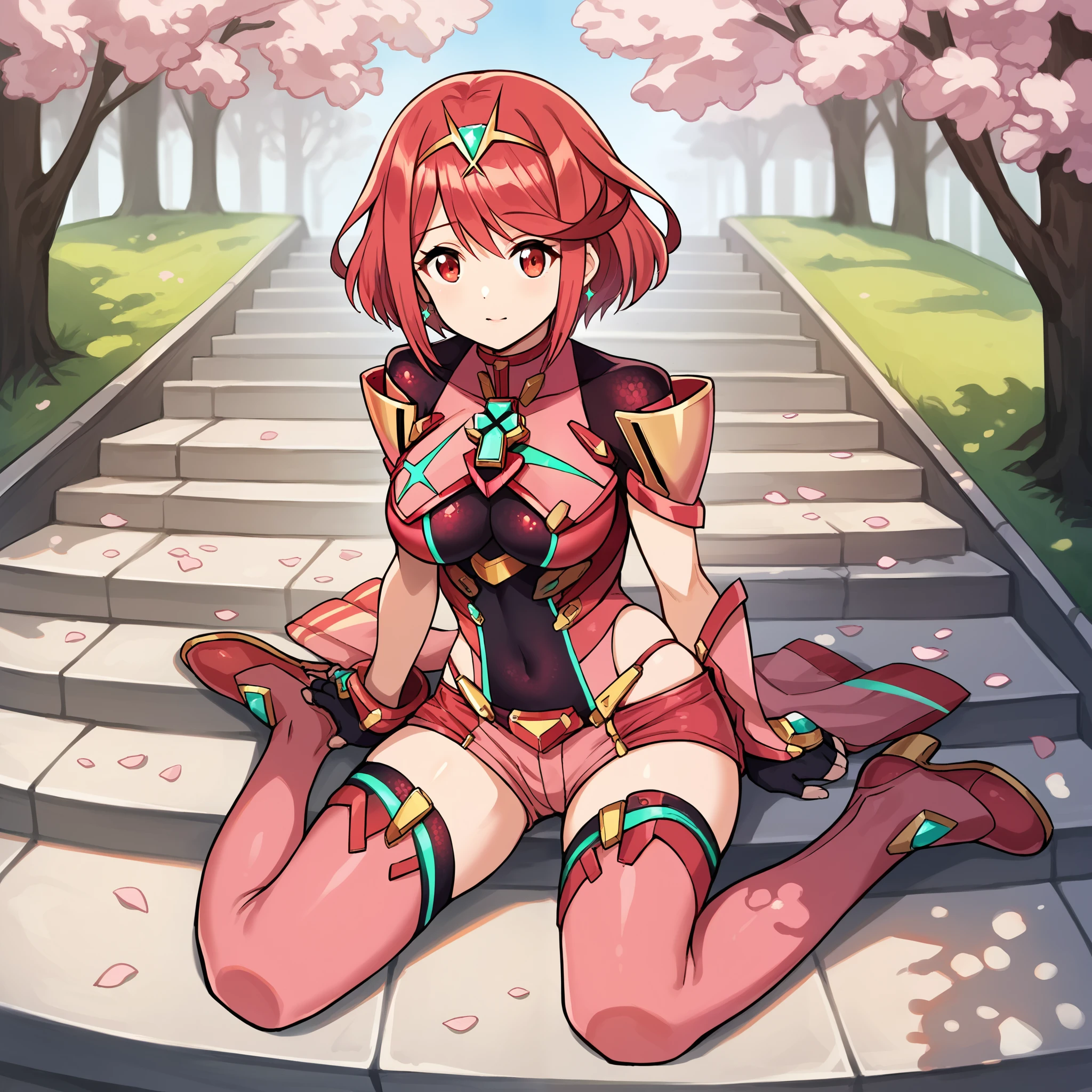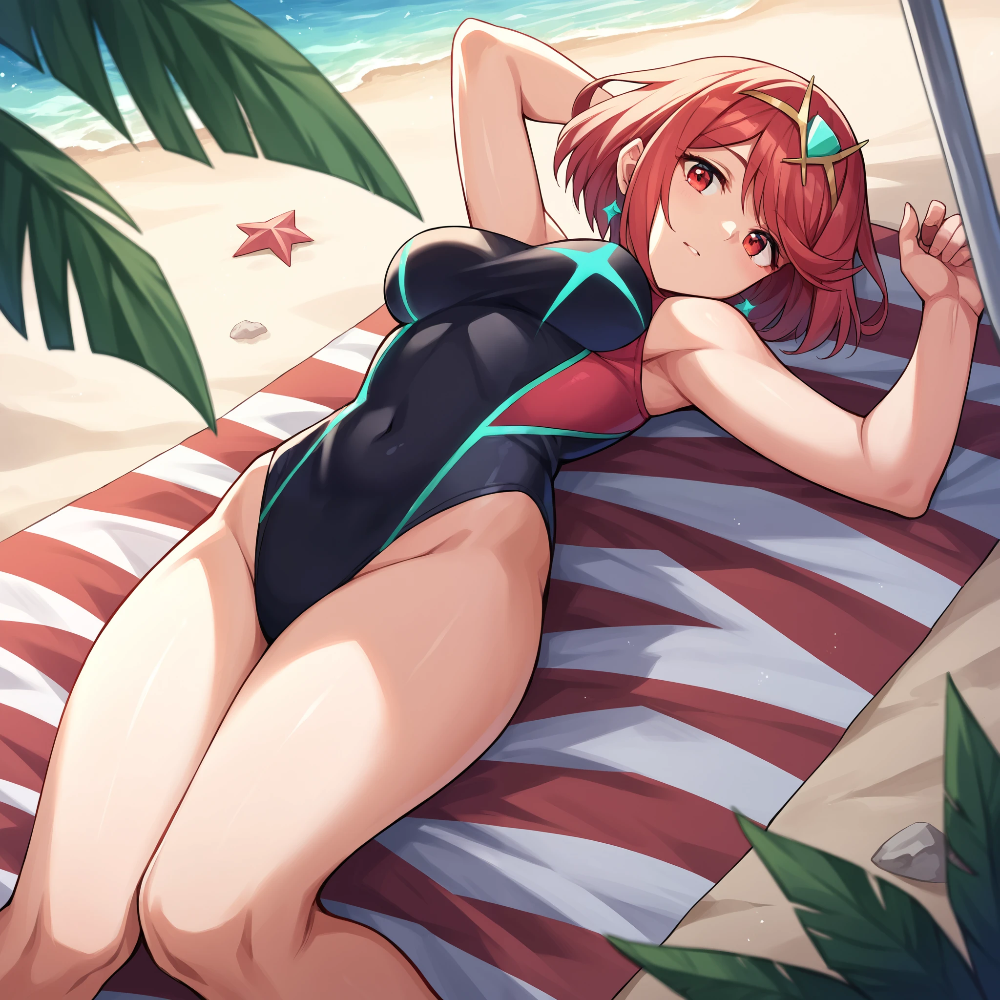 Default : pyradef, red hair, short hair, red eyes, earrings, tiara, fingerless gloves, chest jewel, covered navel, red shorts, short shorts, impossible clothes, armor, red thighhighs,Pro Swimmer : pyraproswim, red hair, short hair, red eyes, earrings, tiara, two-tone swimsuit, chest jewel, competition swimsuit, Custom : pyracs, red hair, short hair, red eyes, earrings, tiara,Description