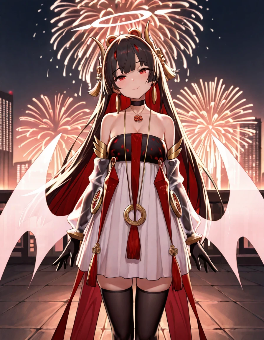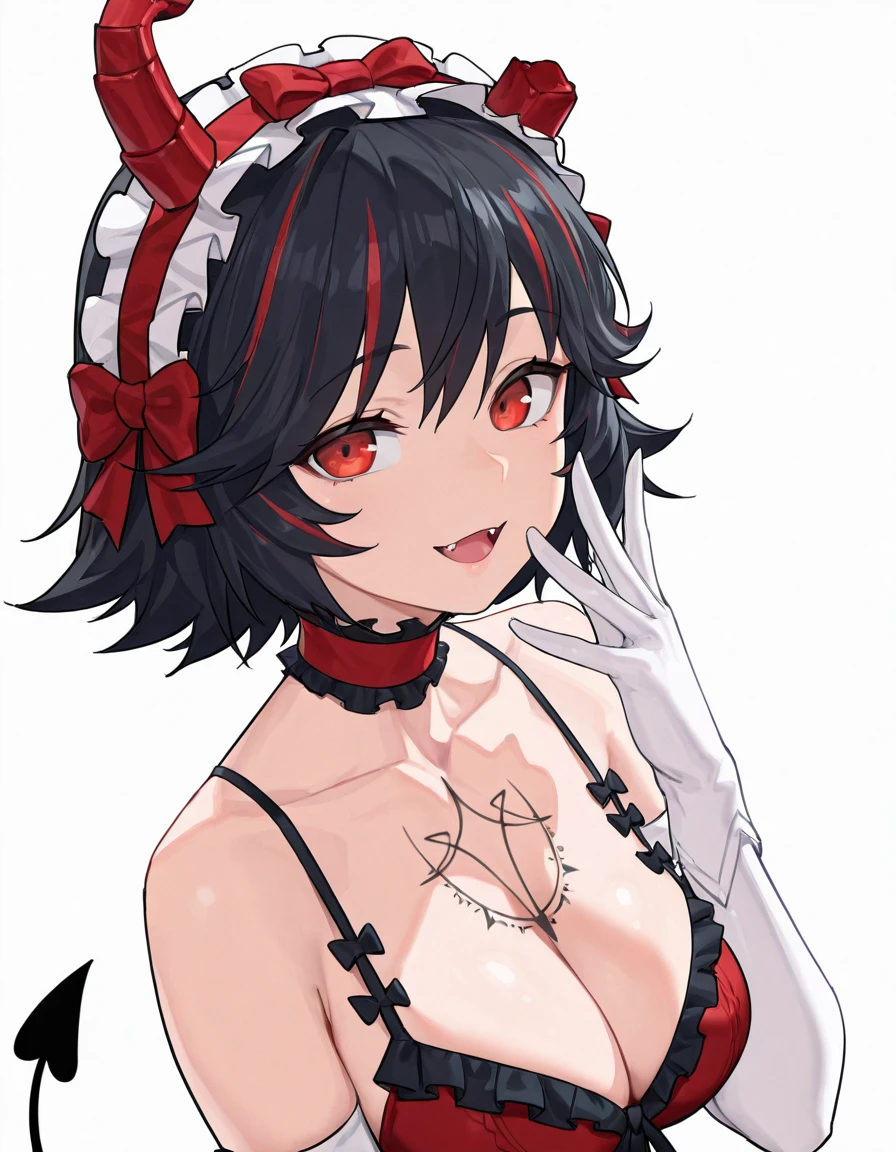Luciavmp, short hair, streaked hair, black hair, red hair, vmp horns, vmp tail, vmp wings, low wings,red eyes,