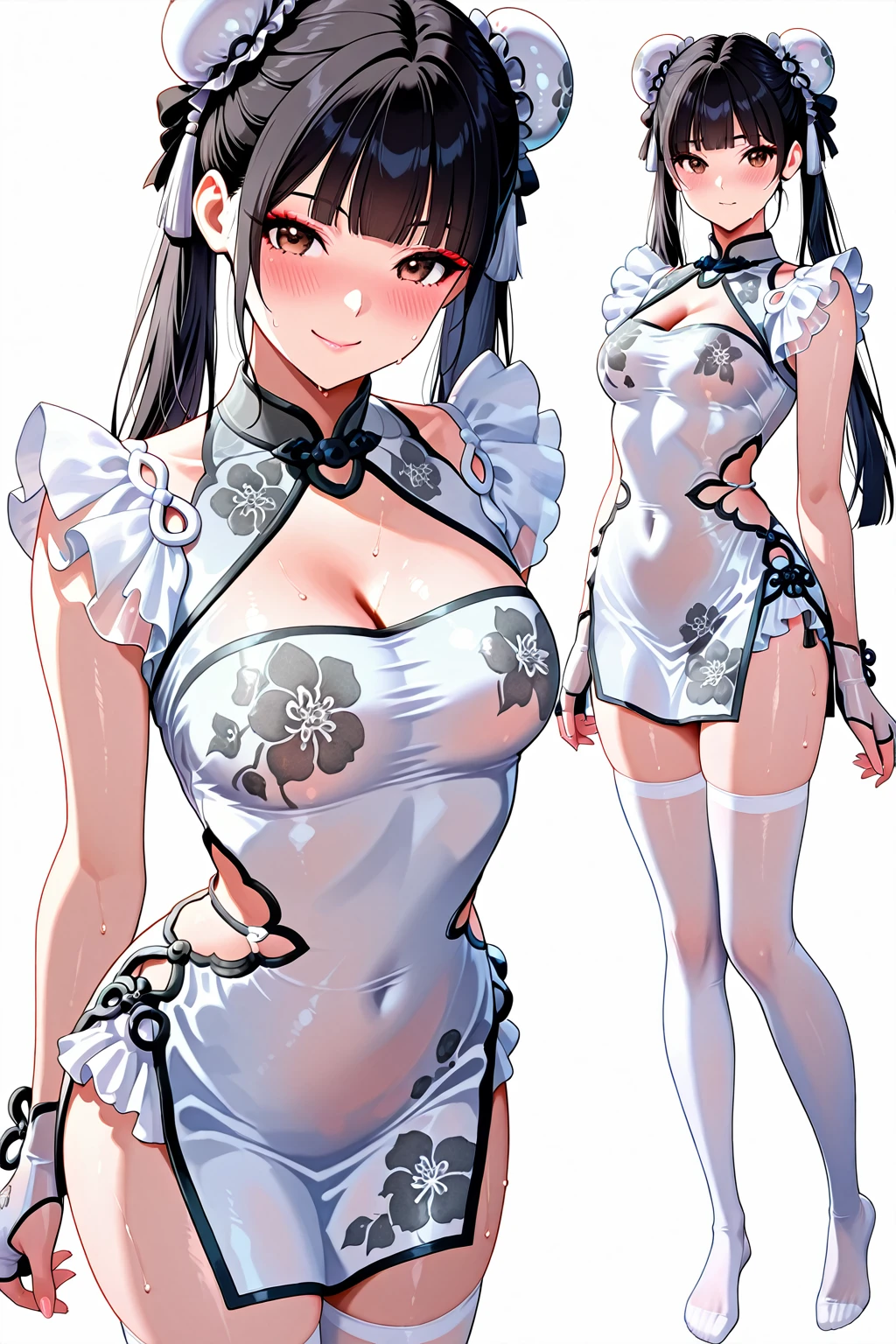 13878w hair,13878w hair ornament,black hair,brown eyes,double bun,bun cover,white dress,twintails,hime cut,long hair,