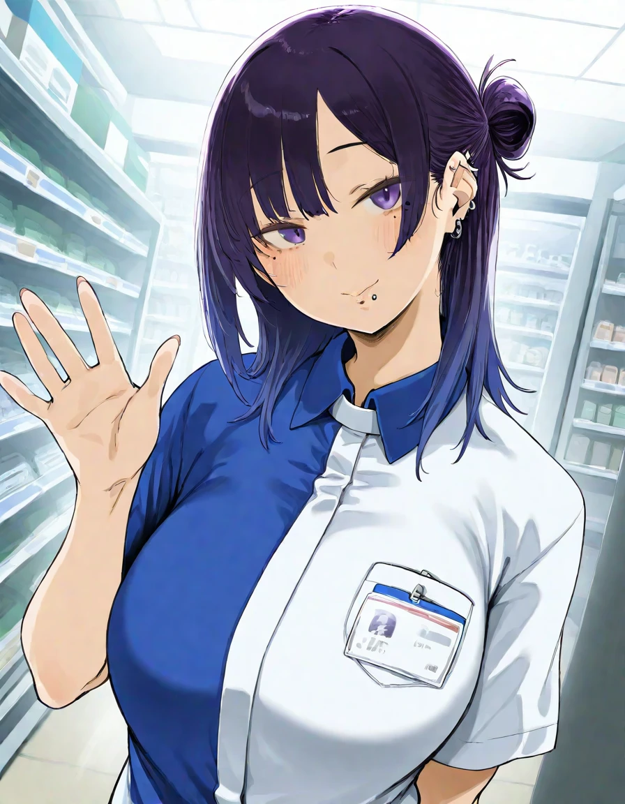 1girl,yano_touka,asymmetrical_bangs,medium hair,tied hair,lip_piercing,2 moles under eye,ear_piercing,multiple_earrings ,spiked_ear_piercing,