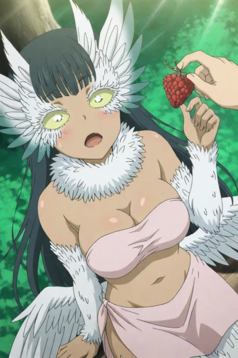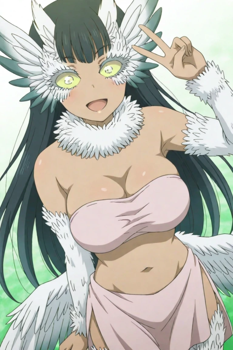 uzoimom, 1girl, long hair, black hair, feathers, lime sclera, breasts, strapless, monster girl, feathered wings, low wings, feather eyelashes, fur collar, pink tube top, pink loincloth, tan skin,