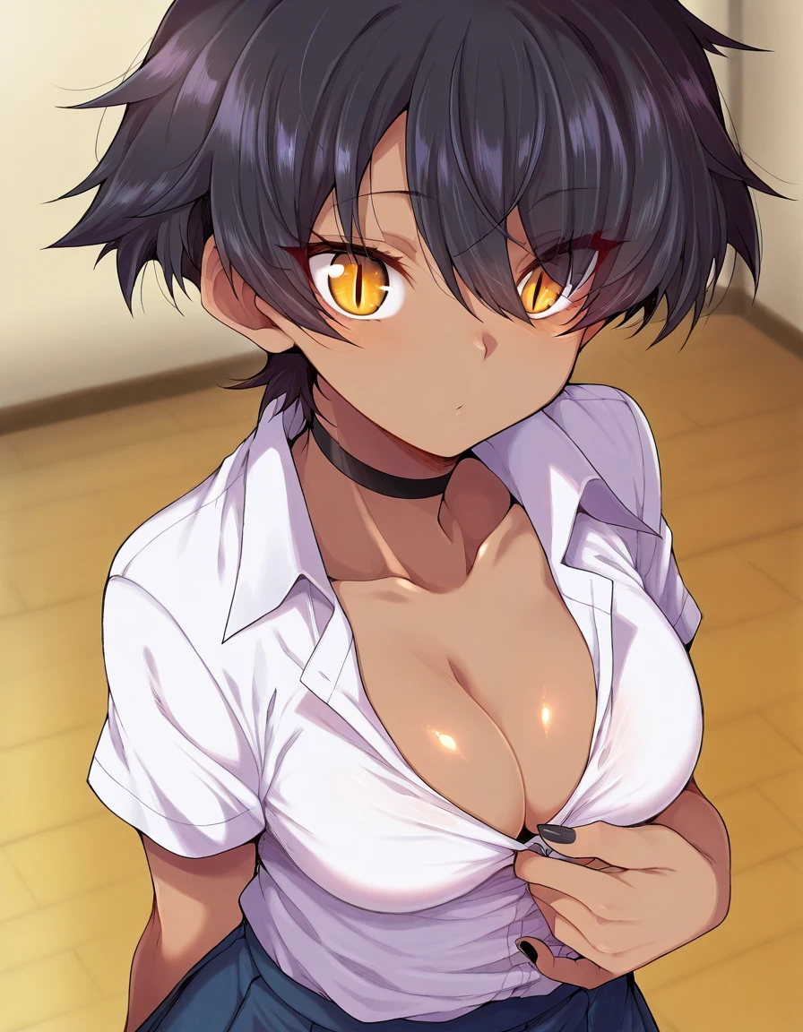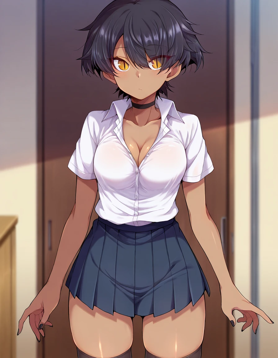 breasts, cleavage, school uniform, black choker, shirt, white shirt, collared shirt, short sleeves, skirt, pleated skirt, thighhighs,