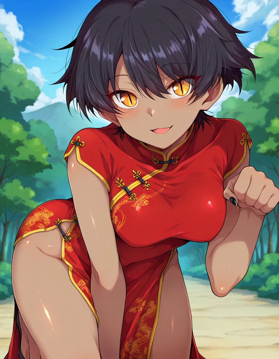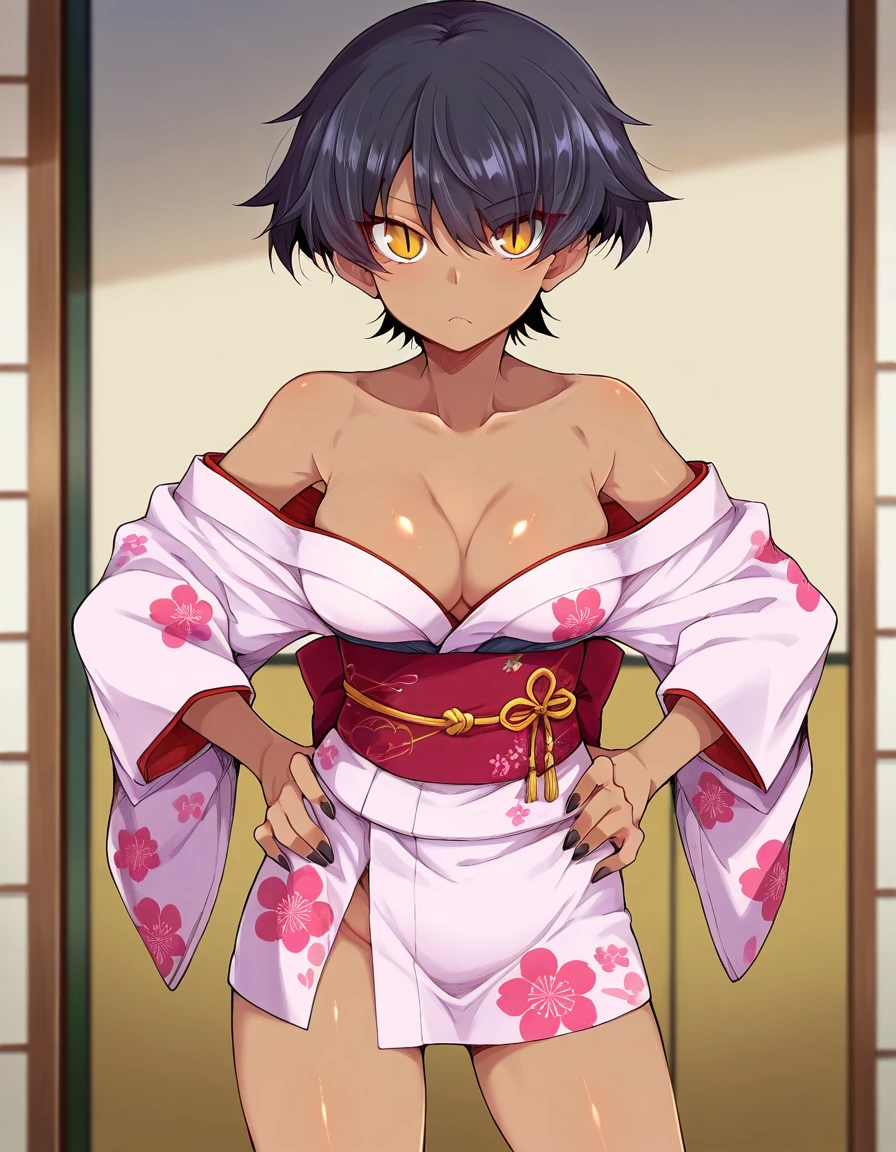 linww, tomboy, petite, dark skin, dark-skinned female, yellow eyes, black hair, short hair, asymmetrical bangs, medium breasts,
