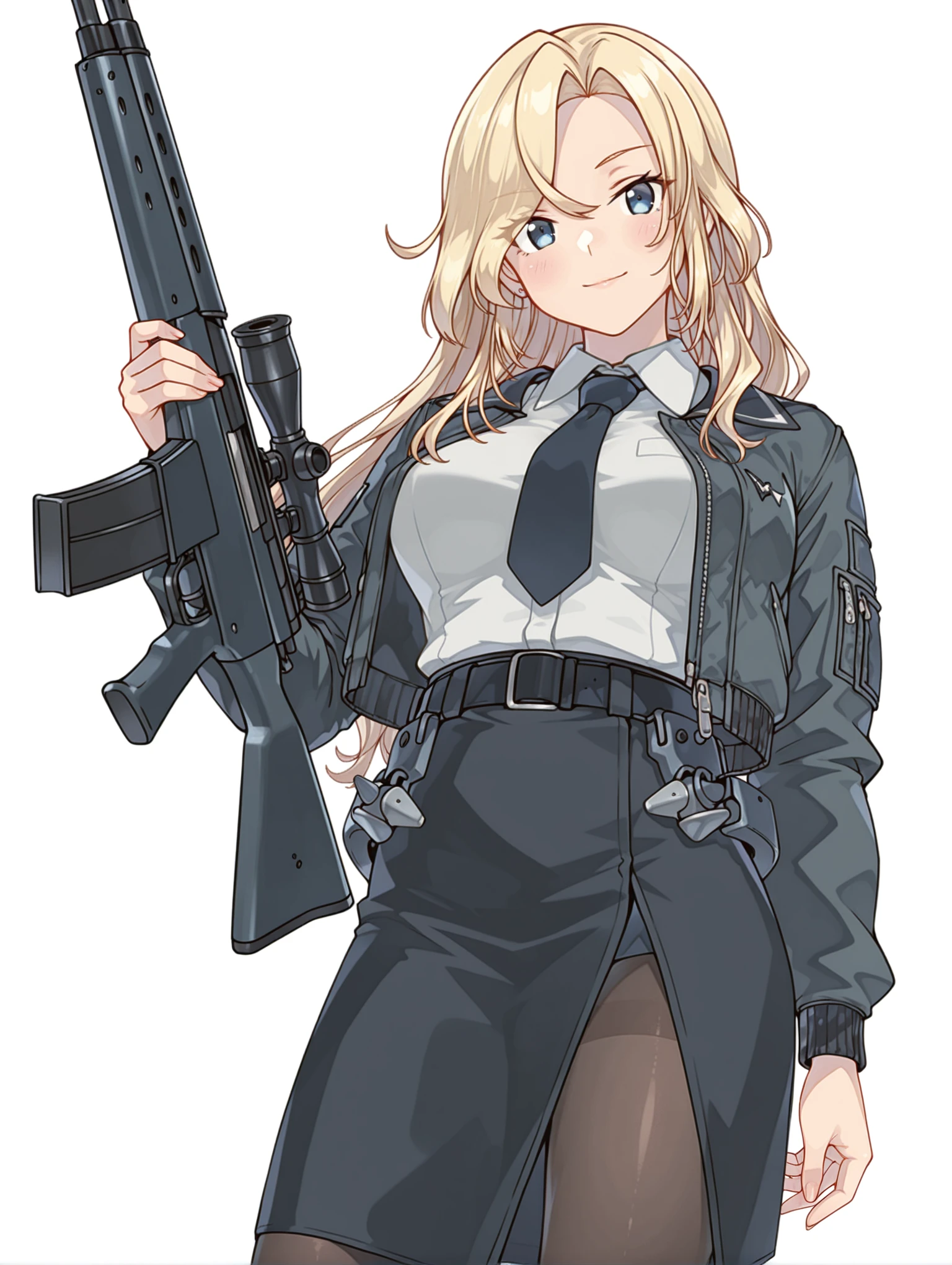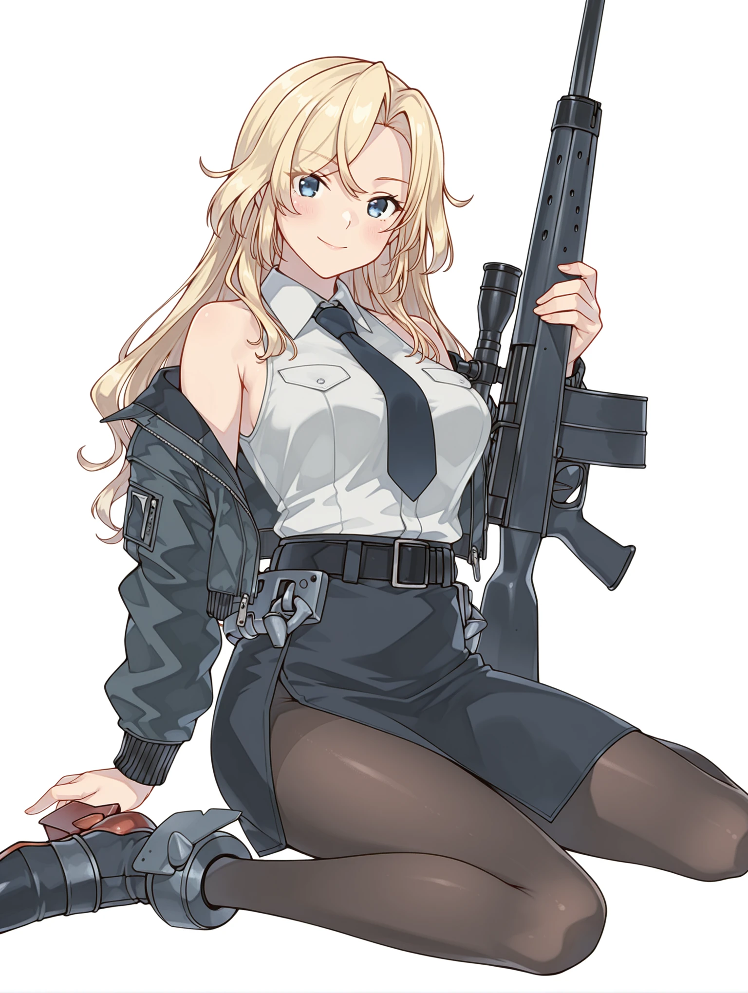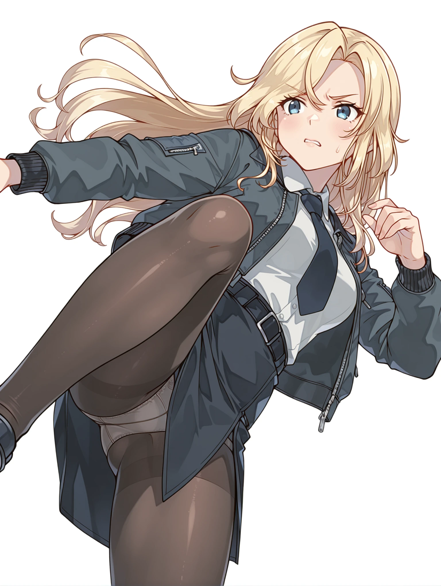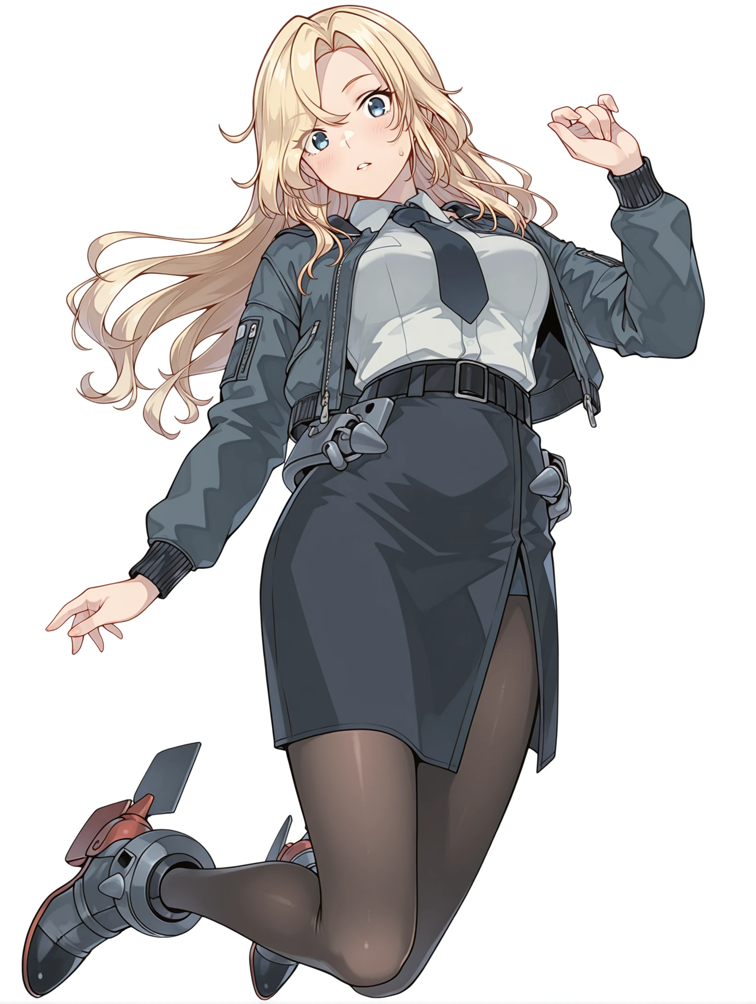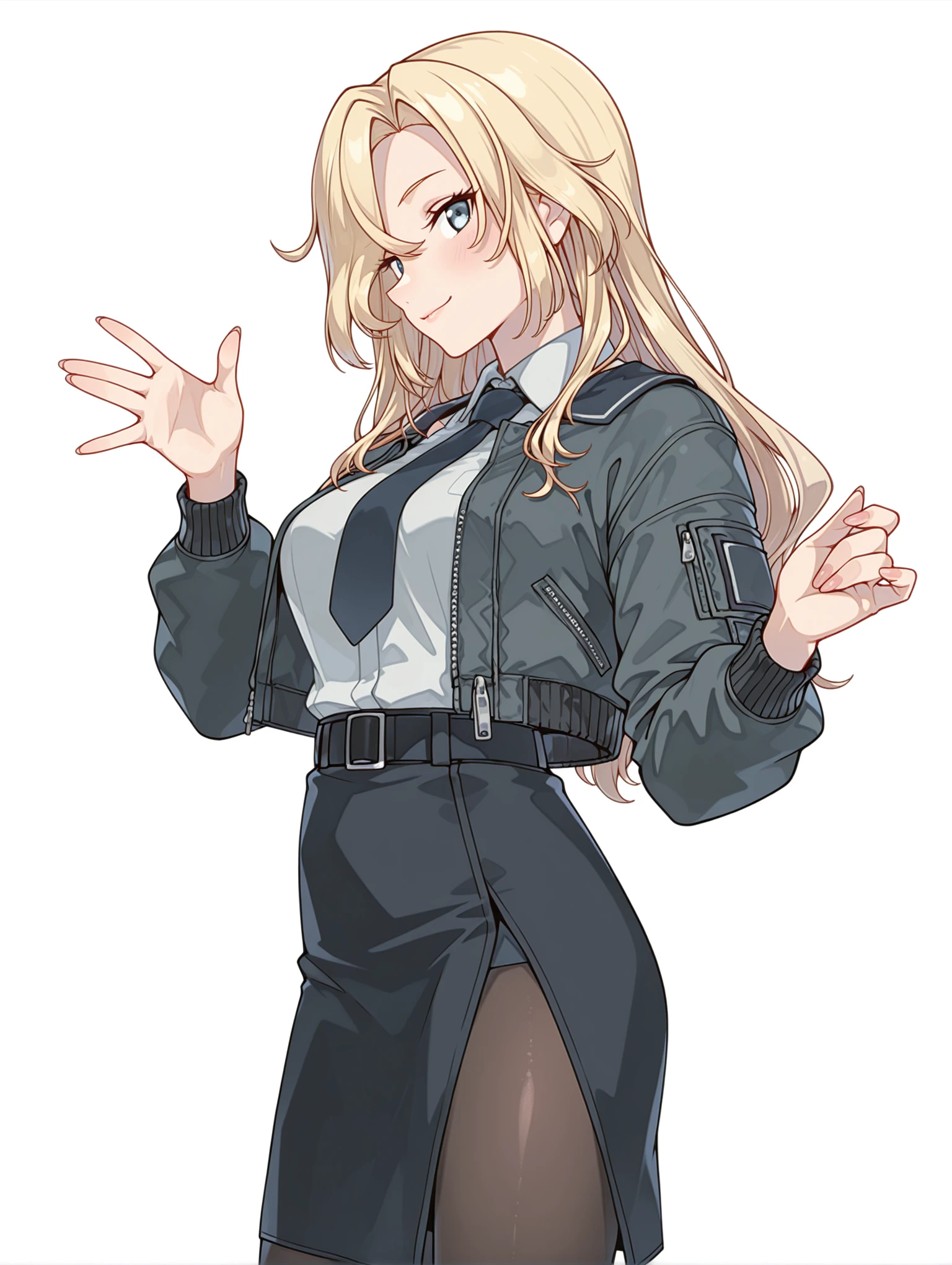 h_clothes,black bomber jacket,collared shirt,black necktie,sleeveless shirt,black skirt,side slit,black pantyhose,rudder footwear,