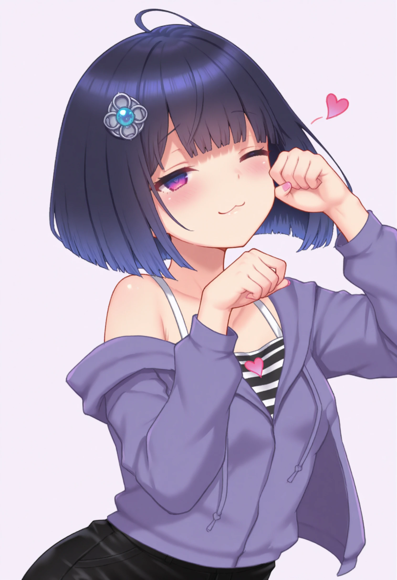 open jacket, purple hoodie, off shoulder, striped shirt, black shorts, black loafers蓝兔女郎
