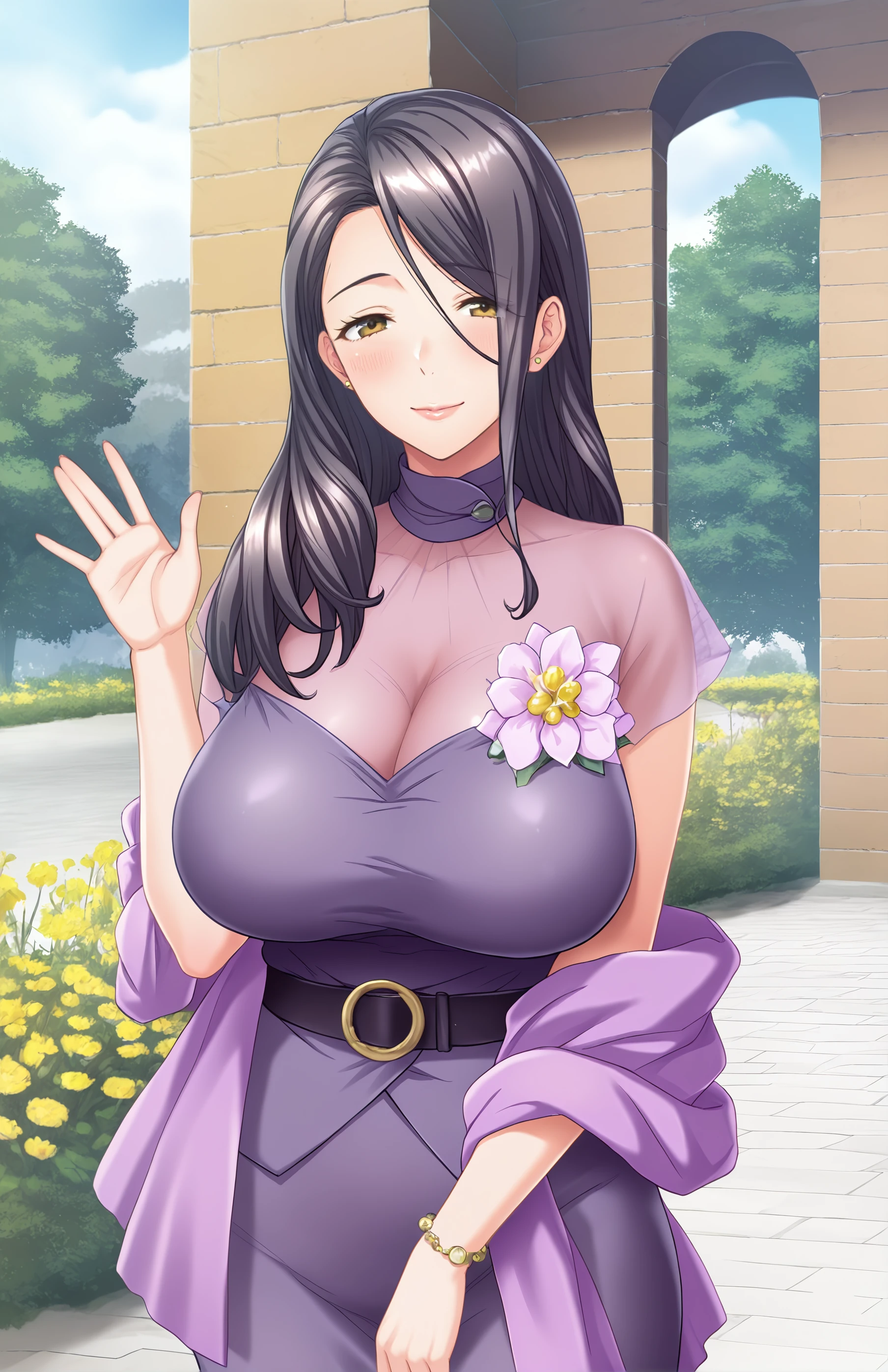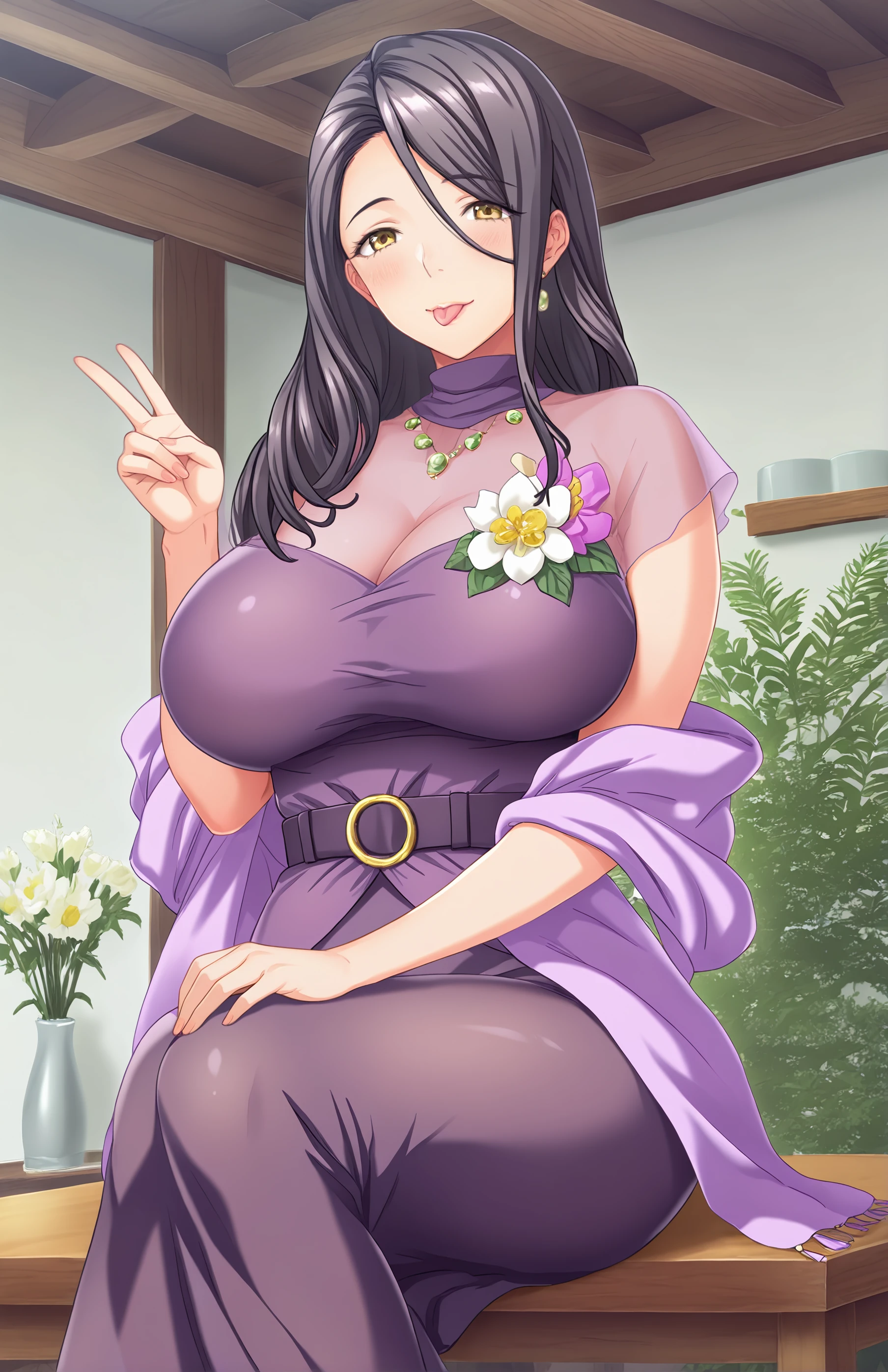 AzumaChisa, long hair, breasts, dark pirple skirt, large breasts, black hair, purple dress, cleavage, brown eyes, jewelry, yellow eyes, flower, belt, see-through, purple shawl, mature female