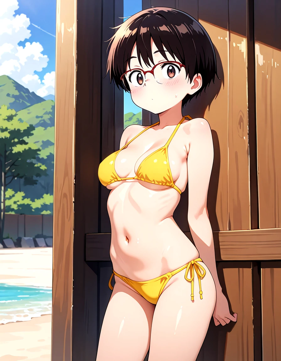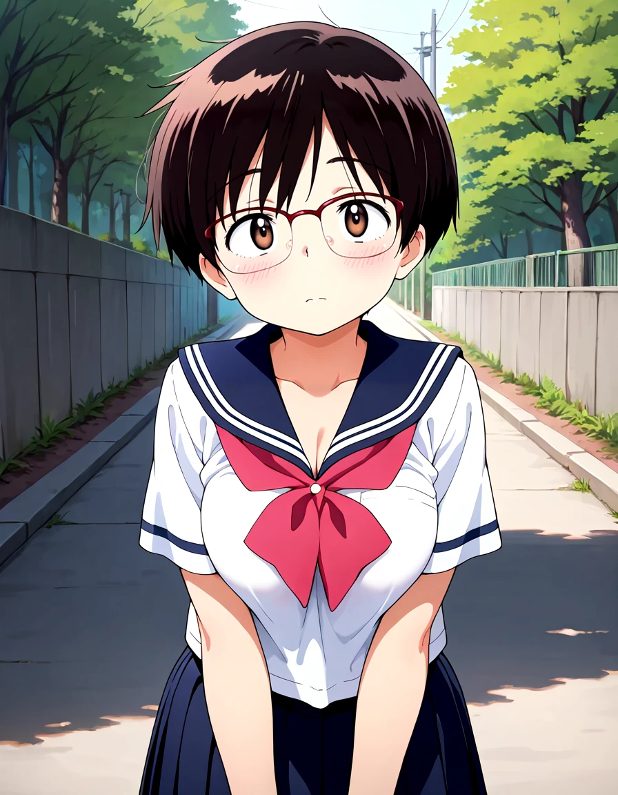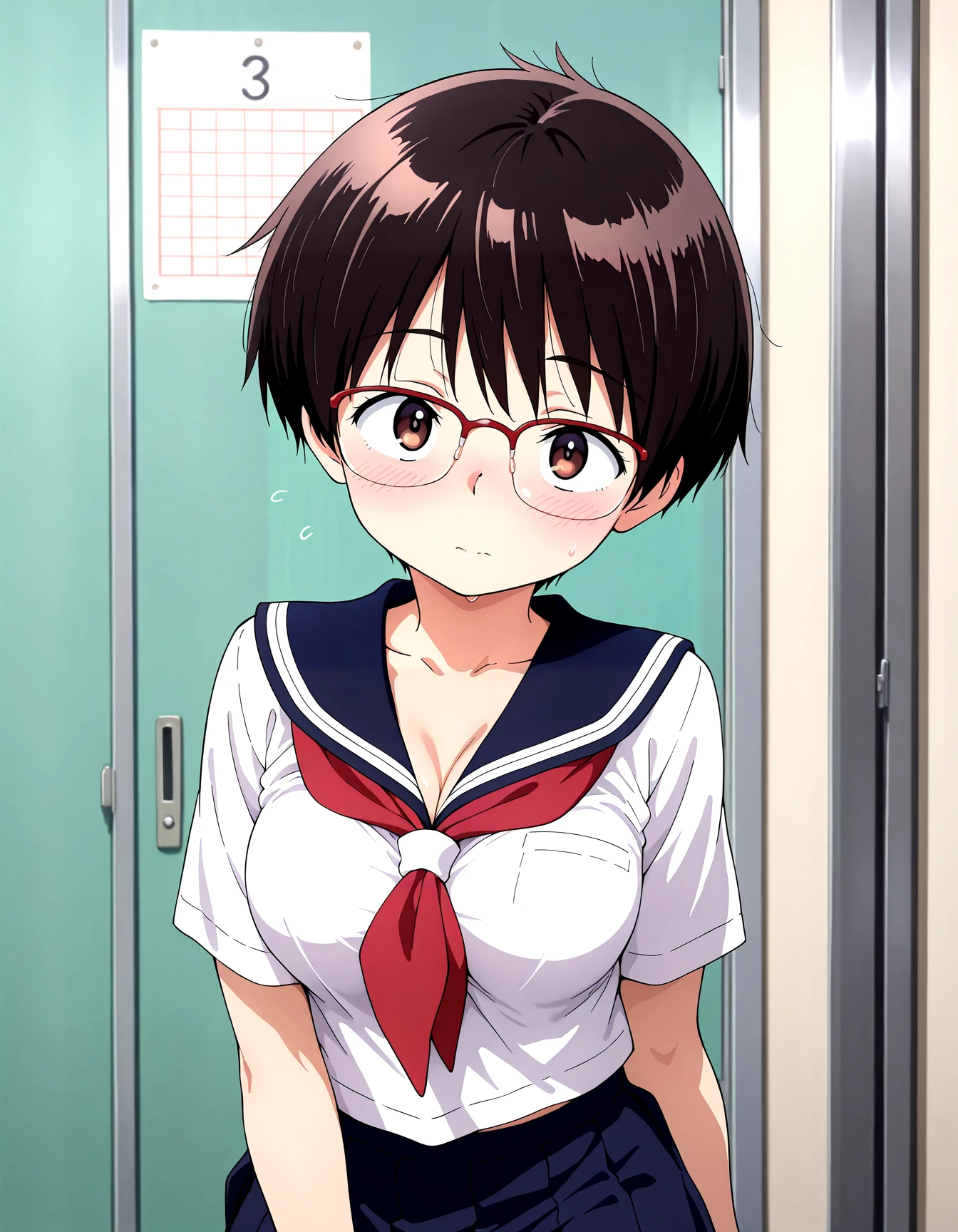 Oka, 1girl, short hair, brown hair, black hair, brown eyes, glasses, medium breast