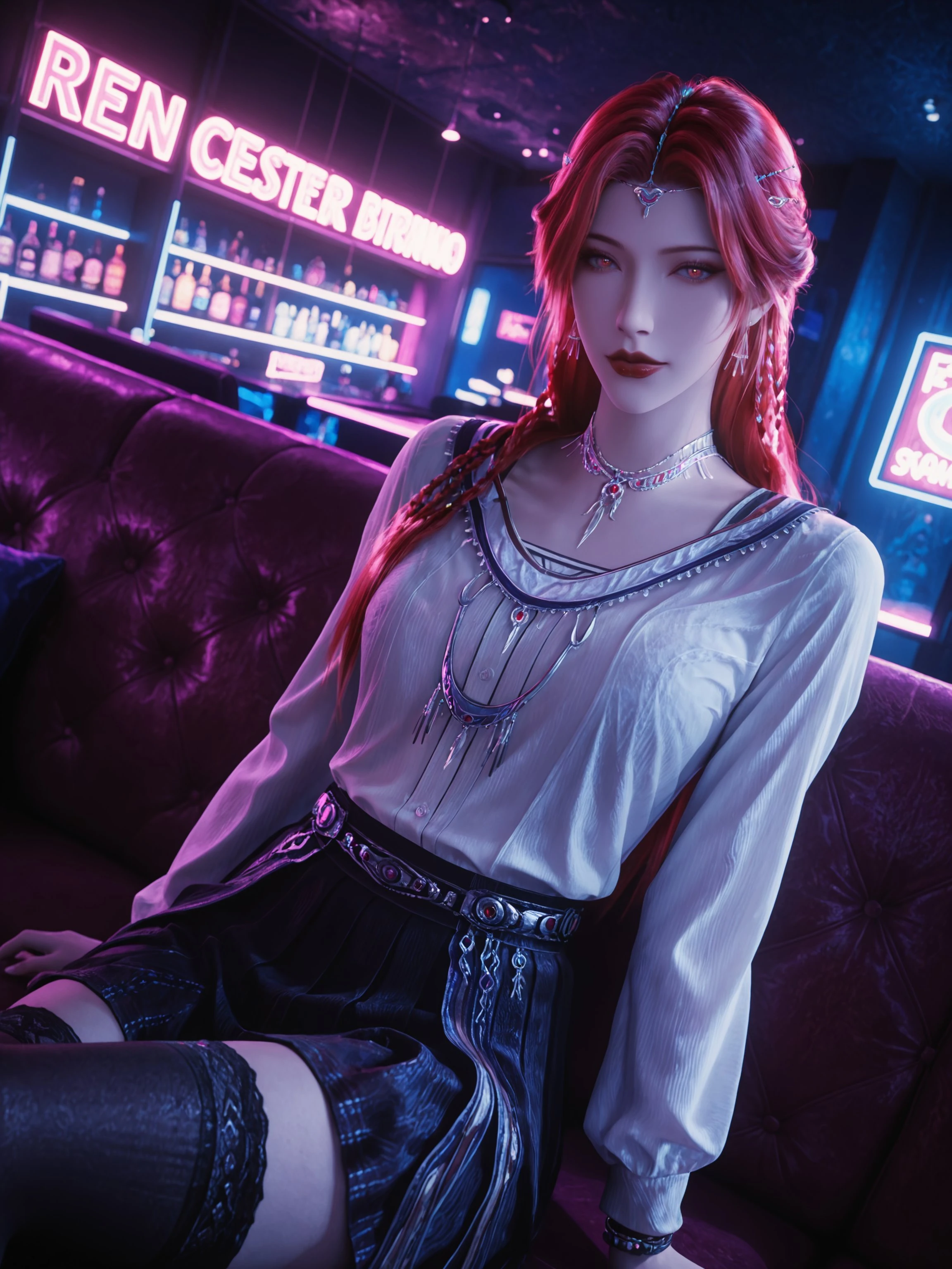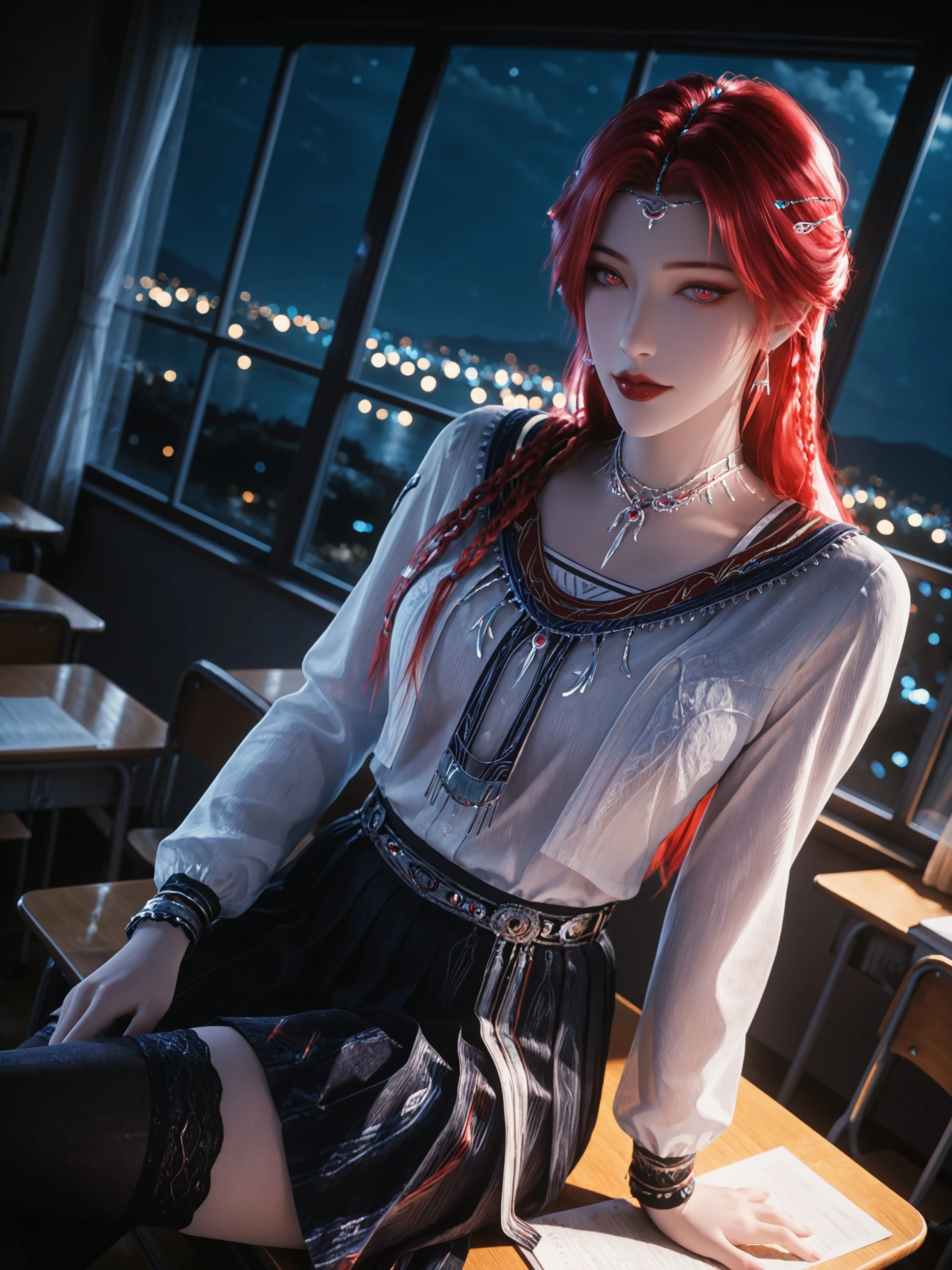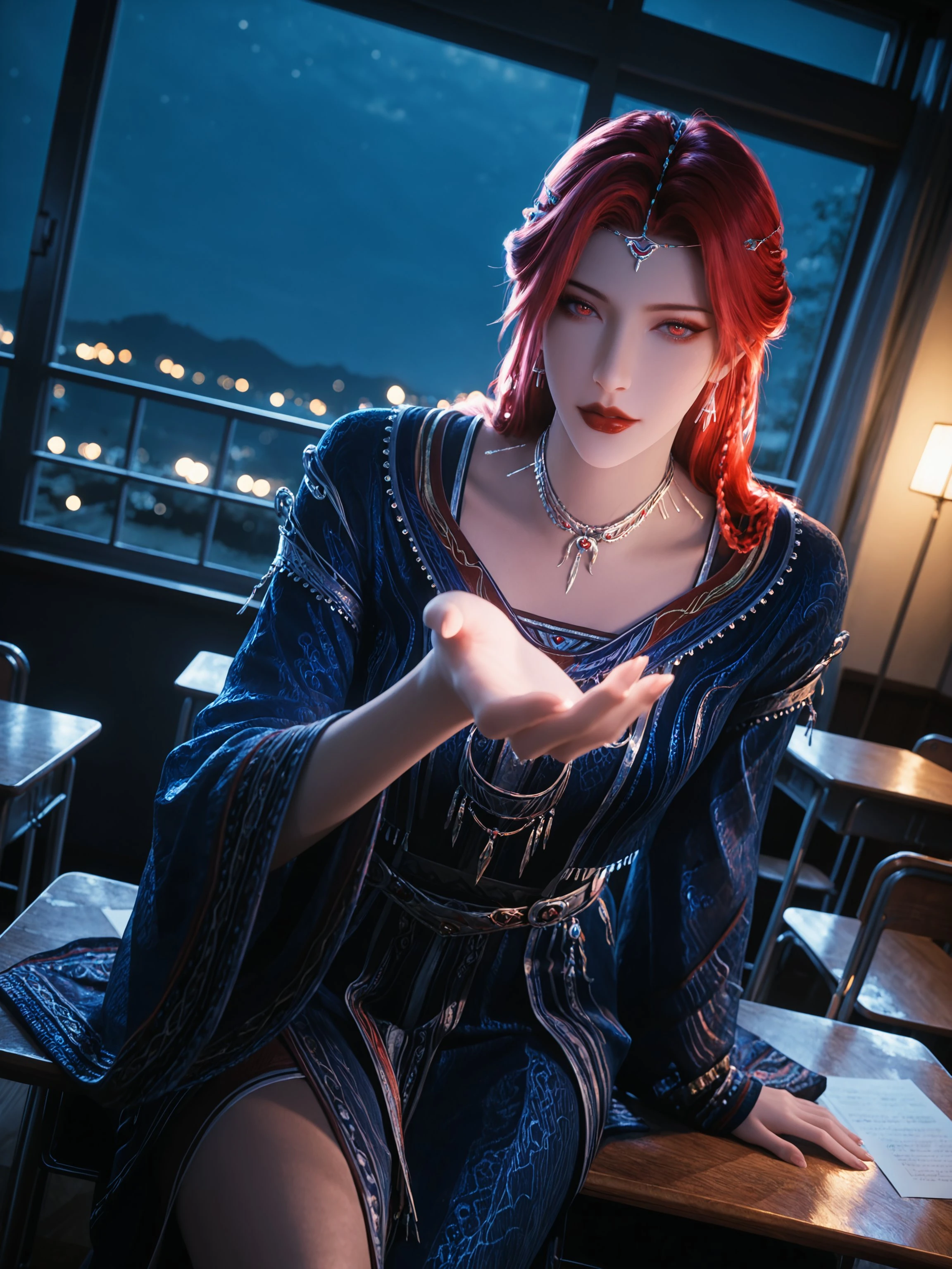 1girl, solo, jewelry, dress, long sleeves, wide sleeves, necklace, long hair, red hair, red lips, braid, earrings, blue dress,