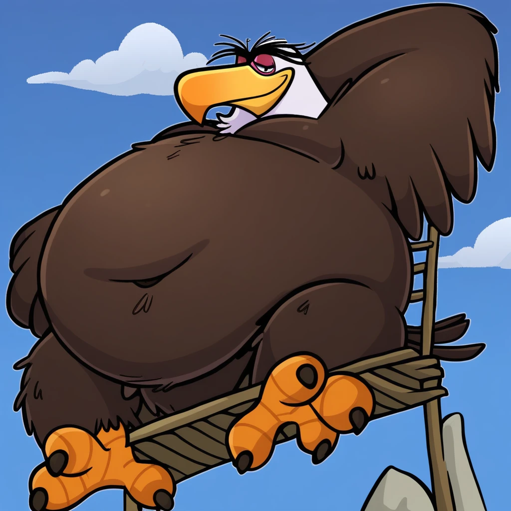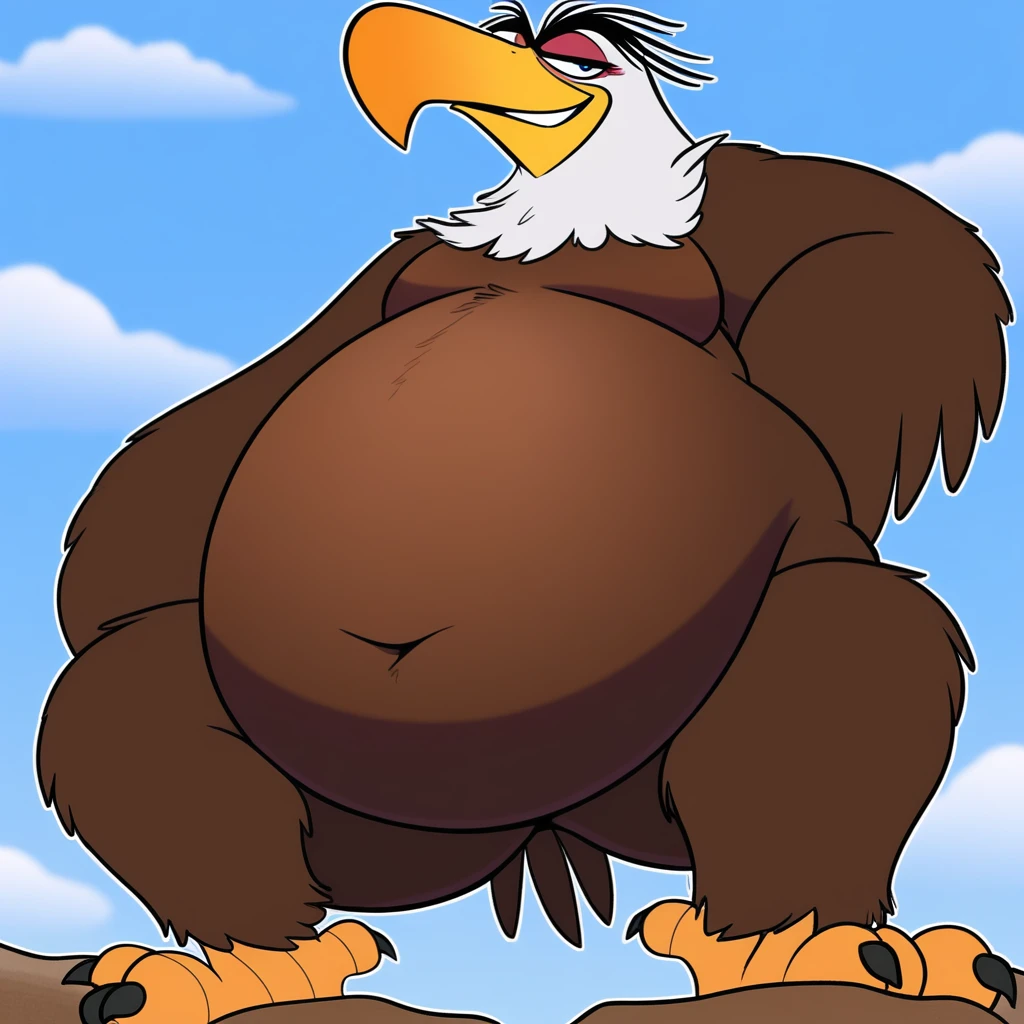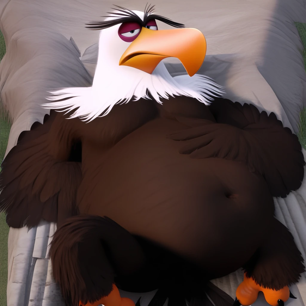 Tags: Mighty Eagle, brown feathers, feathers, bird, eagle, purple eyelids, feathered hands, big feathered hands, bird tail, winged arms, white head, white head feathers, feathered head, tired, eyebags, small pupils, white sclera, large eyebrows, large beak, long yellow beak, short legs, large feet, talons, obese, big belly