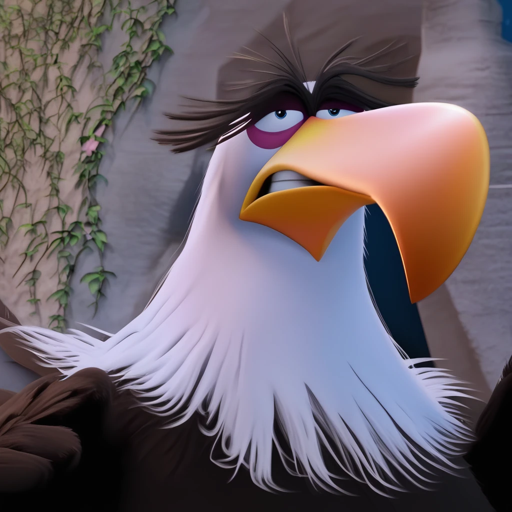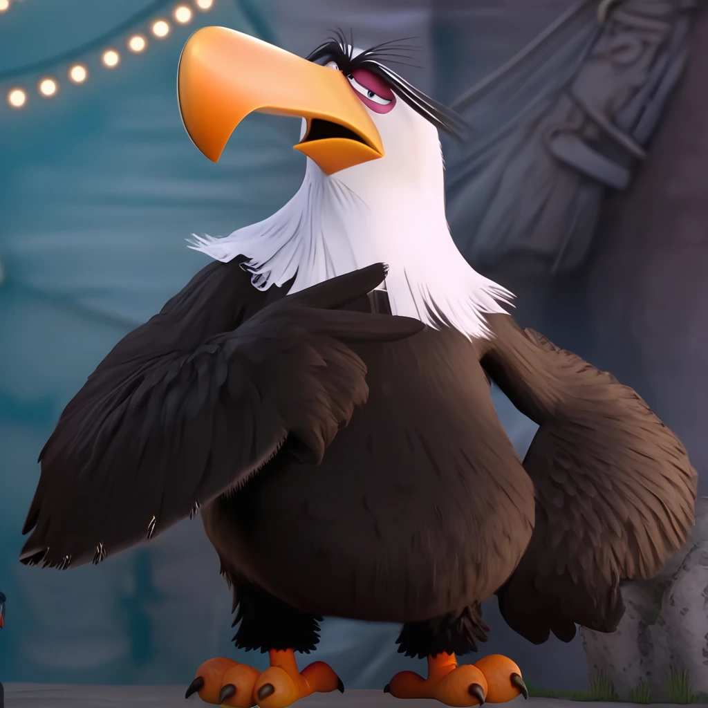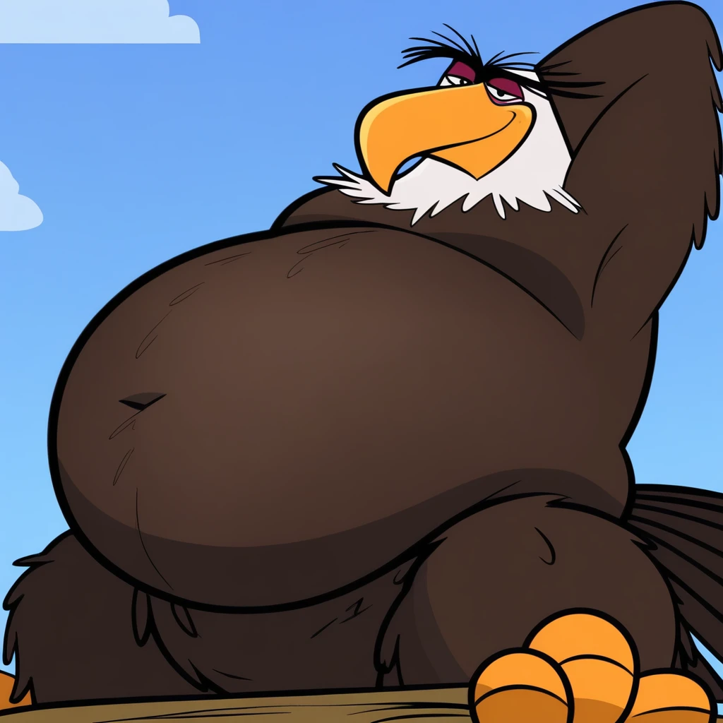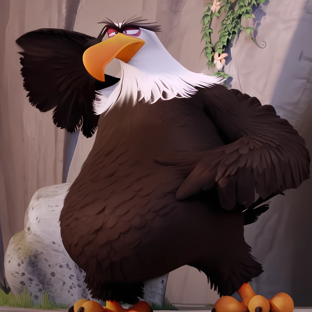 Tags: Mighty Eagle, brown feathers, feathers, bird, eagle, purple eyelids, feathered hands, big feathered hands, bird tail, winged arms, white head, white head feathers, feathered head, tired, eyebags, small pupils, white sclera, large eyebrows, large beak, long yellow beak, short legs, large feet, talons, obese, big belly
