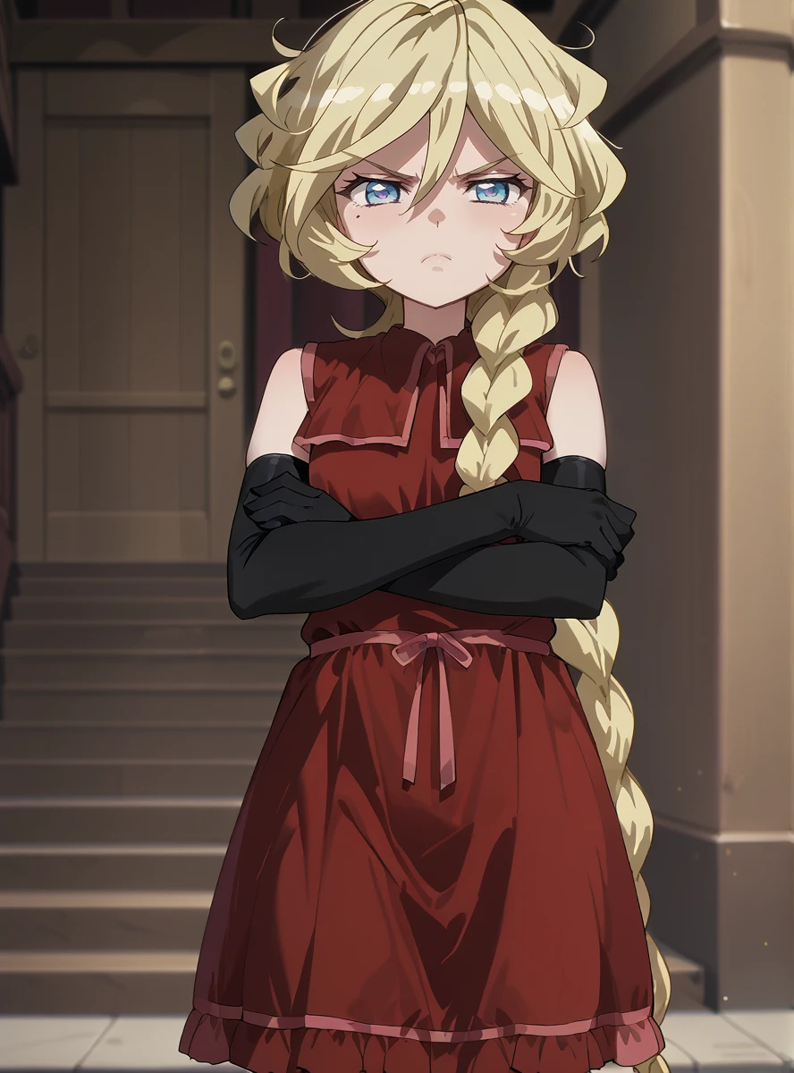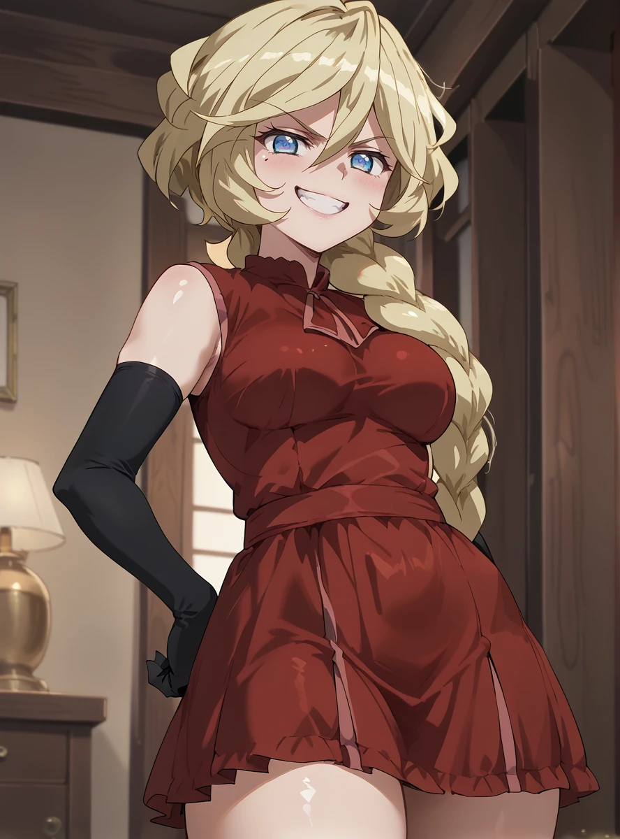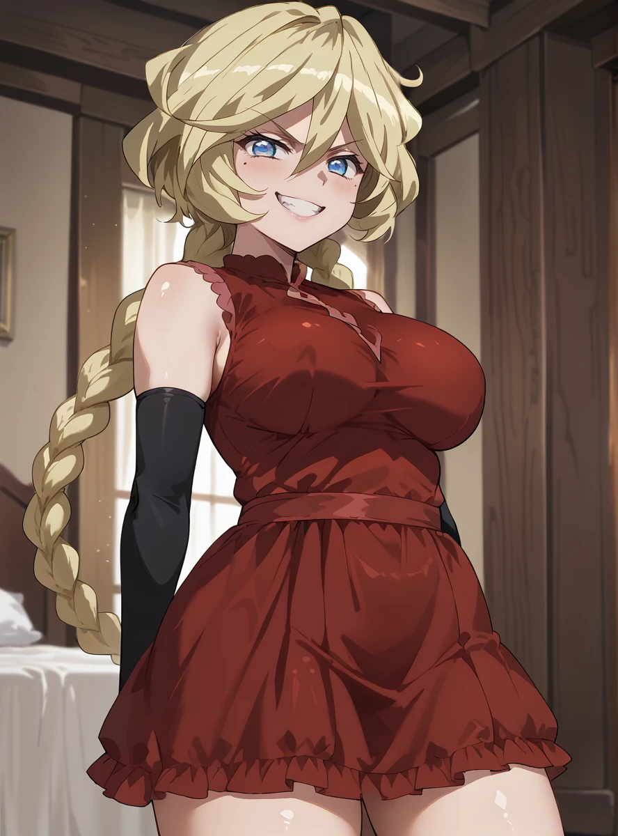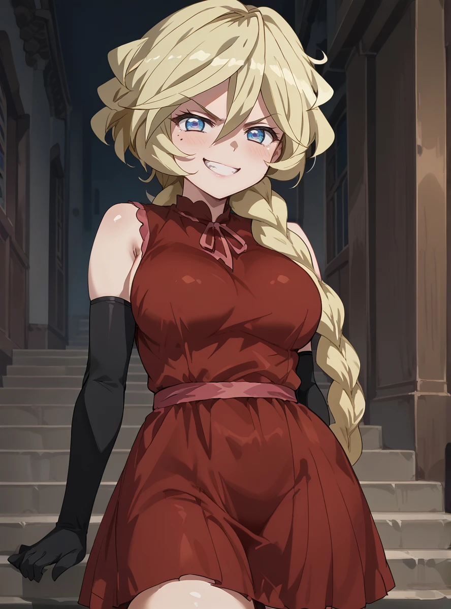 1girl, blonde hair, braid, mole, blue eyes, shiny hair, braided ponytail red dress, elbow gloves, sleeveless,
