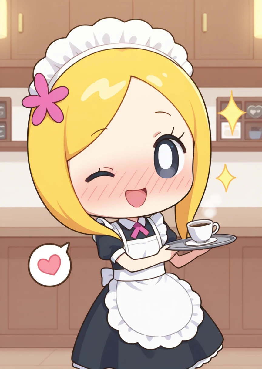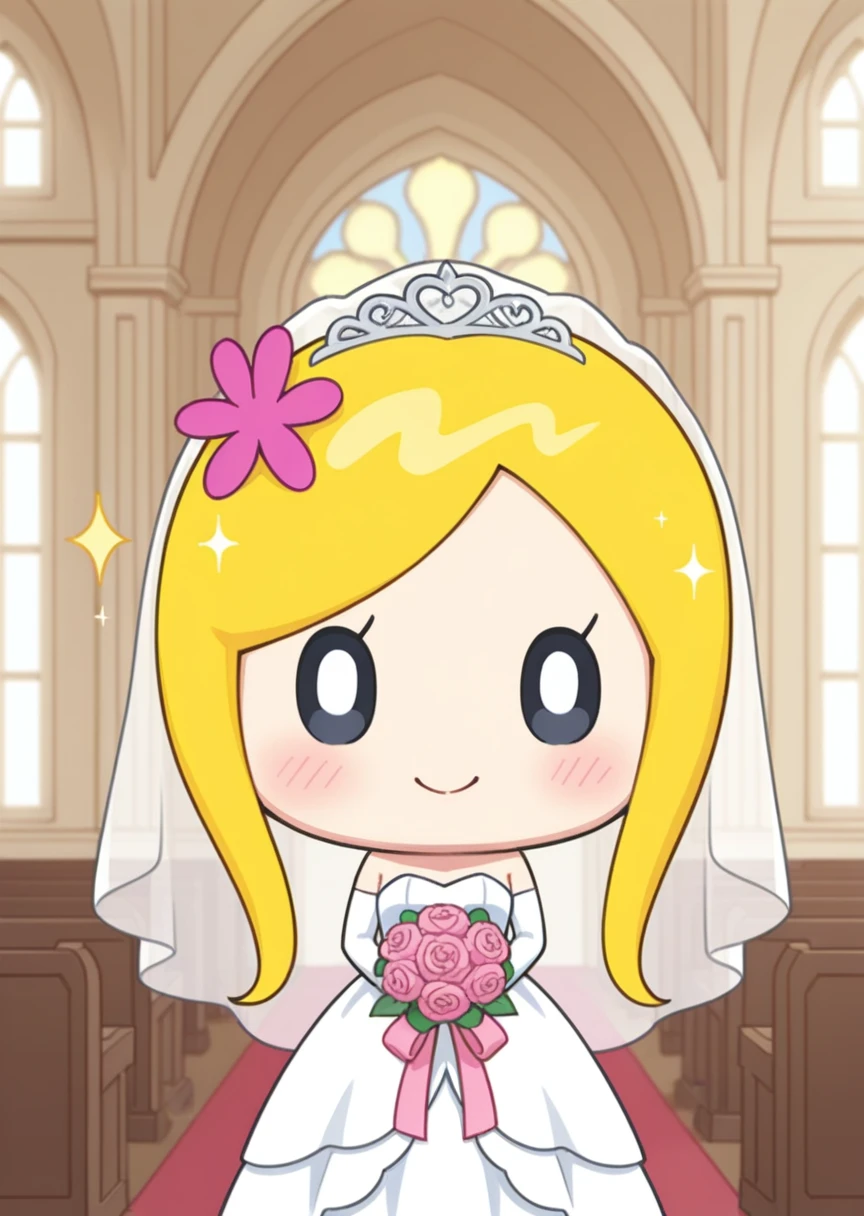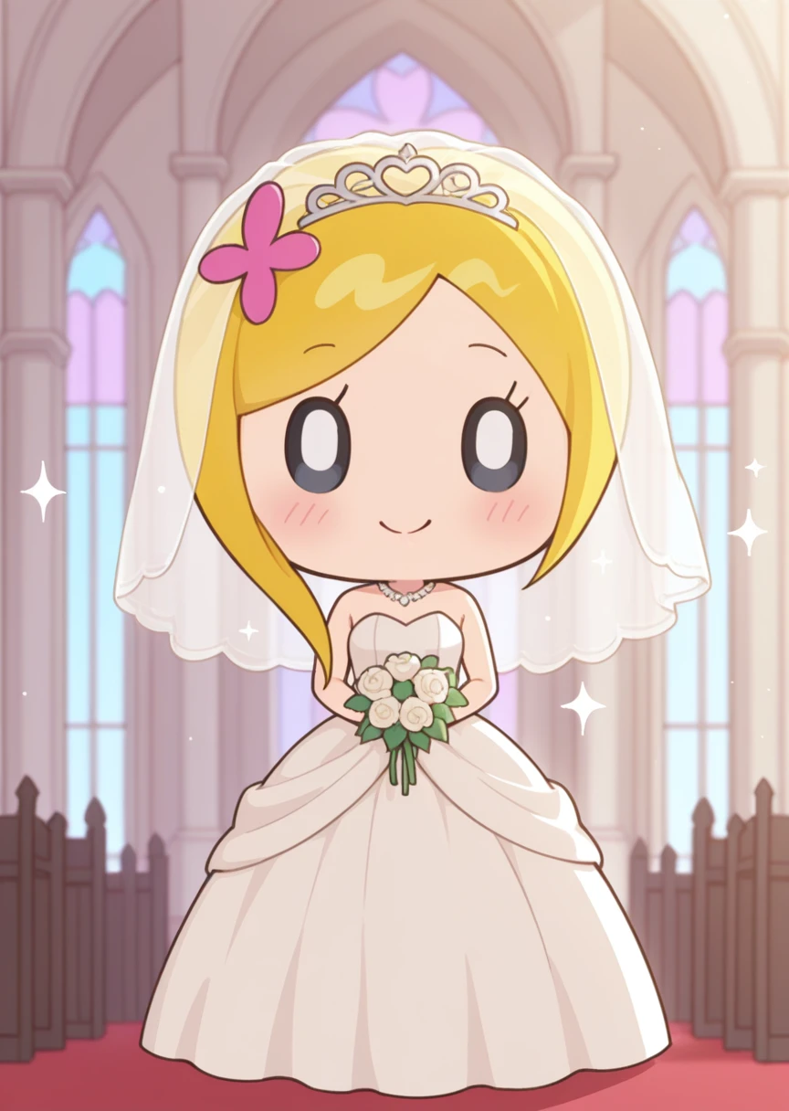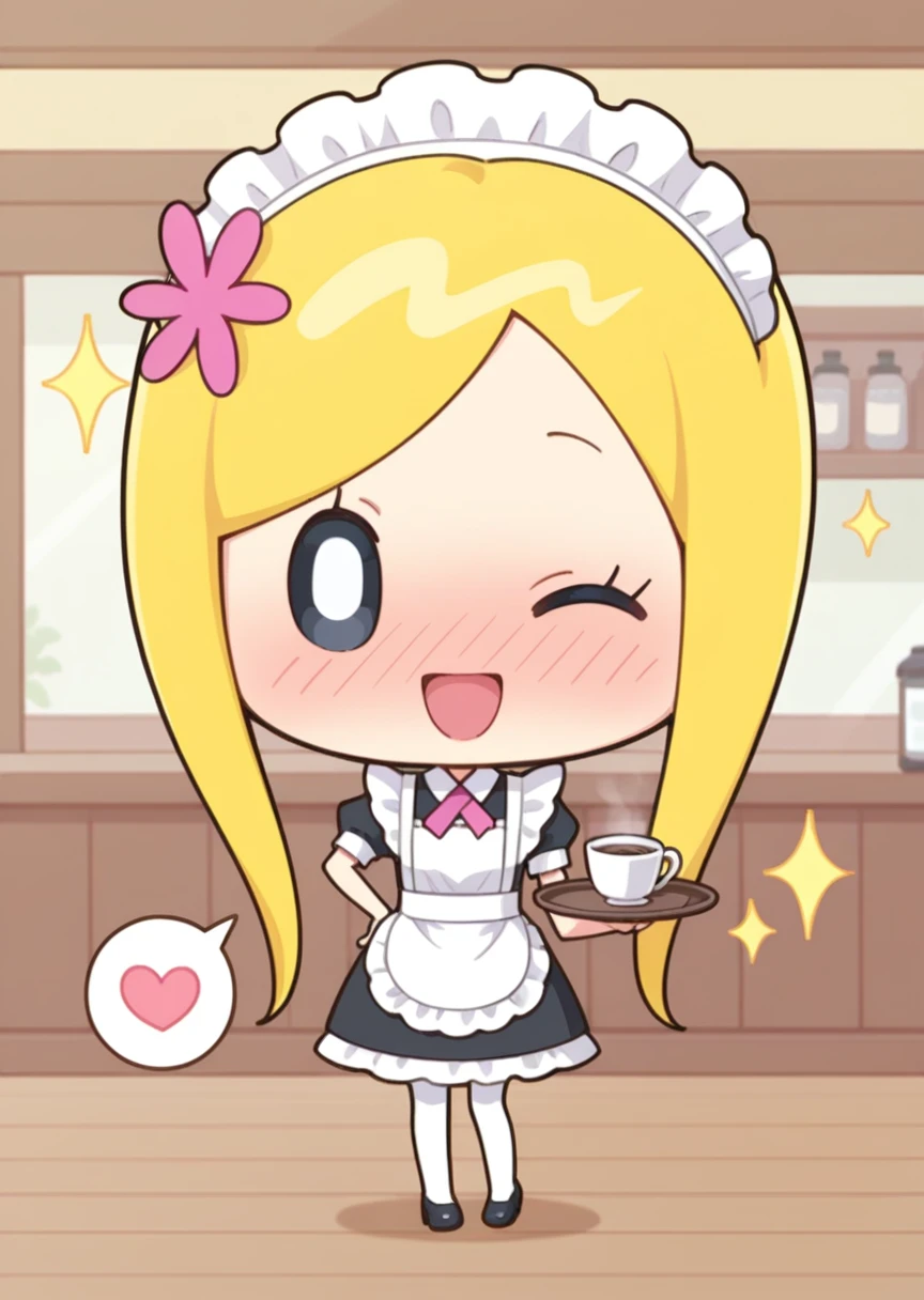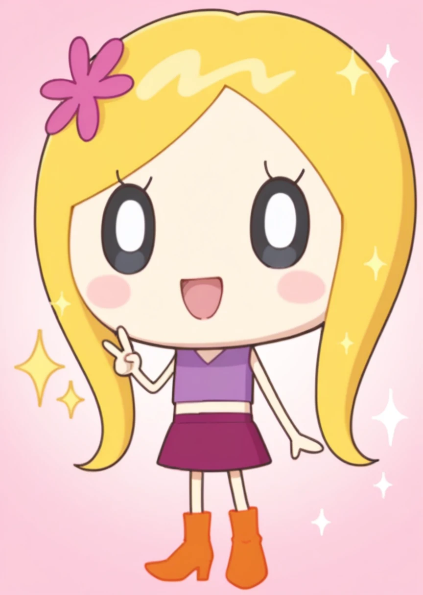 prompts: dazzilitchi, blonde hair, dot eyes, hair ornament, purple tank top, red skirt, orange footwear, sparkle, chibi,