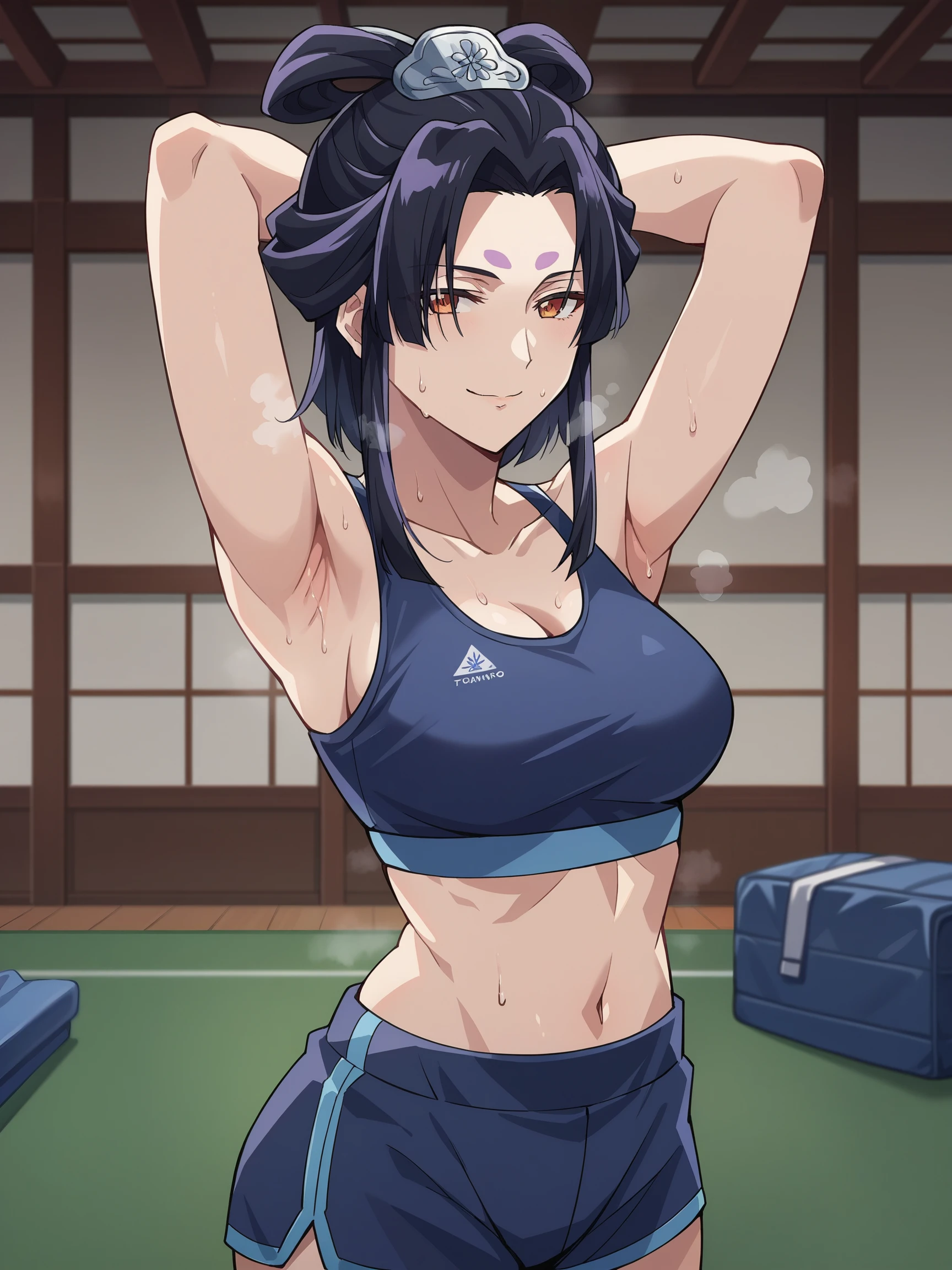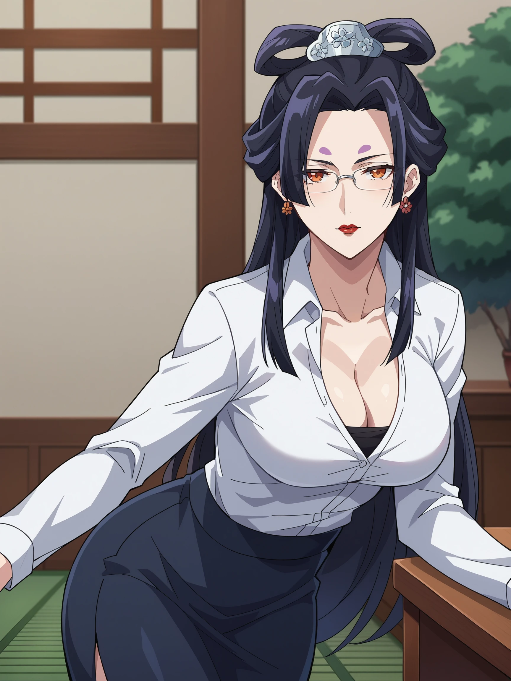 J0ka, orange eyes, black hair, long hair, half updo, hair rings, parted bangs, sidelocks, facial mark, hair ornament, red lipstick,