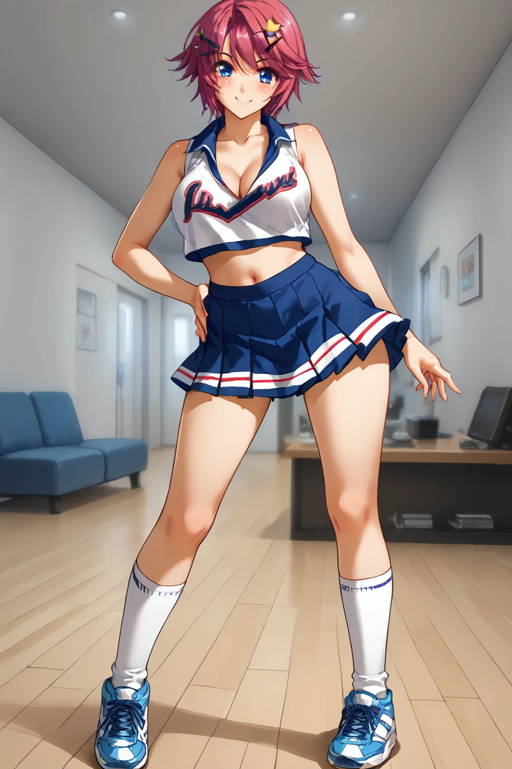 avel, cleavage, bare shoulders,collarbone, pleated skirt, sleeveless, socks,midriff,miniskirt, blue skirt, crop top, sneakers, contrapposto, cheerleader,