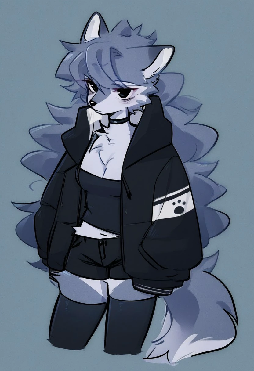 jacket, cleavage, choker, thighhighs, shorts