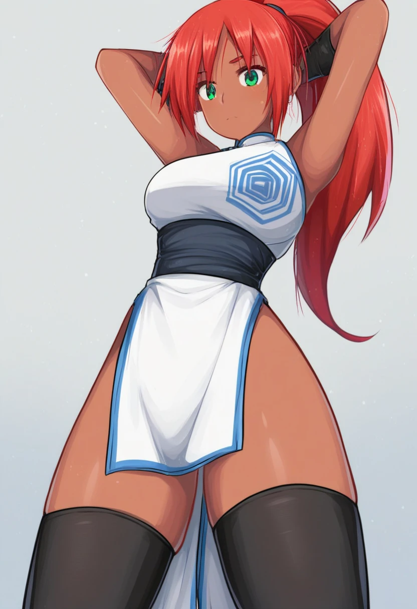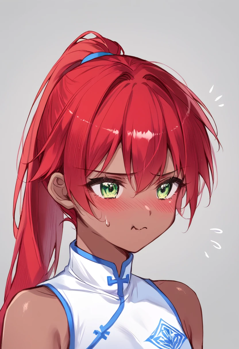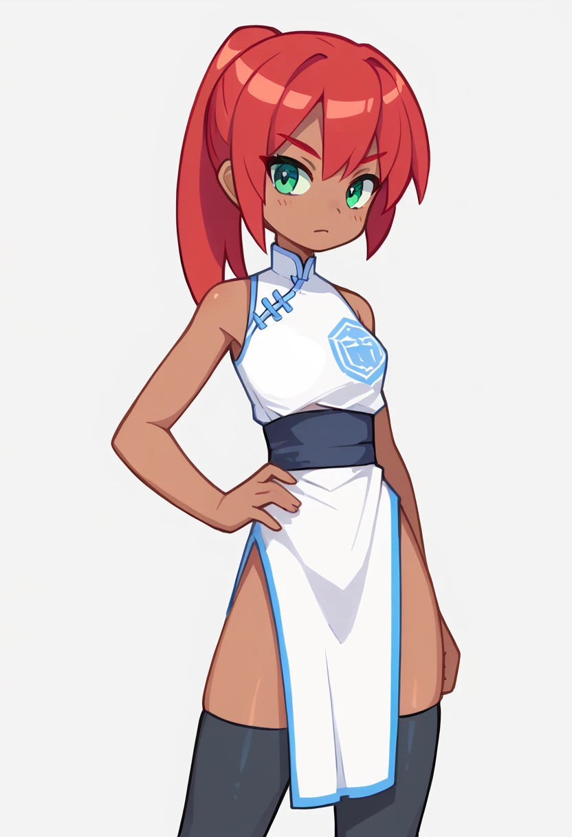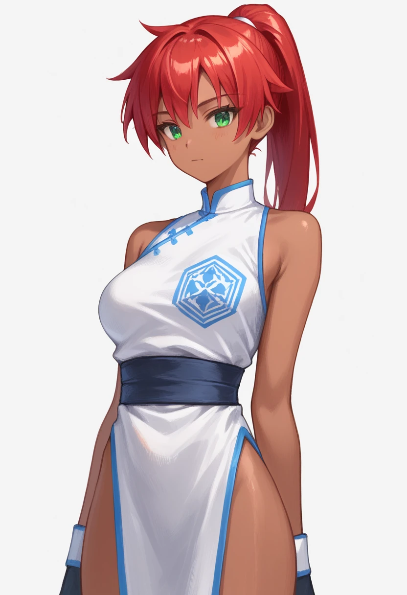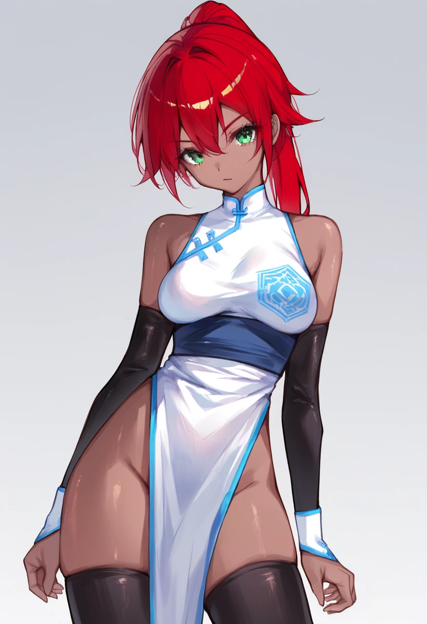 red hair, green eyes, ponytail, dark-skinned female, white chinese dress, double-parted_bangs