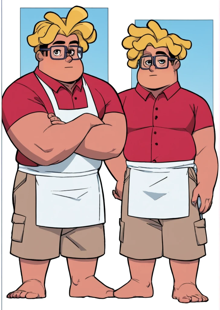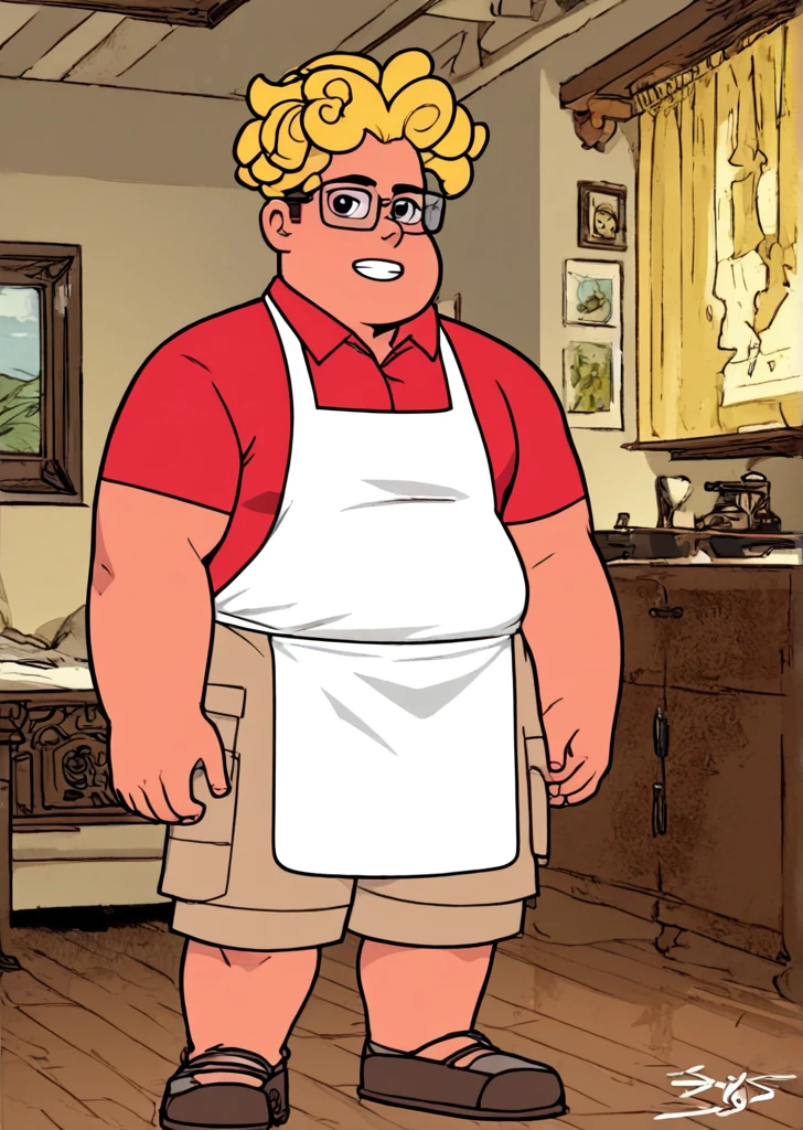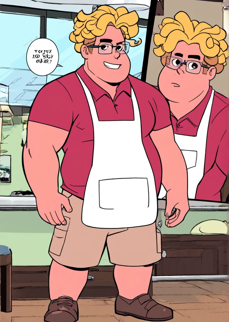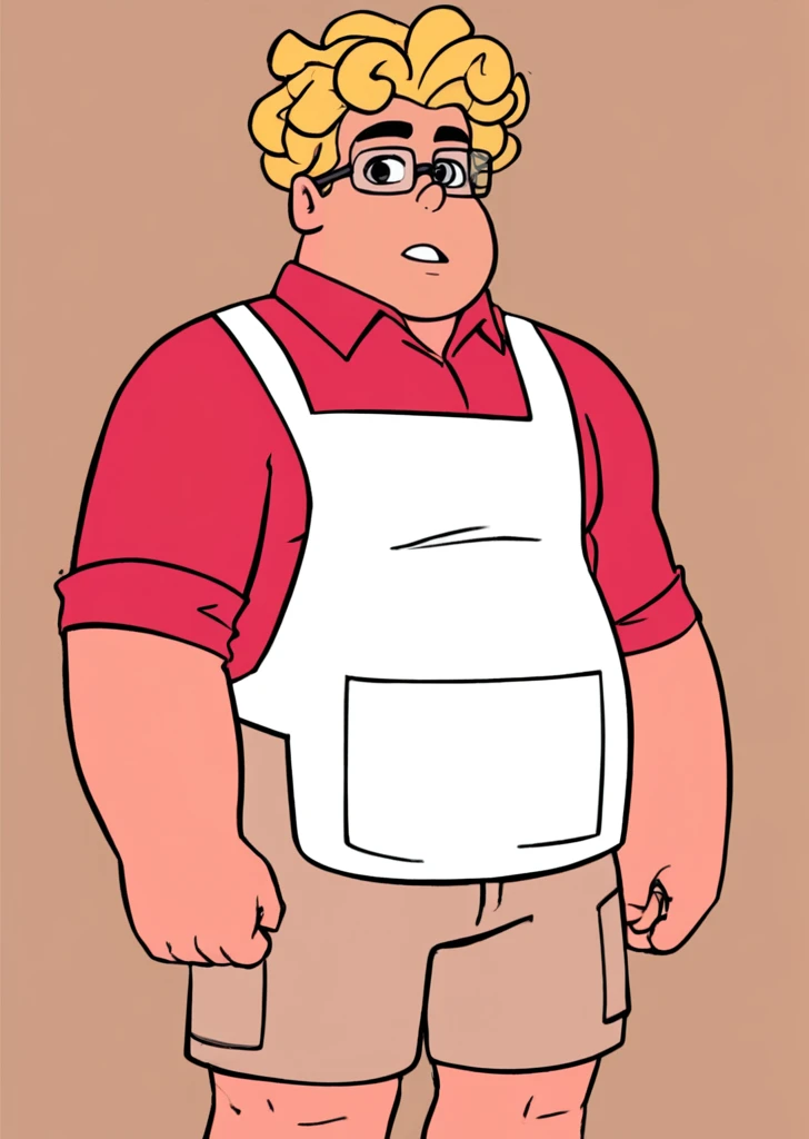 ronfryman, ronaldo fryman, long curled hair, blonde, chubby, masculine, male, glasses, fat,